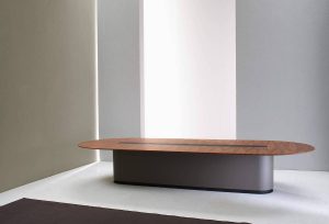 Spazio is a comprehensive and flexible table system available in a variety of sizes and finishes which can also be tailored as required. Cleverly engineered to provide the smallest footprint possible, the top is supported by a uniquely elegant and robust base that matches the round, D-End or rectangular top shape.