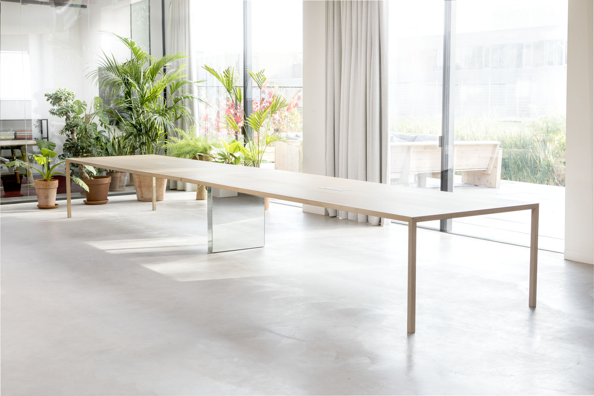 The seemingly impossible Slim and Slim+ collection of tables are constructed using an innovative steel sandwich construction with a lightweight honeycomb-structure core. This unique composite material enables the table to be constructed at great lengths while retaining its slim line profile and remaining lightweight. The inherent properties of the different materials have been used as honestly as possible: metal for its strength and timber for its tactile and aesthetic qualities.