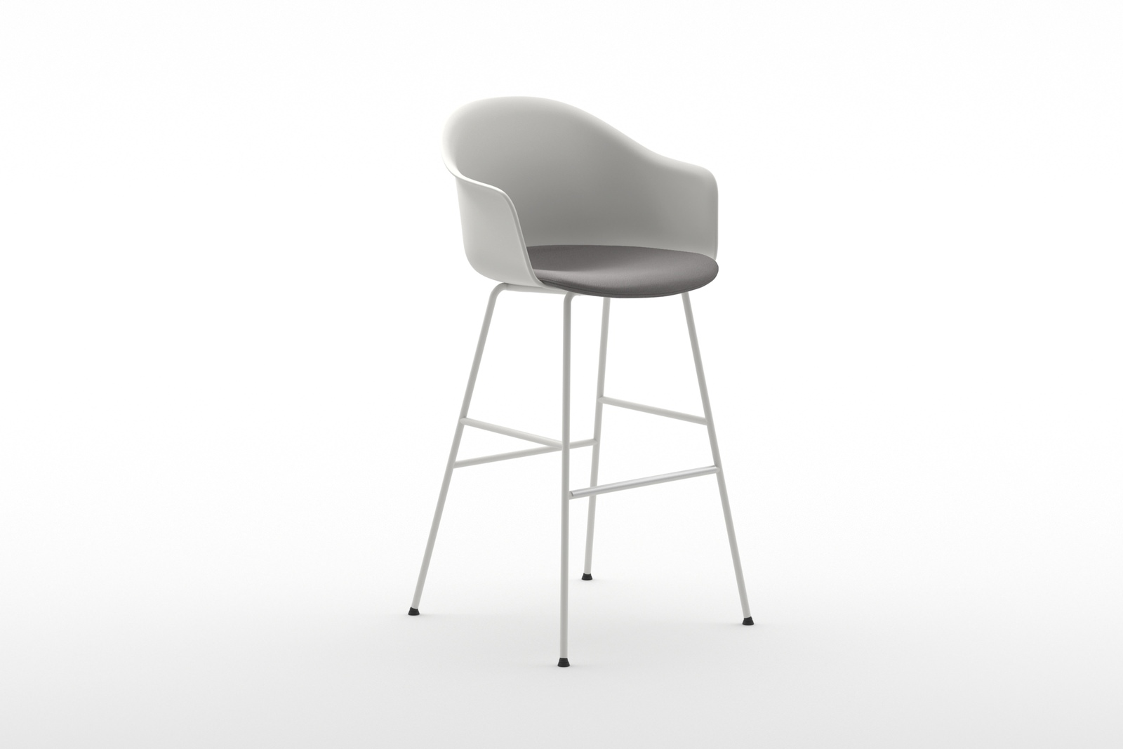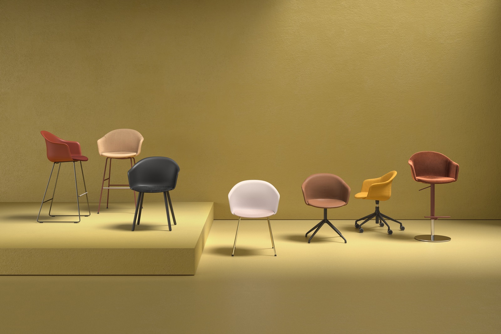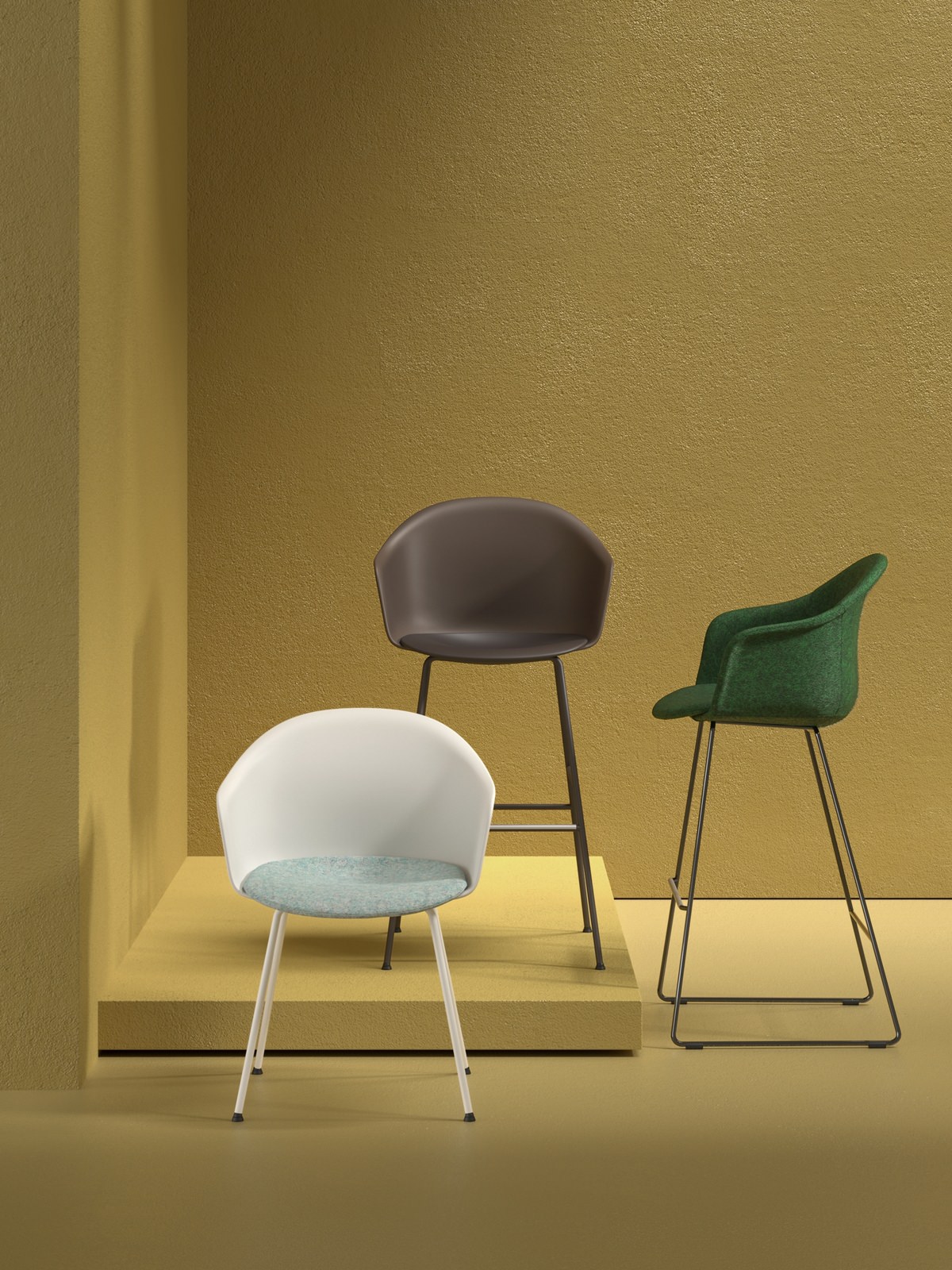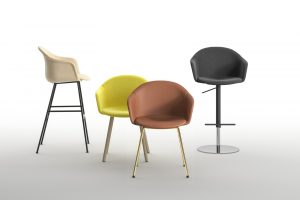 The polypropylene shell produced from a single mould is accompanied by a choice of seat inserts made of timber, upholstered or in tone-on-tone polypropylene in a slightly deeper shade. Màni Armshell, is also available in a fully upholstered version, which can be combined with ten different chair or stool bases featuring wooden legs, metal sled base, 4-way swivel base or with castors.
