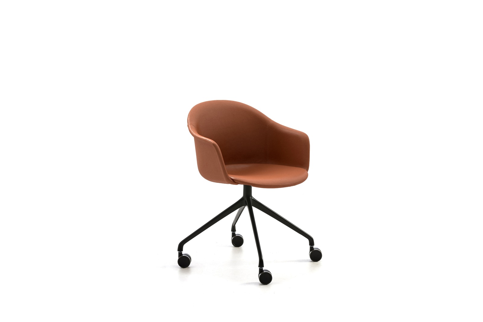 The polypropylene shell produced from a single mould is accompanied by a choice of seat inserts made of timber, upholstered or in tone-on-tone polypropylene in a slightly deeper shade. Màni Armshell, is also available in a fully upholstered version, which can be combined with ten different chair or stool bases featuring wooden legs, metal sled base, 4-way swivel base or with castors.