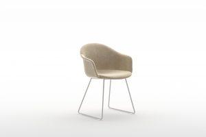 The polypropylene shell produced from a single mould is accompanied by a choice of seat inserts made of timber, upholstered or in tone-on-tone polypropylene in a slightly deeper shade. Màni Armshell, is also available in a fully upholstered version, which can be combined with ten different chair or stool bases featuring wooden legs, metal sled base, 4-way swivel base or with castors.