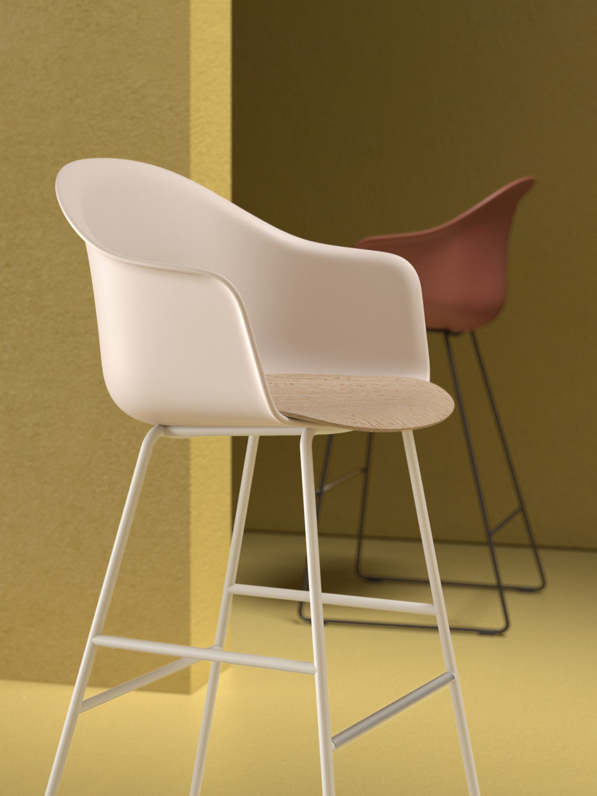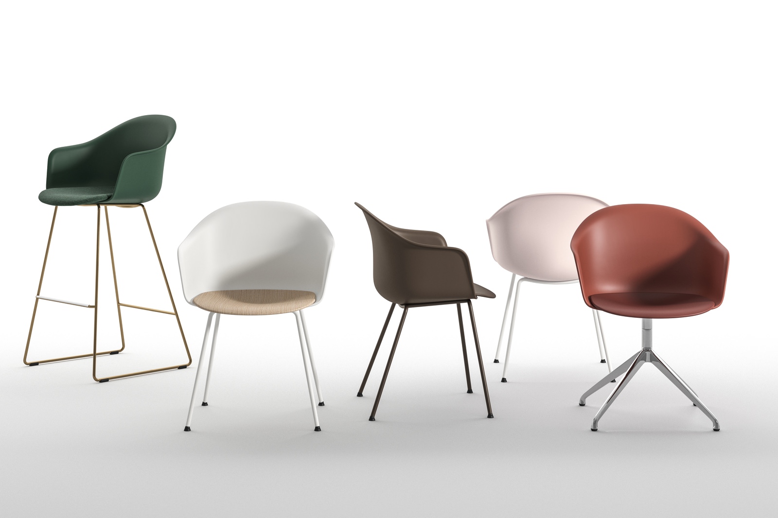 The polypropylene shell produced from a single mould is accompanied by a choice of seat inserts made of timber, upholstered or in tone-on-tone polypropylene in a slightly deeper shade. Màni Armshell, is also available in a fully upholstered version, which can be combined with ten different chair or stool bases featuring wooden legs, metal sled base, 4-way swivel base or with castors.