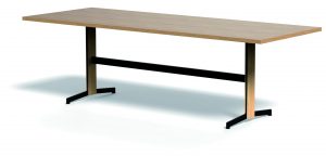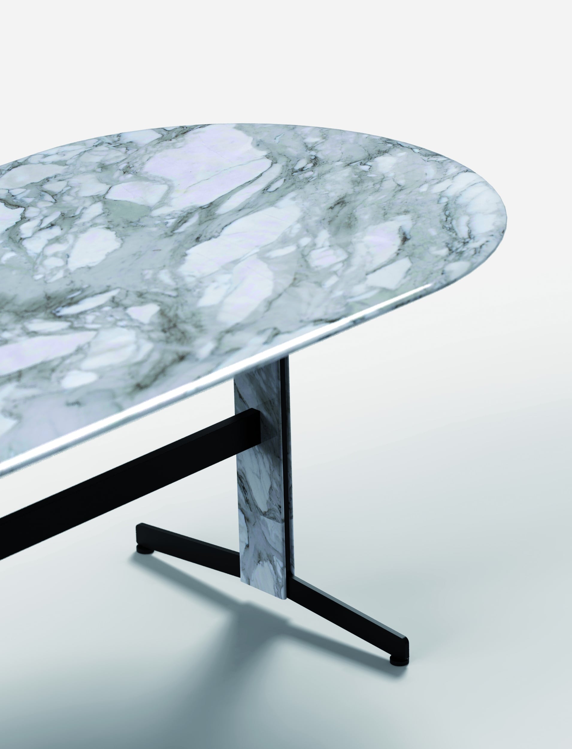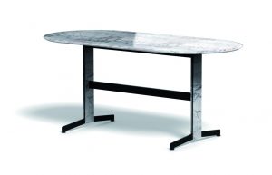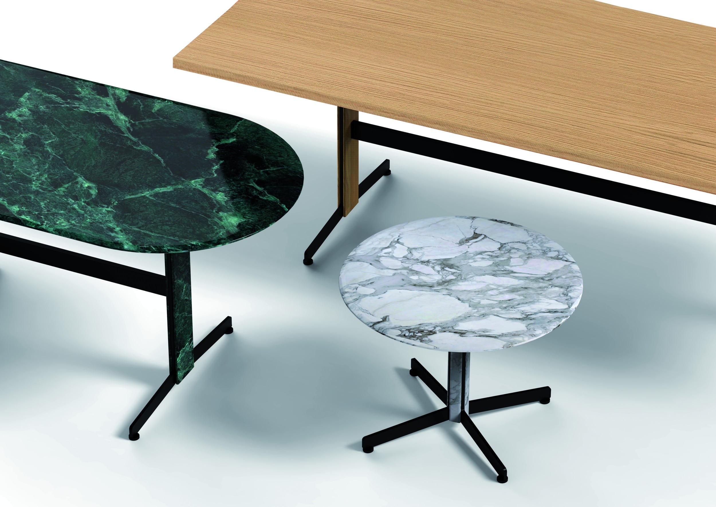 Piana tables are available in various sizes and shapes and are supported by steel 4-star or trestle frames. A versatile product, PianaÕs aesthetic changes dramatically depending on the shape and finish chosen. The round marble table conveys a vaguely retro style while the rectangular marble option, takes on a more classic, majestic appearance. Wood offers warmth to the versions that favour this material, while the combination of steel and HPL creates a simple, linear table, ideal for the workplace.