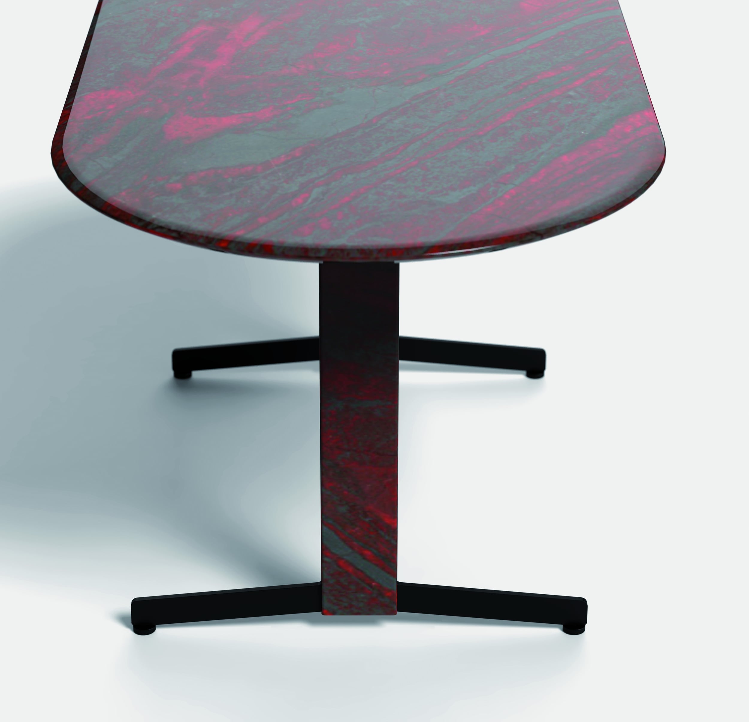 The Piana table collection has been designed to celebrate the material wholeheartedly, flouting the usual construction logic that involves applying different materials to the top and base of a table structure. Exploring the theme of materiality, colours and finishes extend throughout the entire structure, from the horizontal top to the vertical support, resulting in an object that is integral and solid with an almost totally mono-material look.