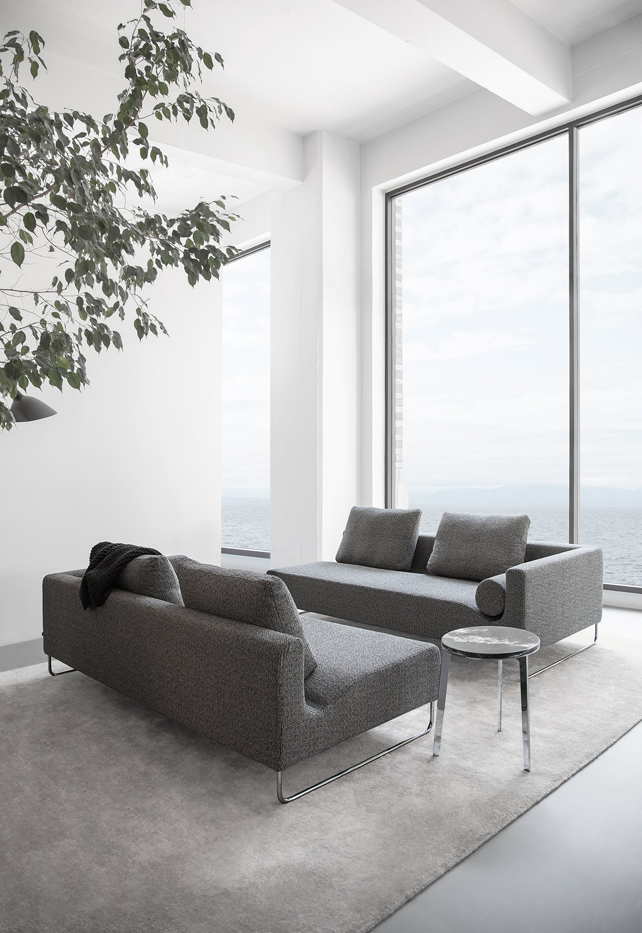Single-arm and armless pieces are available in various sizes and can be combined to make an almost infinite number of configurations. Steel frames are constructed to allow one piece to be suspended off another for a clean appearance. Removable covers are also available for easy cleaning or replacement.