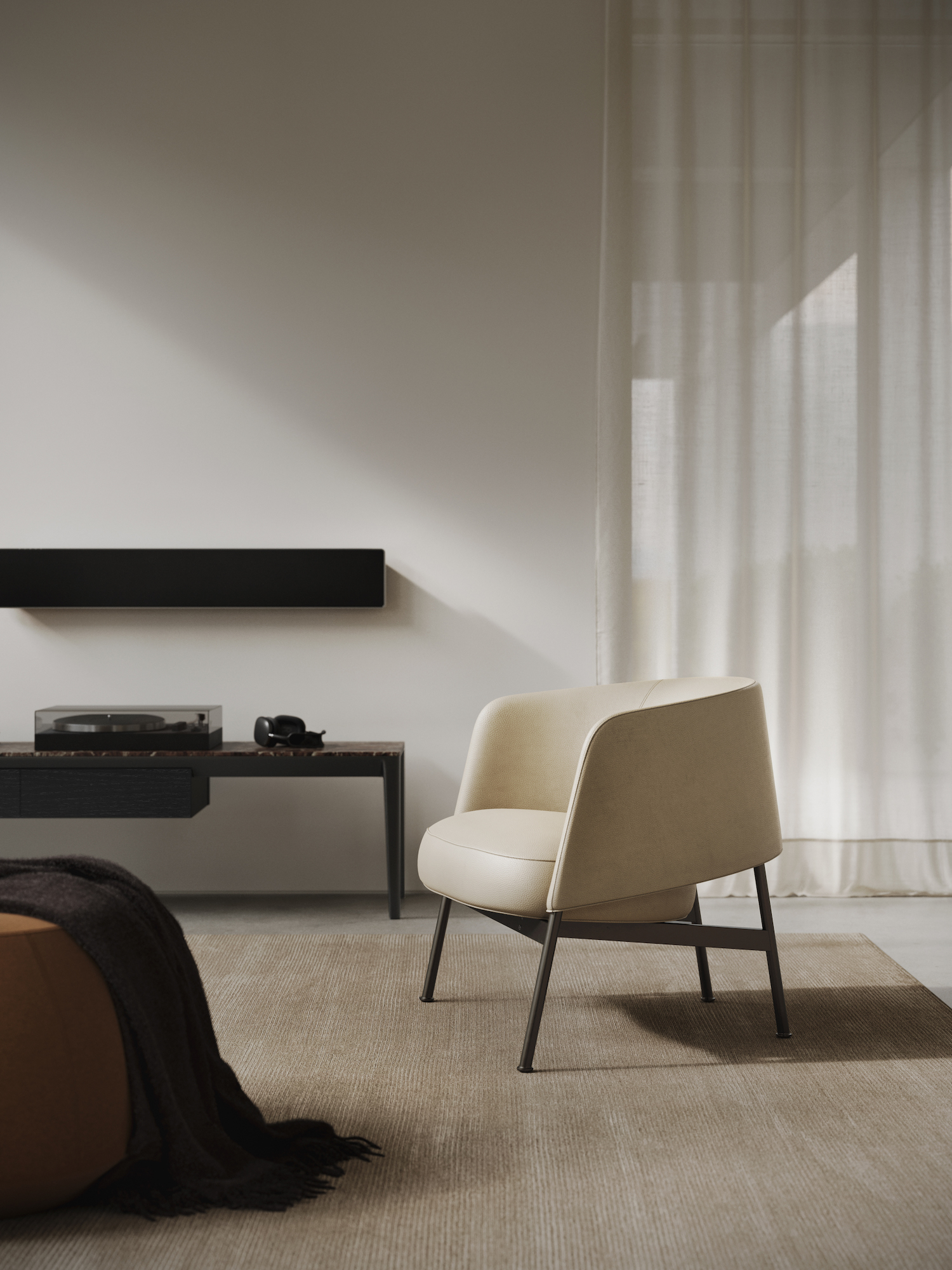 Collar Armchair is a versatile chair fit for all occasions. The crisp perimeter of the backrest wraps you in plush comfort. A generous seat rests within the nook of the back, perched on the supportive linear structure.