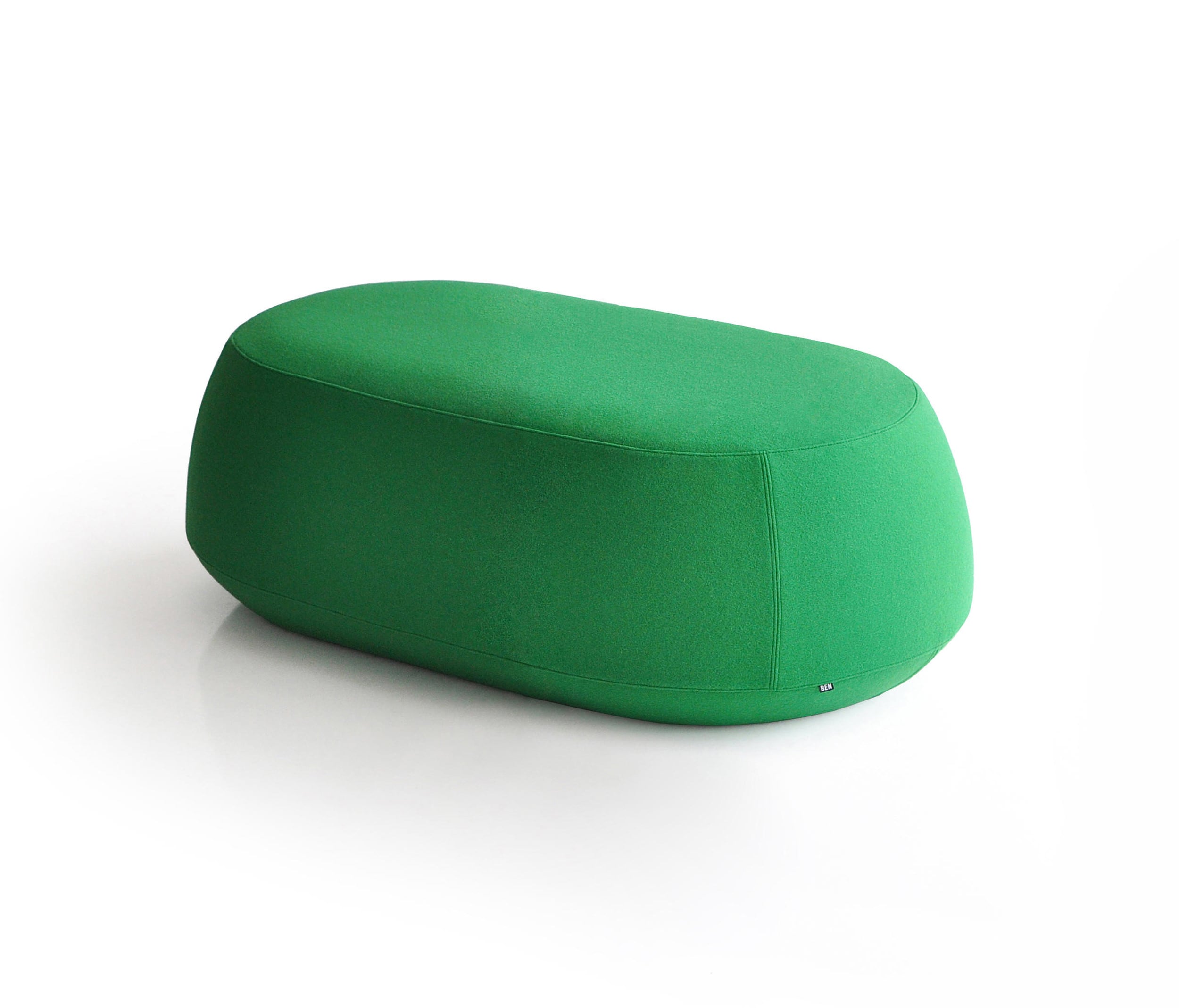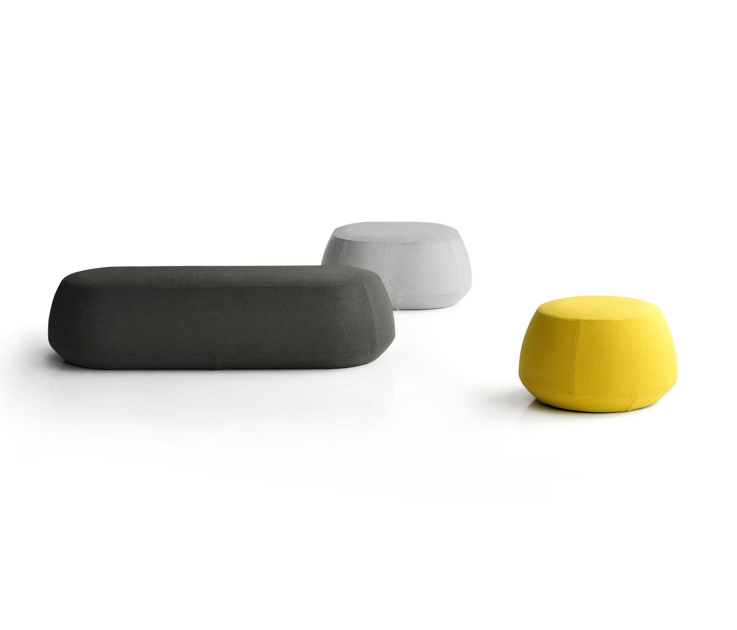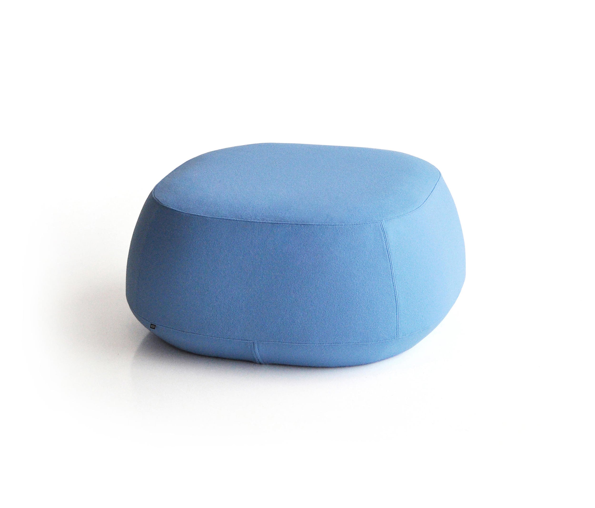 The Ile series of ottomans share the same undercut prominent on the U Turn lounge chair. This detail is not only a visual feature, lightening the look of the piece by providing foot space, but a practical one; making sitting down and standing up easier as well as preventing the occurrence of soiling caused by footwear.