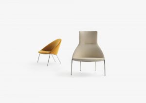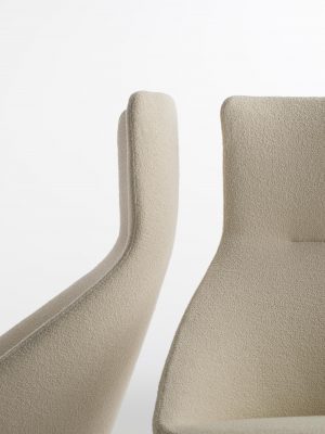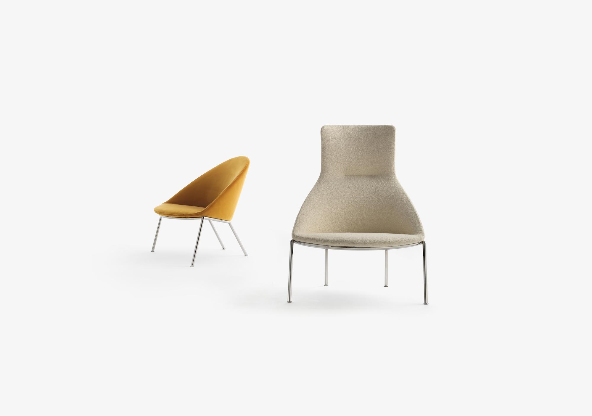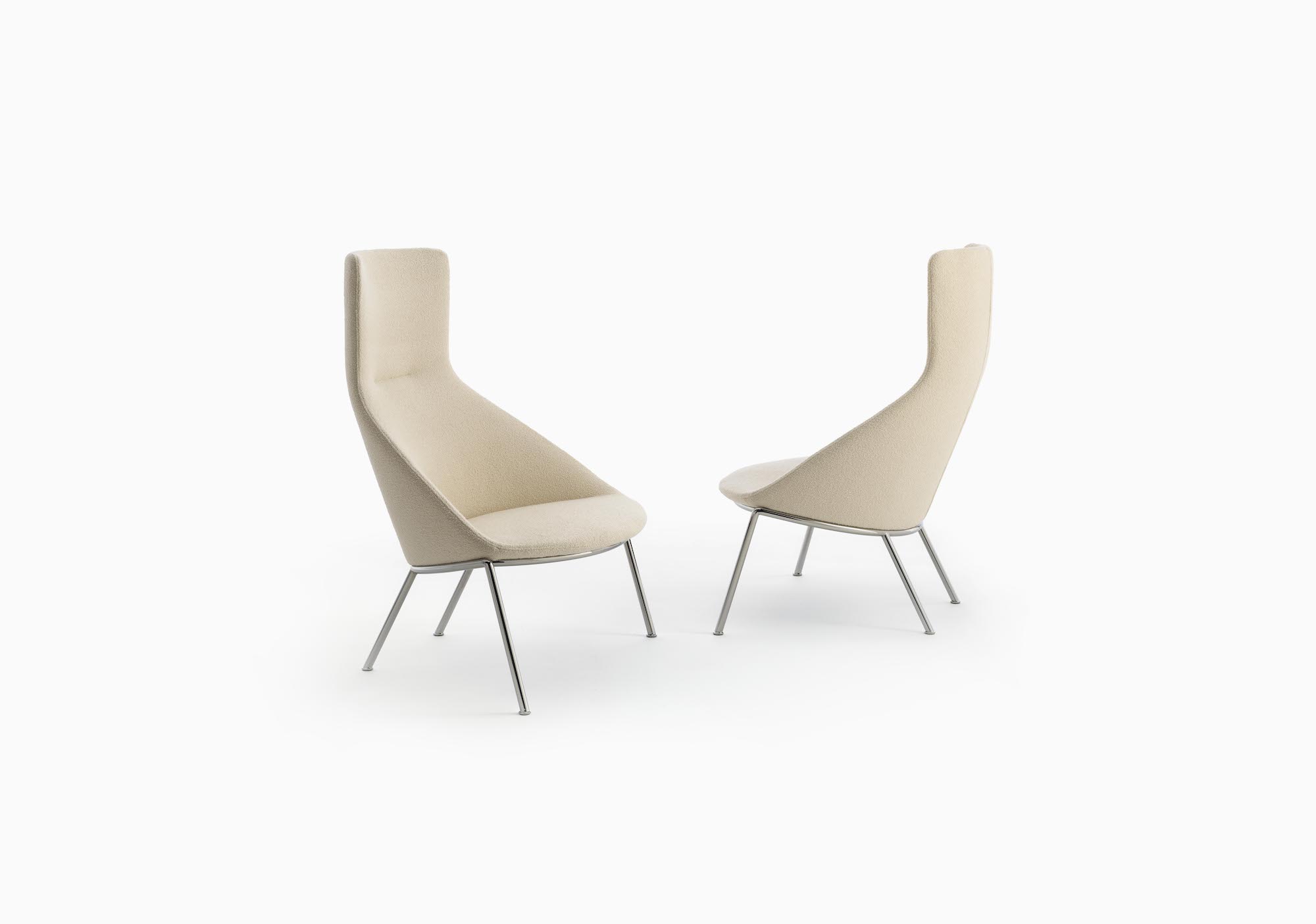Available on a timber or metal frame with two backrest heights. The high-back version implements a geometric headrest and increased upper back support.