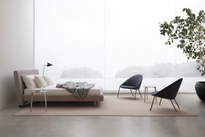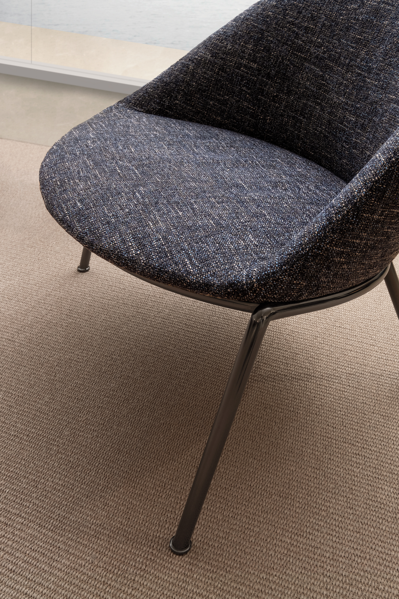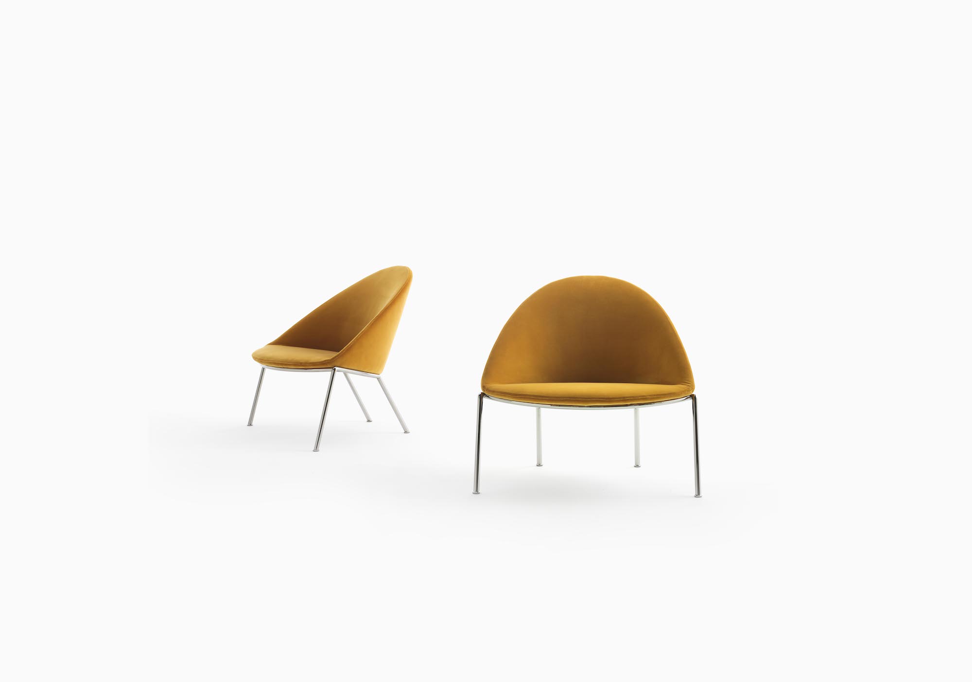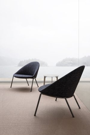 Available on a timber or metal frame with two backrest heights. The high-back version implements a geometric headrest and increased upper back support.