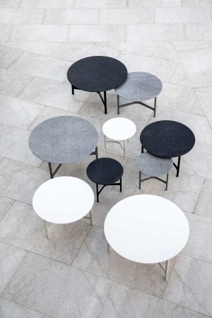 Twist can stand alone, or be combined in a cluster, as the tables is of different heights and can fit under each other. Twist is made of a lightweight frame in powder-coated aluminium and a table top in either Cane-line HI-Core, ceramic or compact laminate (HPL). Twist is easily cleaned with a damp cloth.