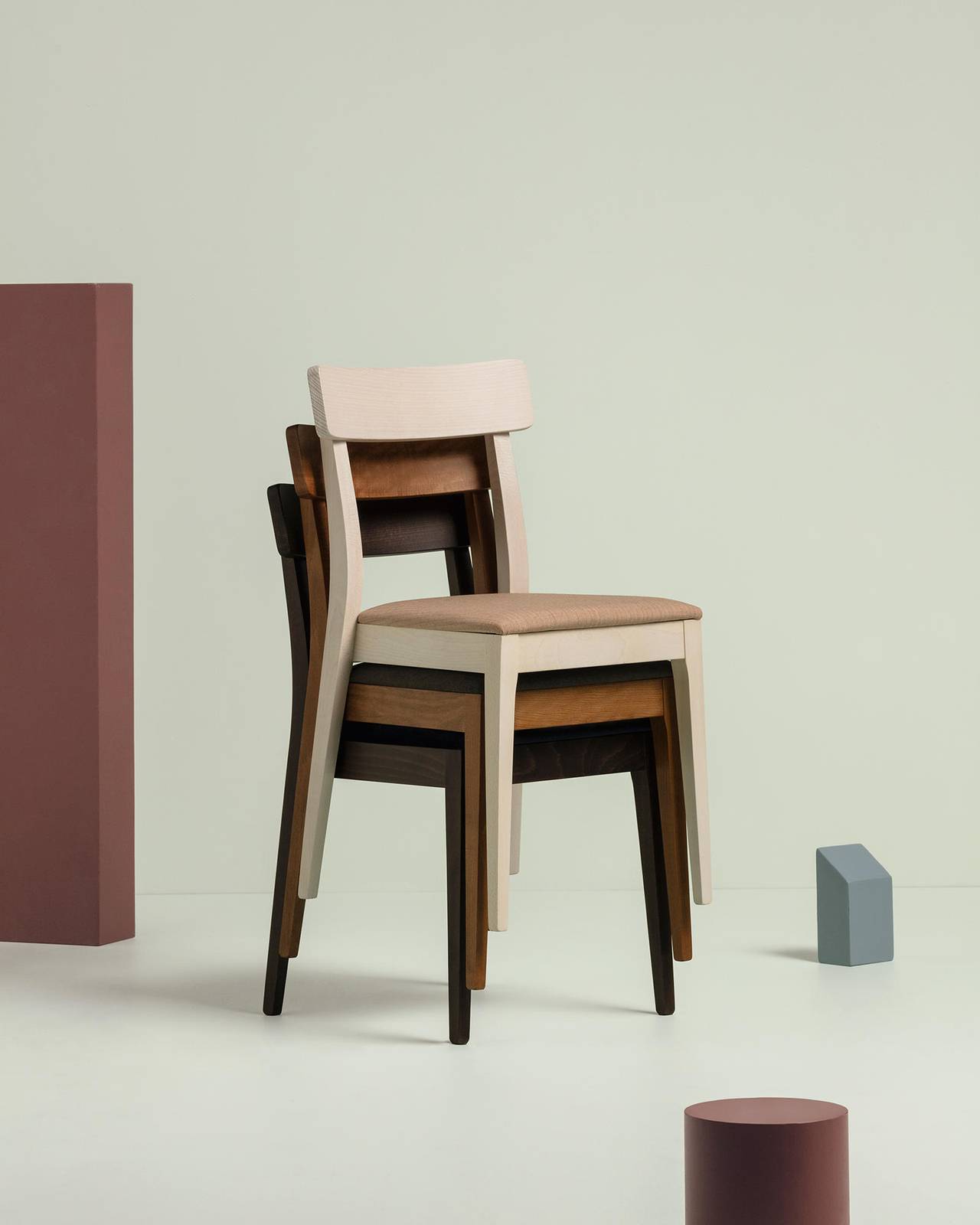 With its simple, clean and linear structure, Inga conveys lightness and serenity. Its slim but robust figure is enhanced by an elegant profile in stark contrast to the rigidity of the structure. The armchair, stackable like the chair, is distinguished by the curved shape of the armrests, which have their own particular character.