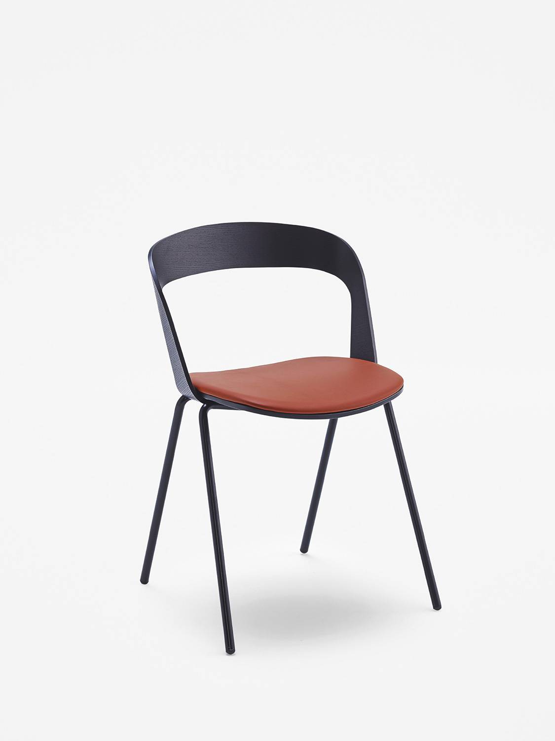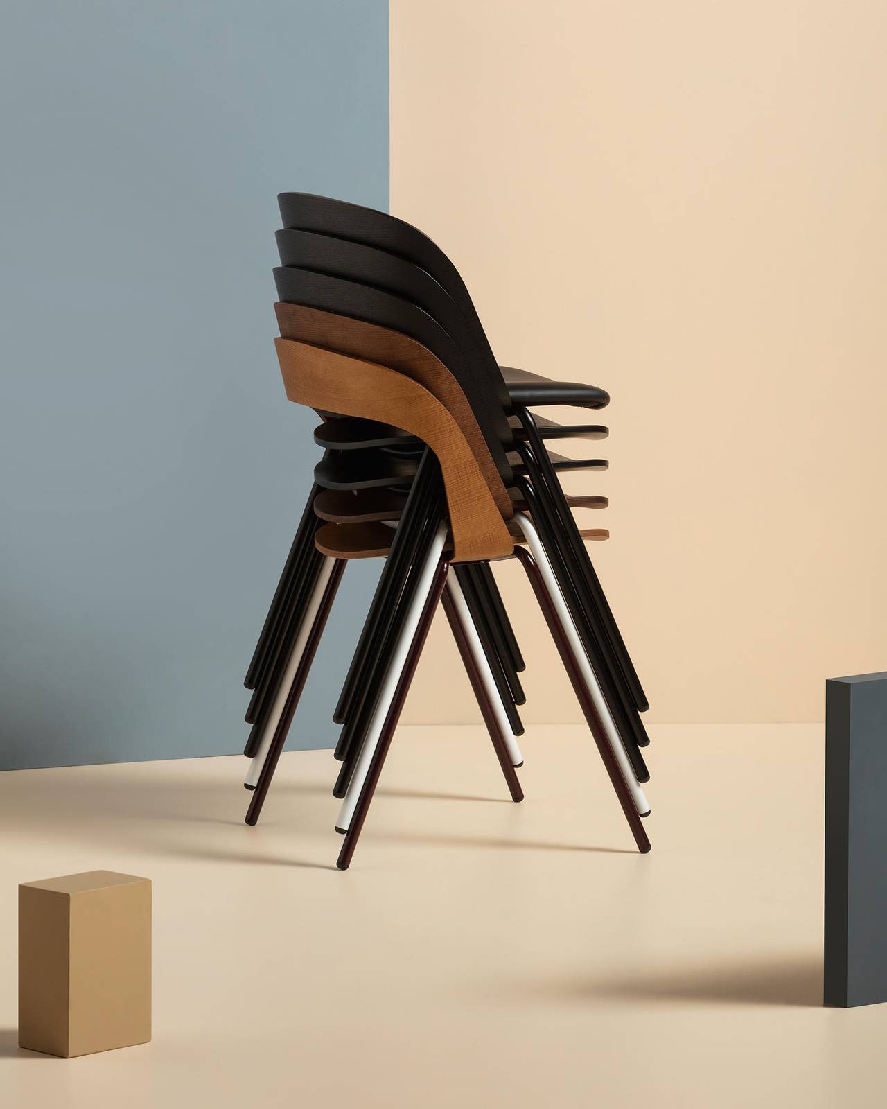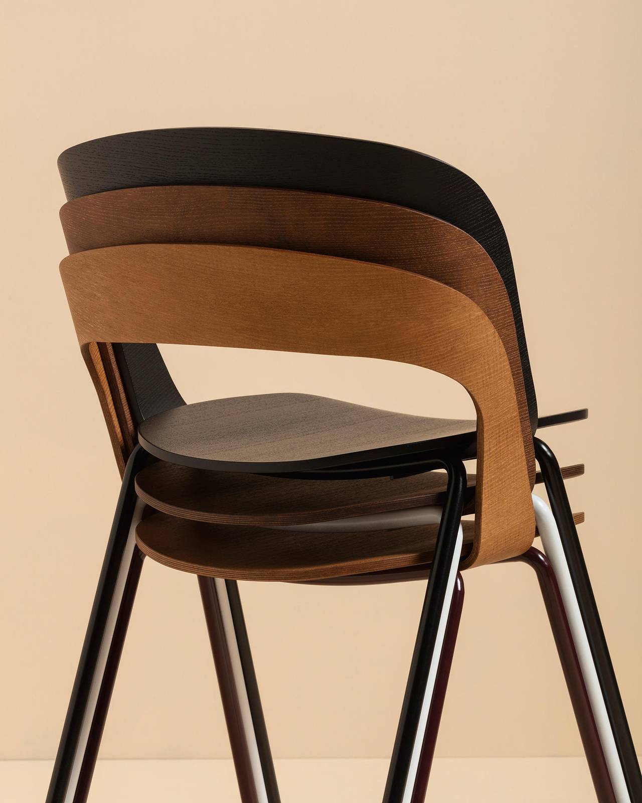 Available with metal frame and wooden seat and back. The seat is fully customisable in colours and upholstery, in leather or fabric. Stackable chair and armchair fit naturally into any context. The stool finishes a collection designed to furnish public and private spaces with a recognisable and functional aesthetic.