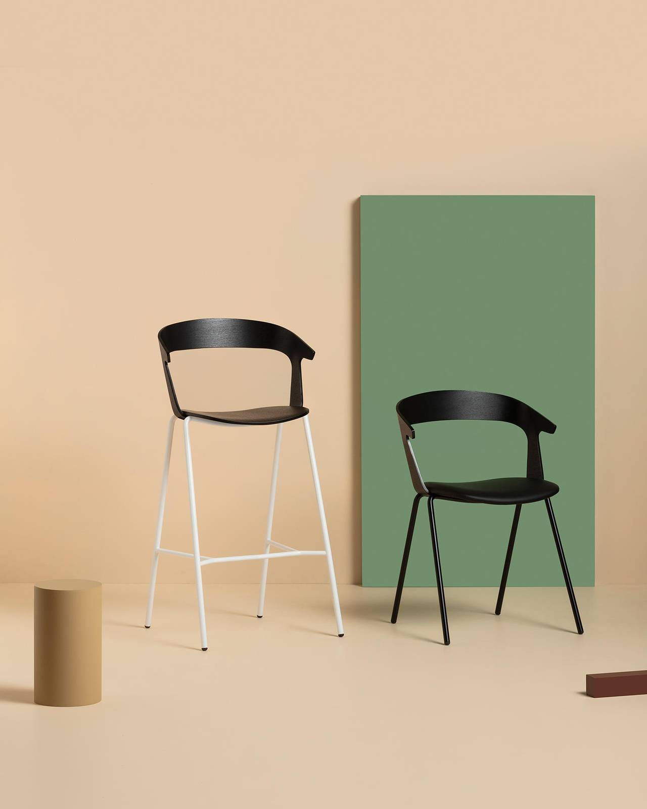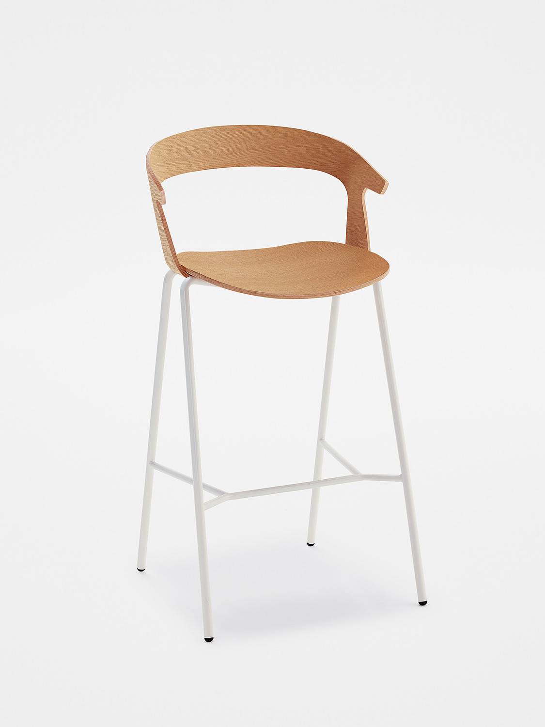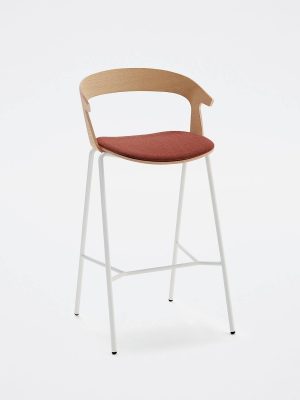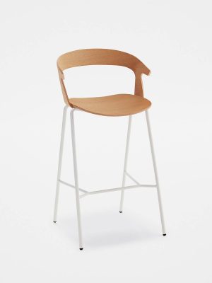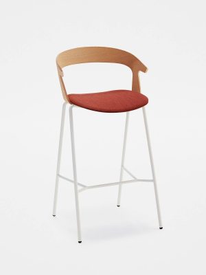 Available with metal frame and wooden seat and back. The seat is fully customisable in colours and upholstery, in leather or fabric. Stackable chair and armchair fit naturally into any context. The stool finishes a collection designed to furnish public and private spaces with a recognisable and functional aesthetic.