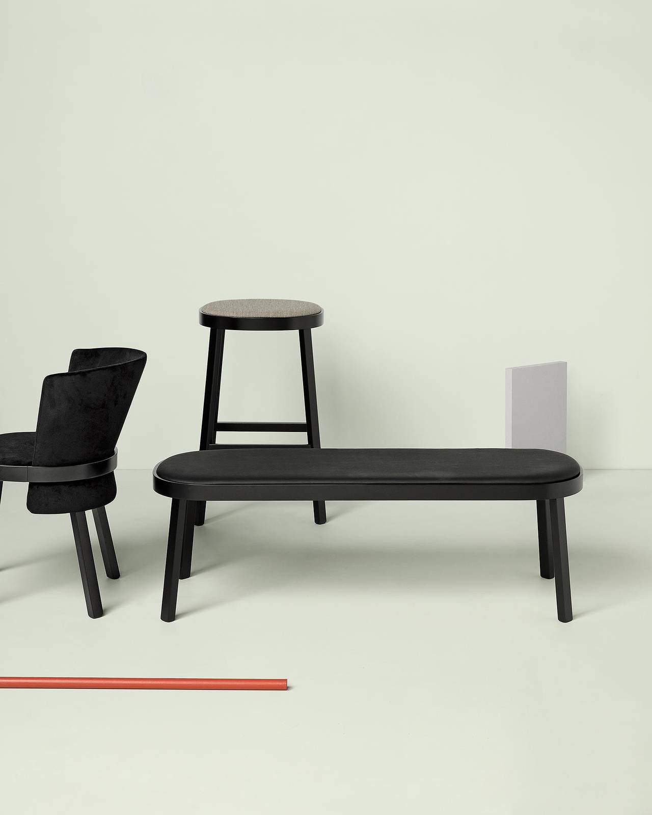 Obi is available in different versions. Chair and armchair emphasize the elegant shapes of the backrest and seat with the upholstery in leather or fabric of various colours. Bench and stools offer further furnishing solutions that allow this family to fit with elegance and personality into any contract environment.