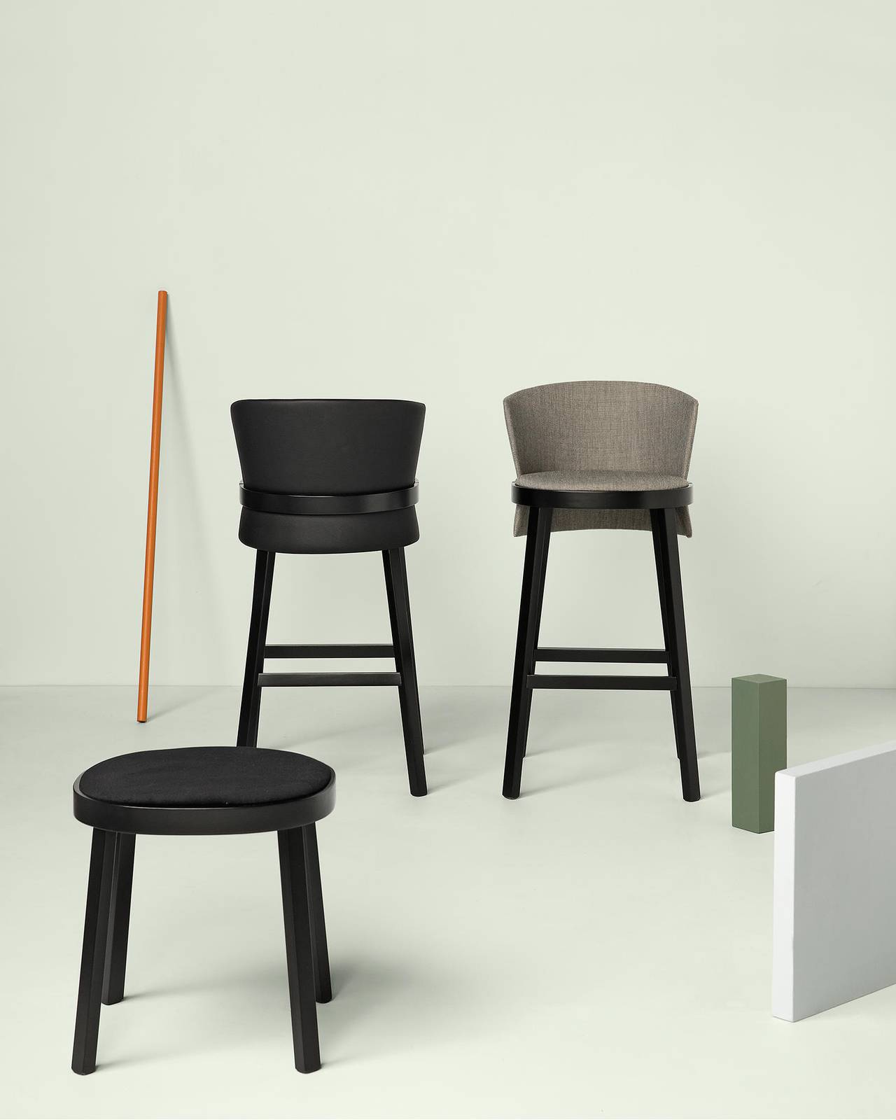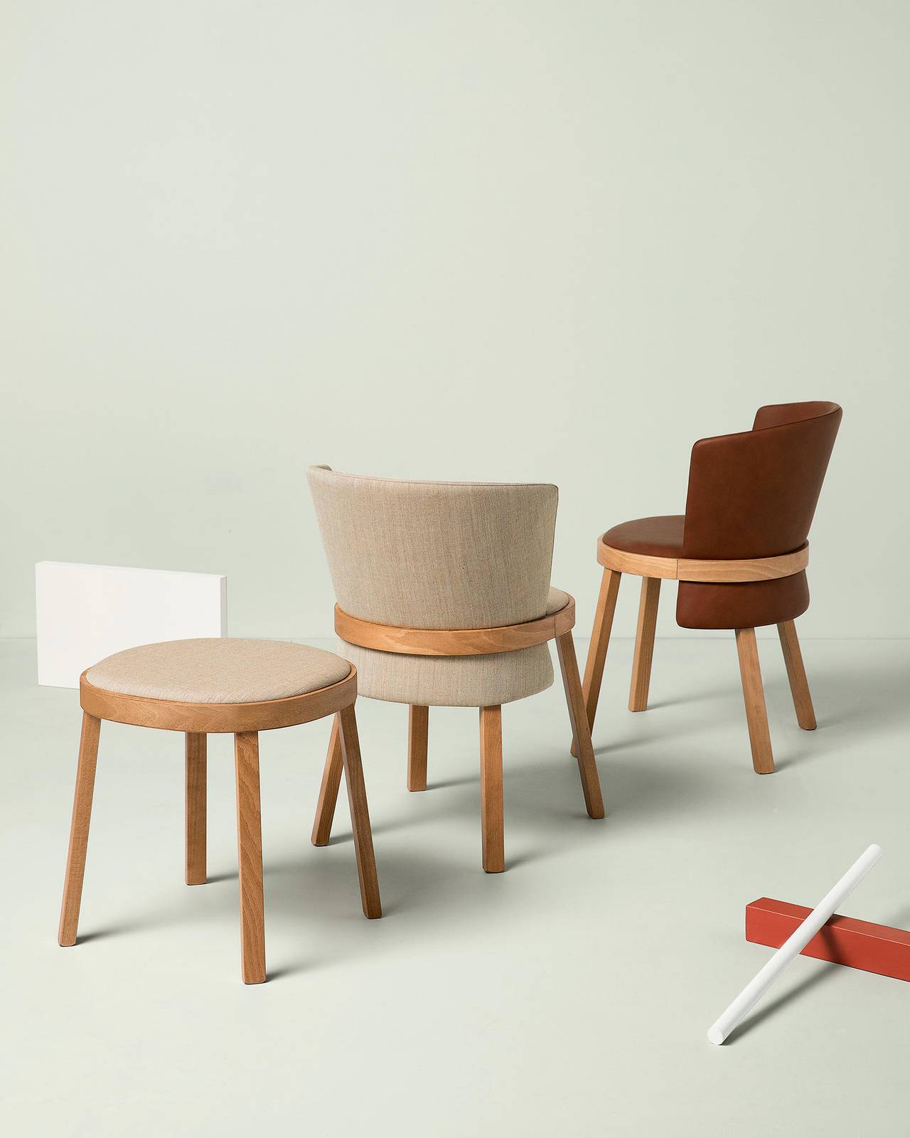 Obi is available in different versions. Chair and armchair emphasize the elegant shapes of the backrest and seat with the upholstery in leather or fabric of various colours. Bench and stools offer further furnishing solutions that allow this family to fit with elegance and personality into any contract environment.