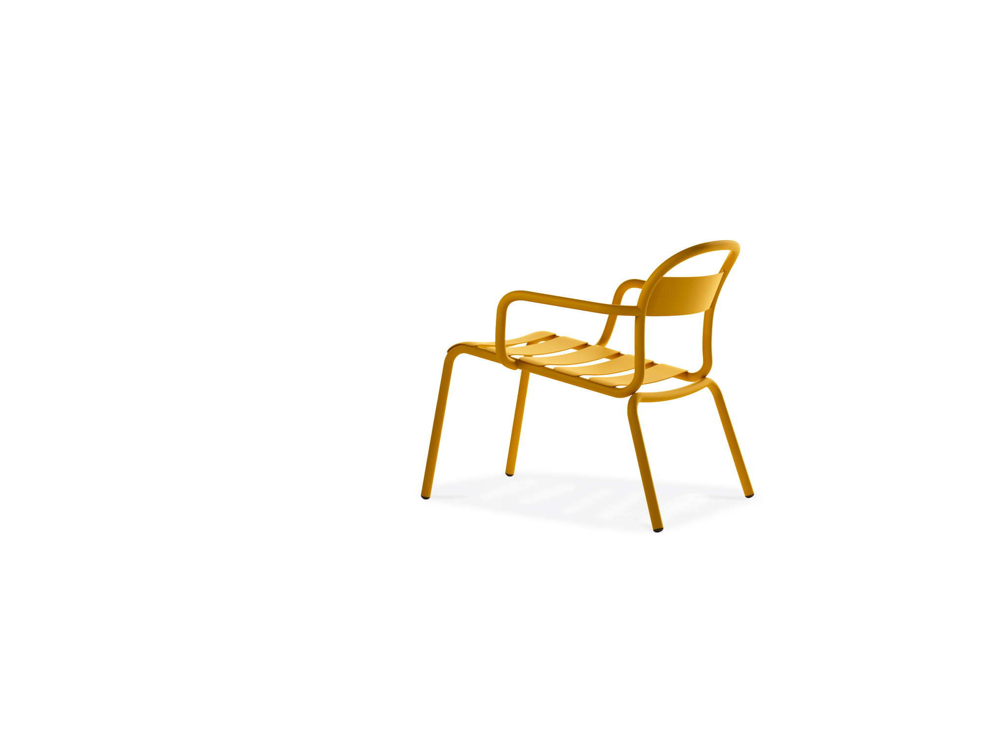 The seat features a curved aluminium tube structure, while the slats—known as “stecche” in Italian—are crafted from aluminium sheet, forming both the seat and backrest. The powder-coated finish allows for vibrant colour options, providing a truly unique customised look.