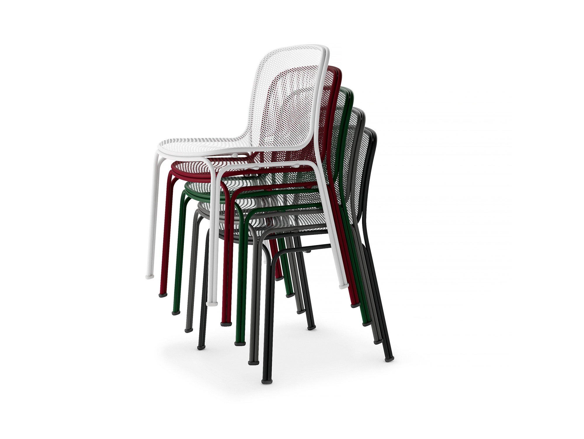 This innovative design features a slender steel rod that elegantly curves to create a refined frame, while the wire mesh provides comfort for the seated area. The subtle interplay of curves and connections raises the shell slightly off the legs, enhancing the chair’s ease of handling and stacking.
