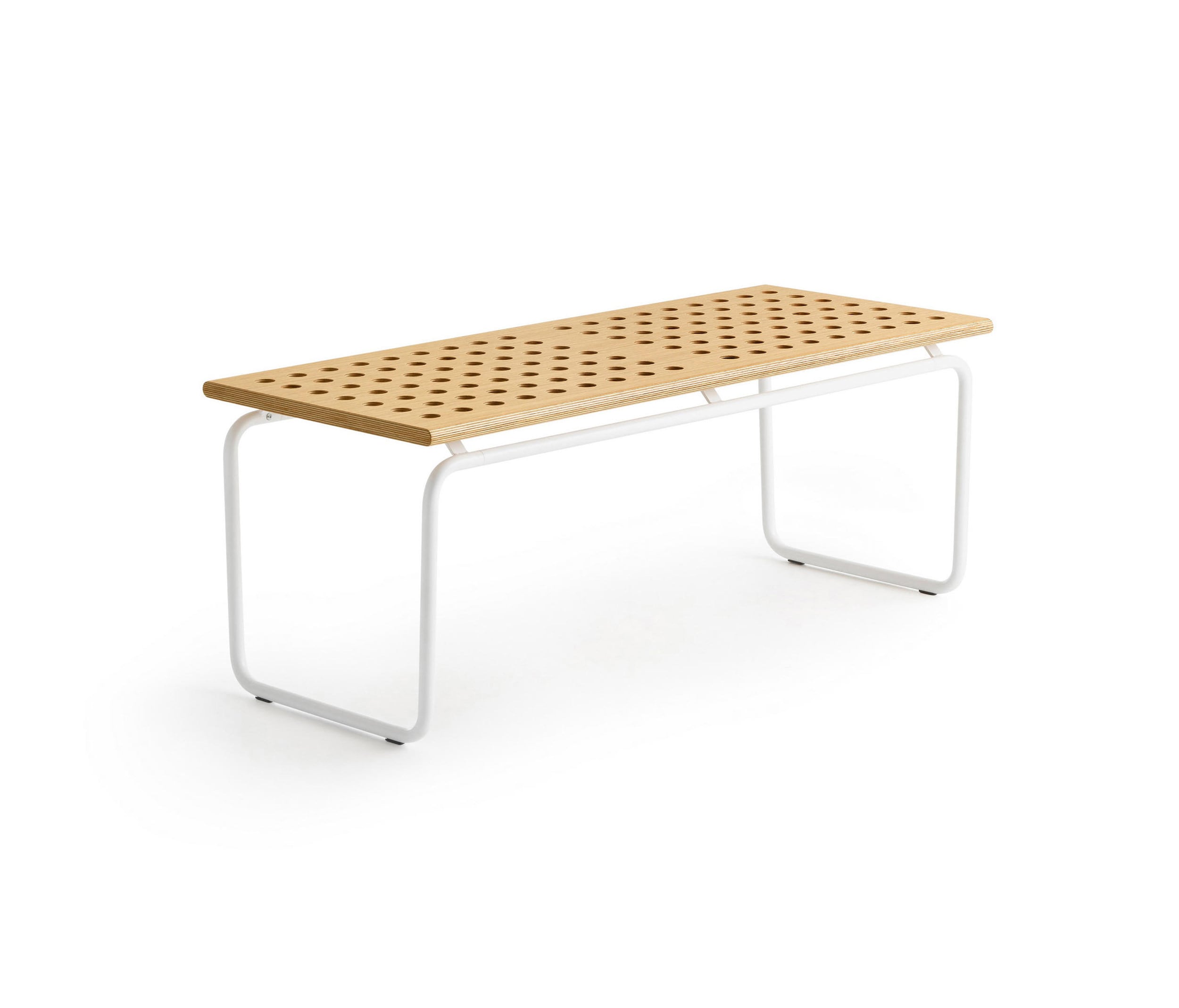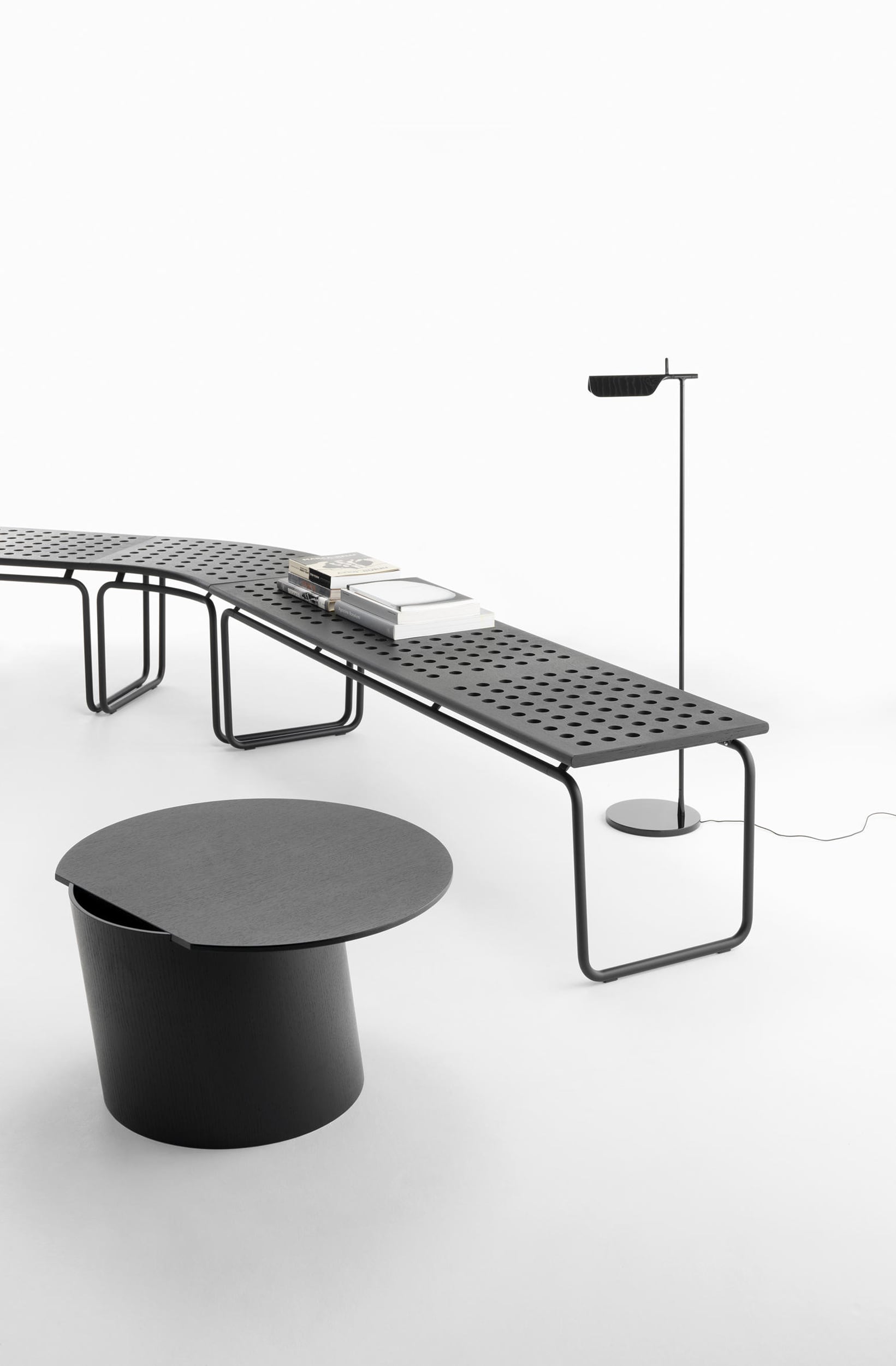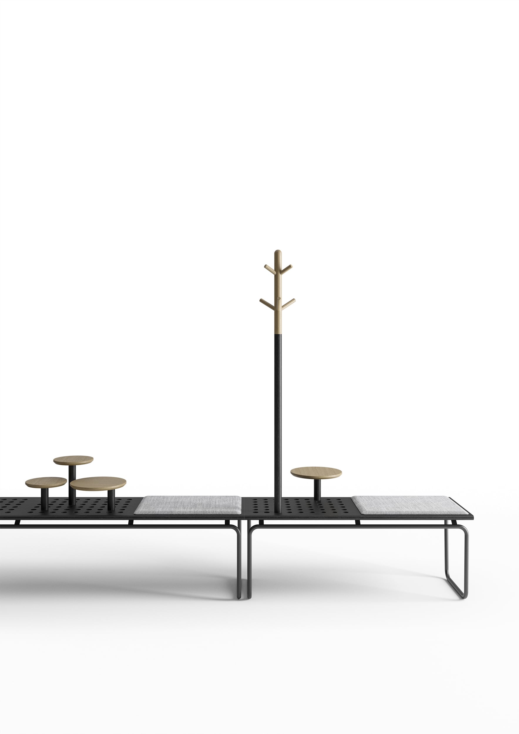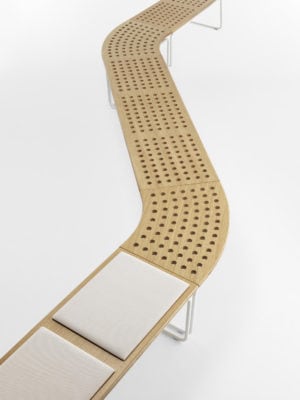 Born from the meeting between Crassevig and the Japanese studio Drill Design, Maki is a system of benches characterised by de_cor inspired by round holes, arranged in regular rows, which make them light and dynamic. Three simple elements allow you to create endless configurations, in different environments: from a small waiting room to a large hall, indoor or outdoor. The seat is available in oak plywood, natural, red or black, or black HPL, also suitable for outdoor use. An upholstered panel is available. The structure, made of tubular metal, is proposed in white, red, black lacquer or chromed.