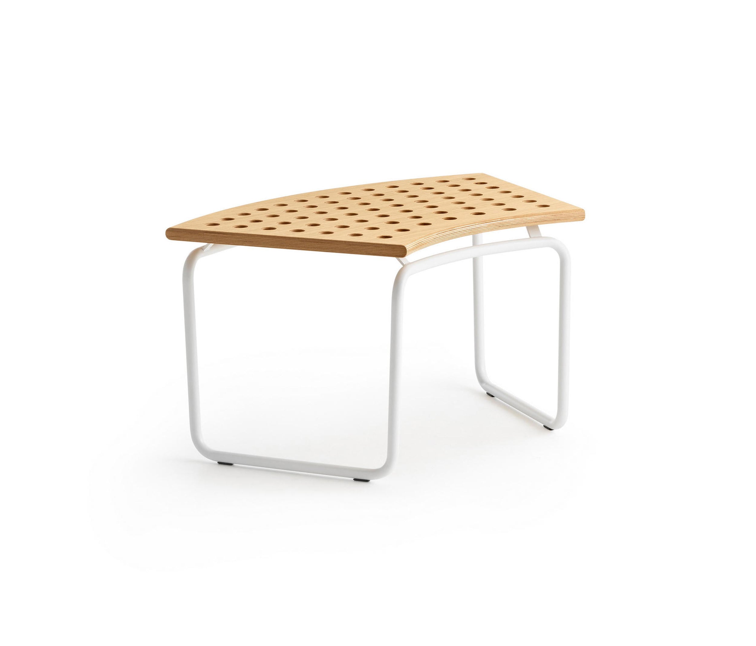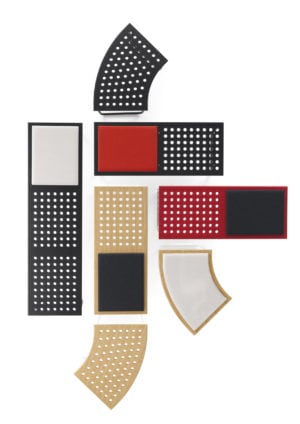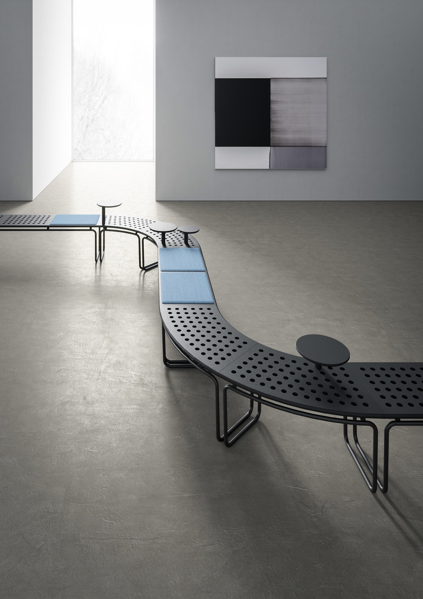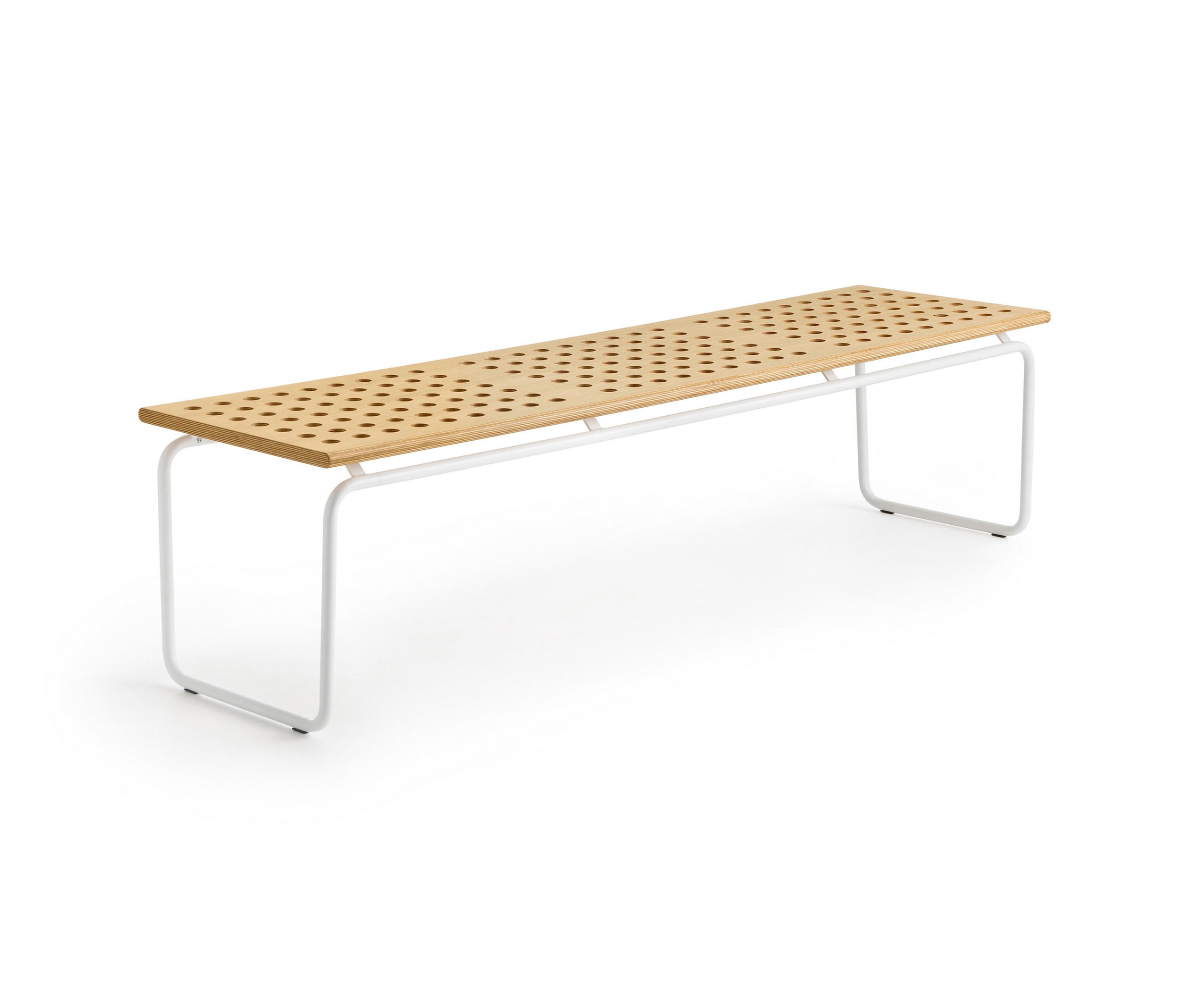 Born from the meeting between Crassevig and the Japanese studio Drill Design, Maki is a system of benches characterised by de_cor inspired by round holes, arranged in regular rows, which make them light and dynamic. Three simple elements allow you to create endless configurations, in different environments: from a small waiting room to a large hall, indoor or outdoor. The seat is available in oak plywood, natural, red or black, or black HPL, also suitable for outdoor use. An upholstered panel is available. The structure, made of tubular metal, is proposed in white, red, black lacquer or chromed.