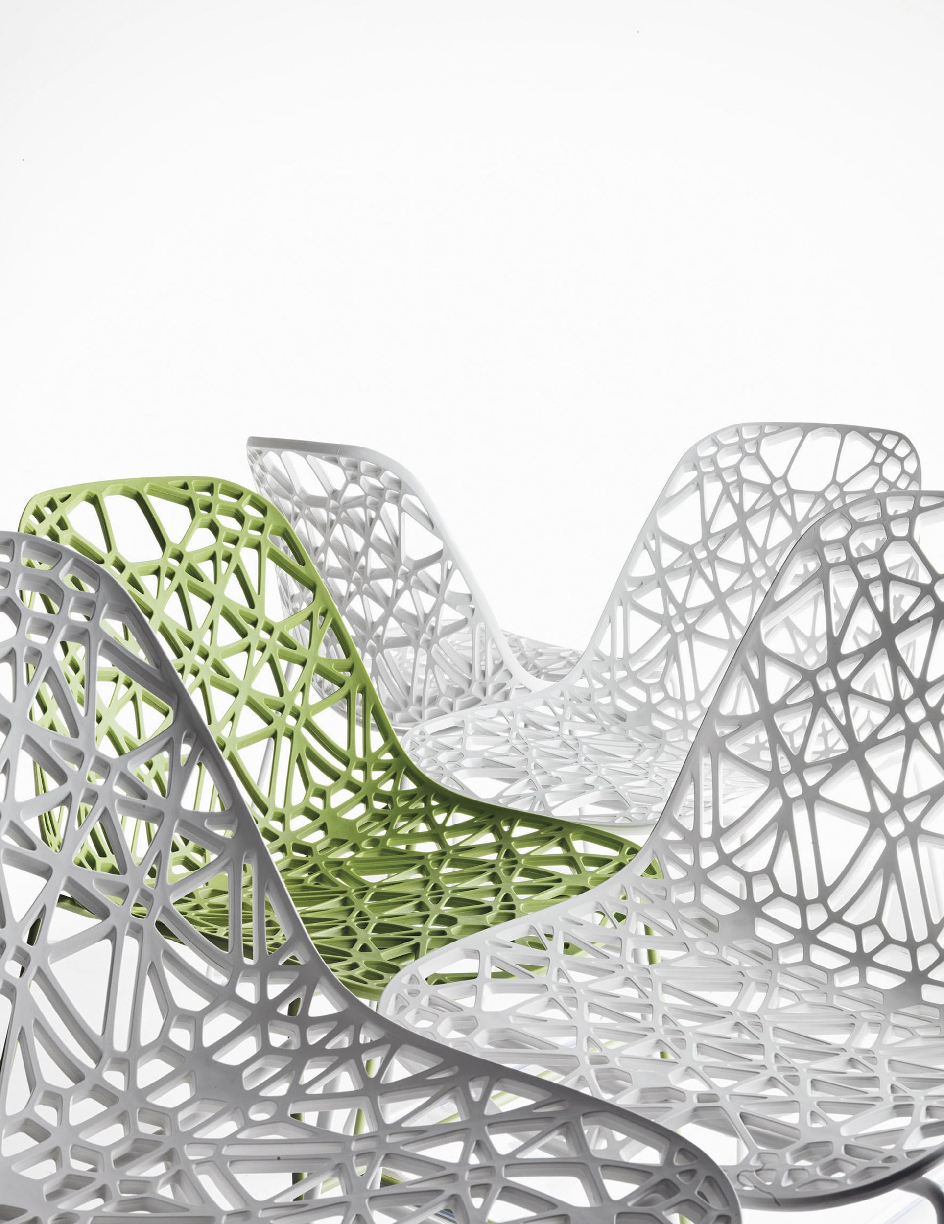Comfortable and light, Nett is chair with a strong identity thanks to the perforated geometric design. The result of a deep exploration of new technologies, Nett’s form and structure blend in a playful and sophisticated manner. Constructed in fibreglass reinforced nylon and characterised by web like perforations with a three dimensional effect, Nett is ideal for both heavy commercial contract and residential use.