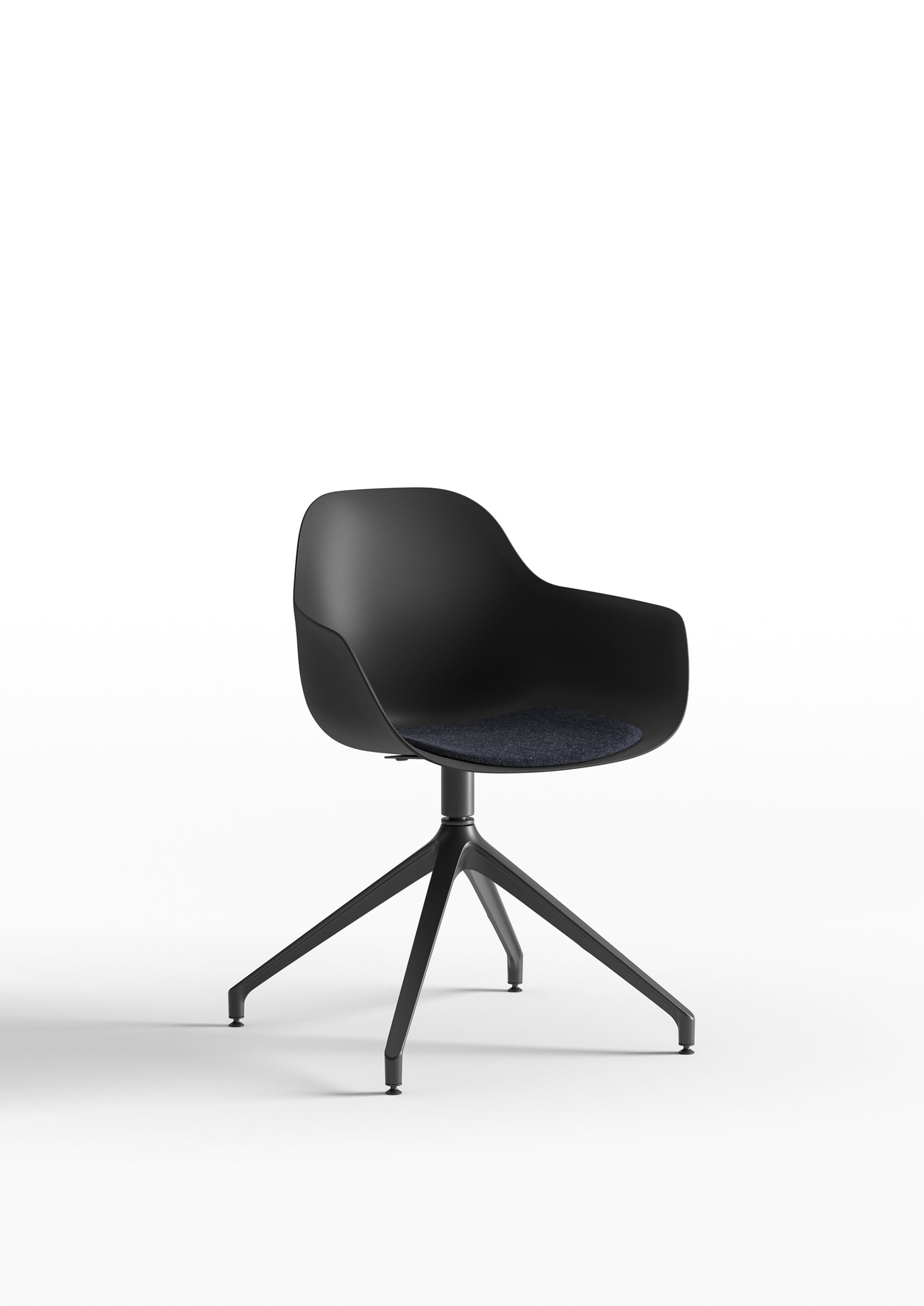The Pola family of seating includes a chair and armchair on a variety of base options: 4 Leg (timber or steel), Sled, 4-Way Swivel on glides, timber 4-Way Trestle and 5-Way Swivel chair on castors. Chairs are available with or without arms, and in selected house colours or finishes