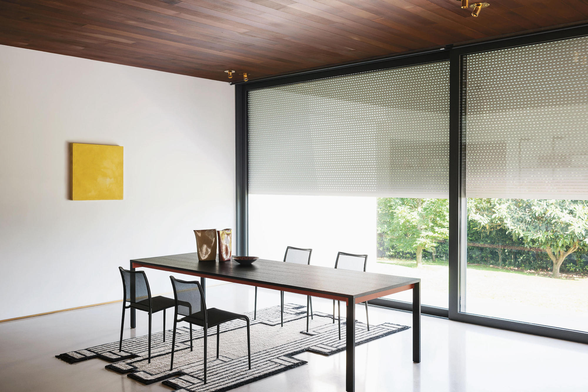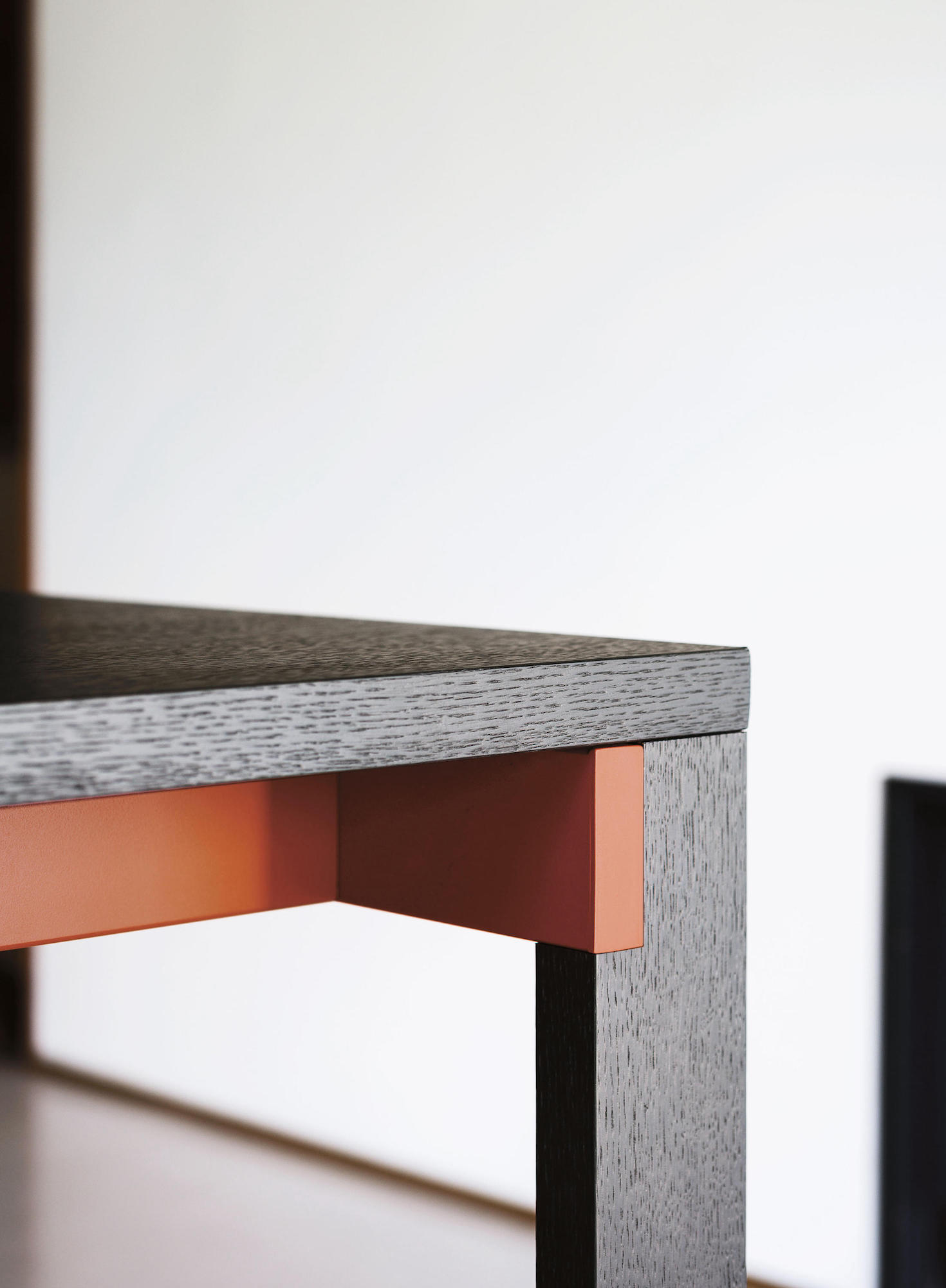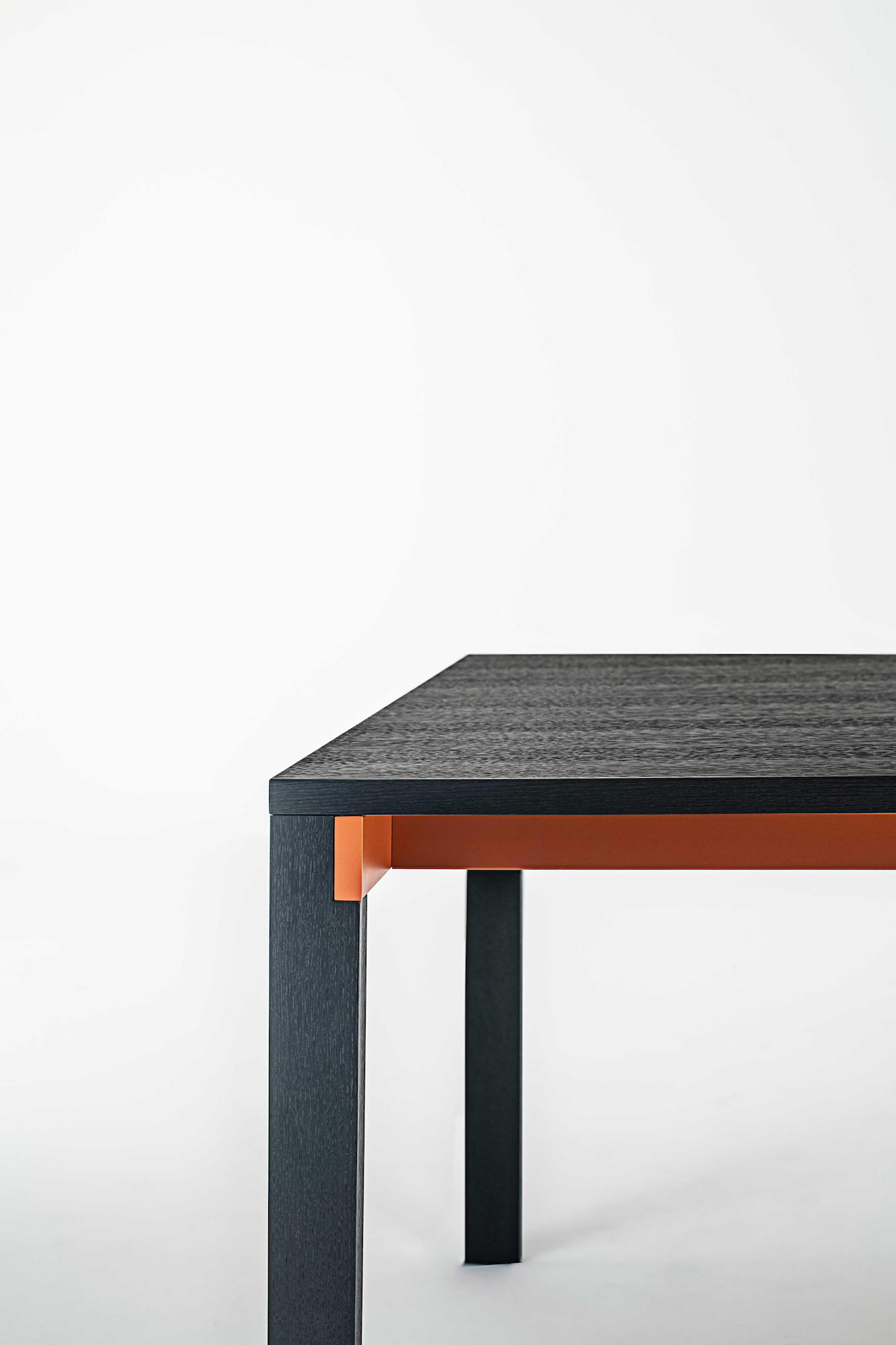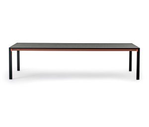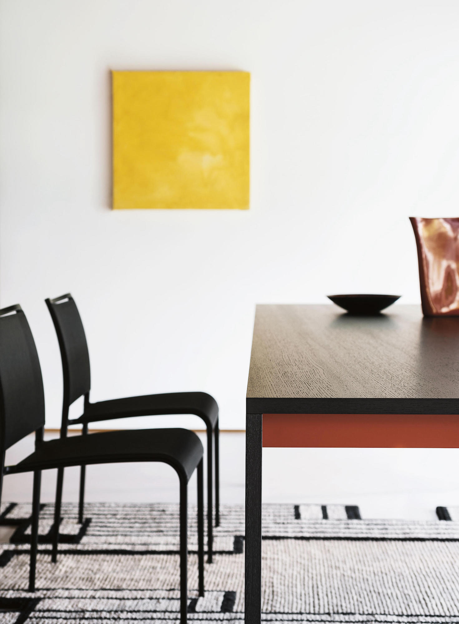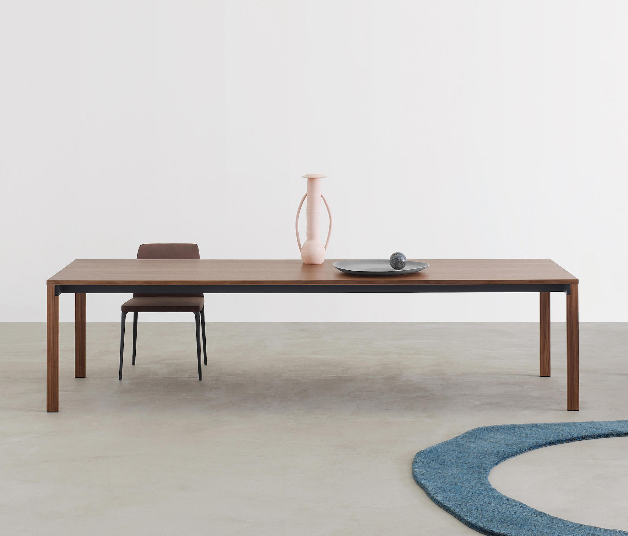 Available as a fixed or extendable table with a steel and aluminium frame at its core. Top and extendable leafs available in veneer, Fenix or laminate. Extruded aluminium legs, powdercoated or finished with timber veneer, with a contrasting powdercoated central beam.
