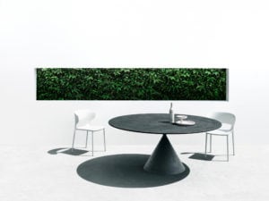Clay is available with a round or oval top in a variety of sizes and finishes and heights. Certain finishes are also suitable for outdoor use.