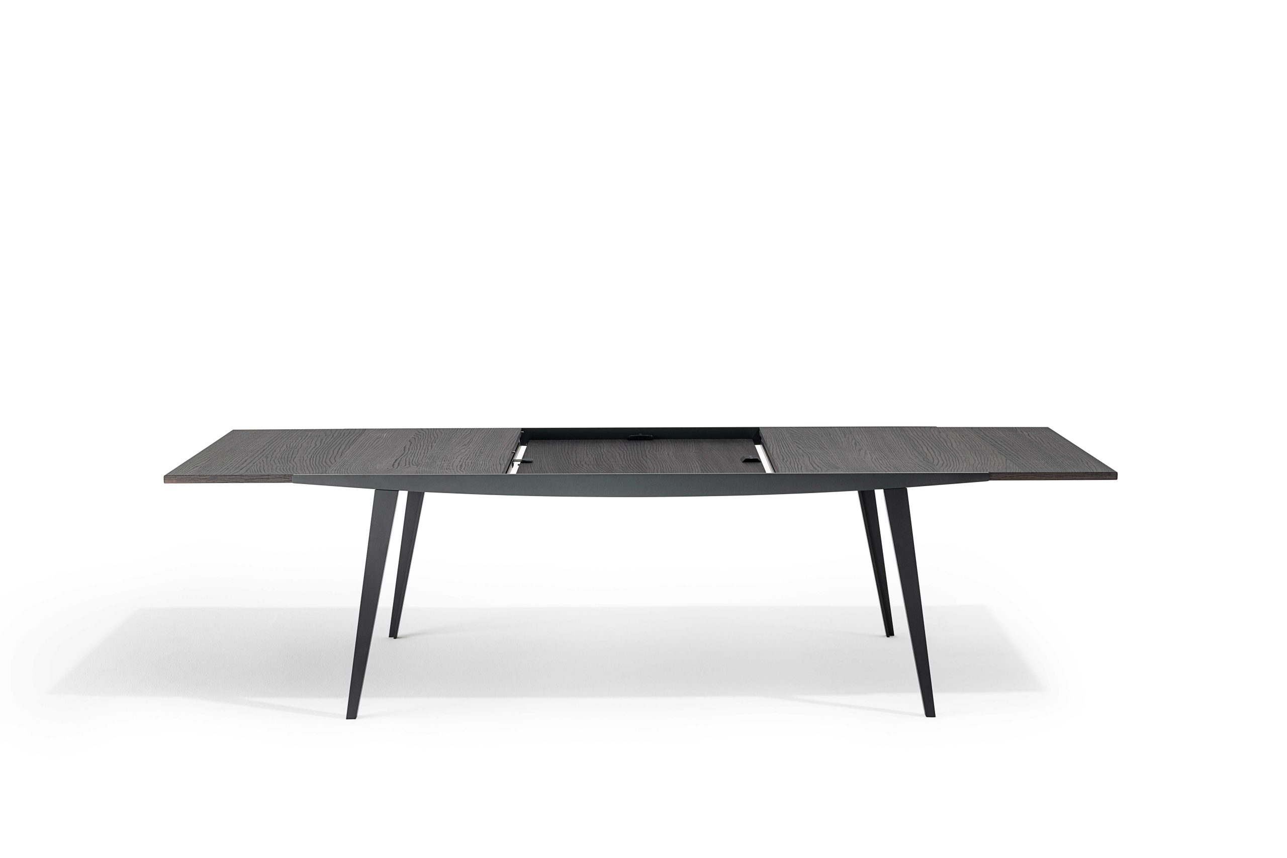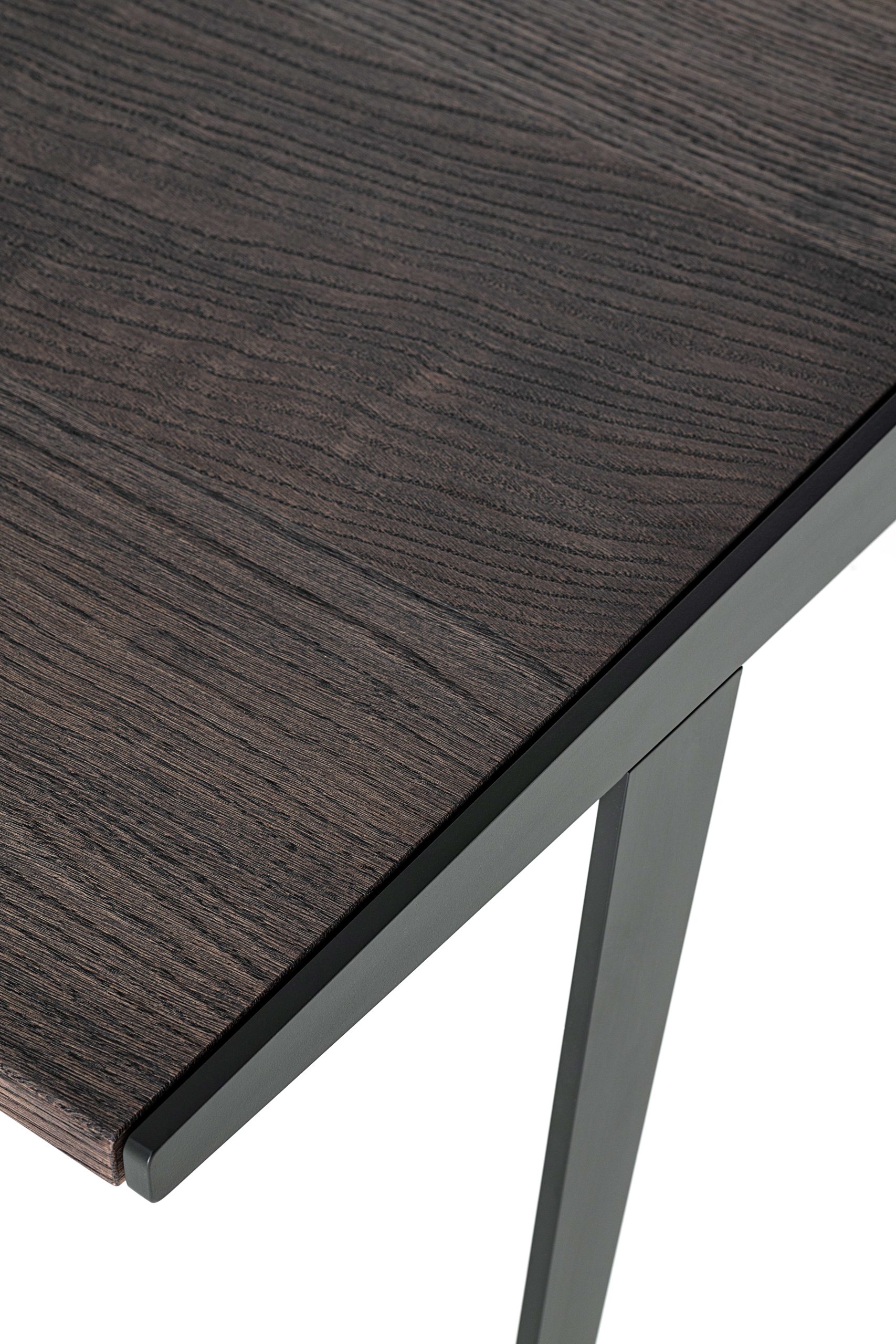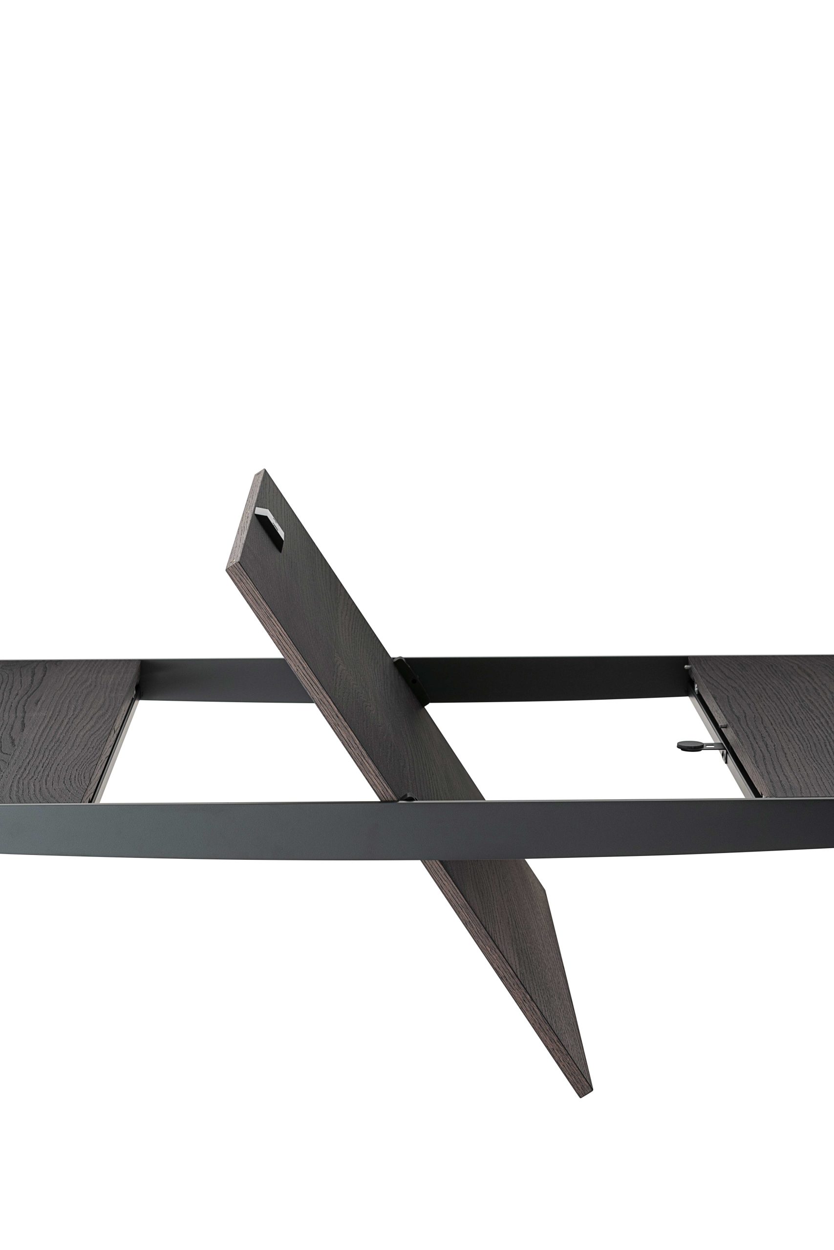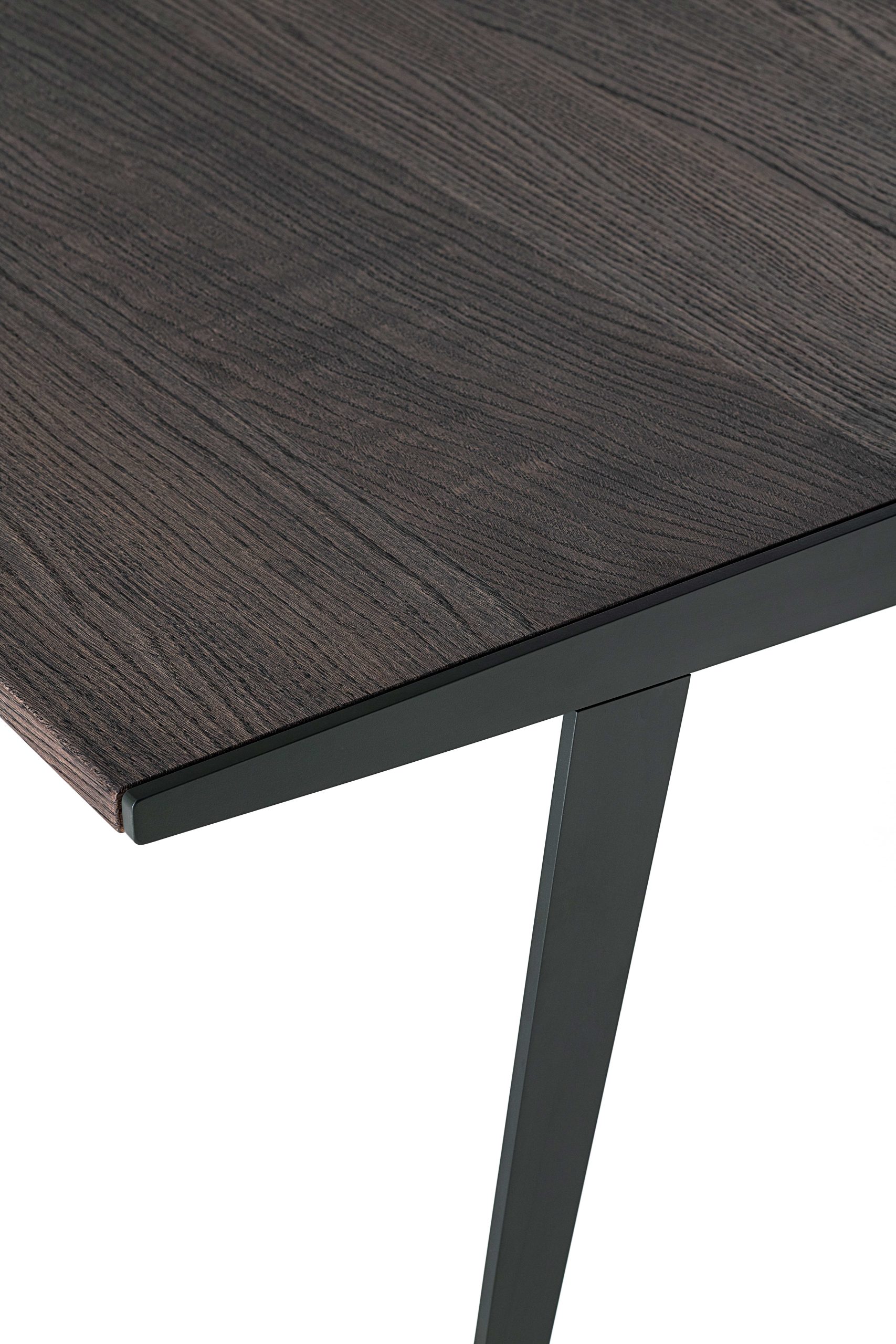 of this product; the top in light or dark oak veneered wood contrasts with the lacquered steel frame, emphasising the lightness and elegance of the profile shape. As the name Fourmore suggests, the extension allows the addition of four seats, for both table sizes.