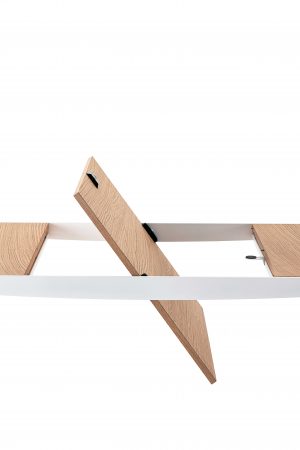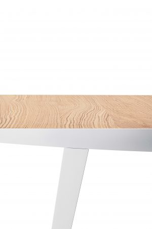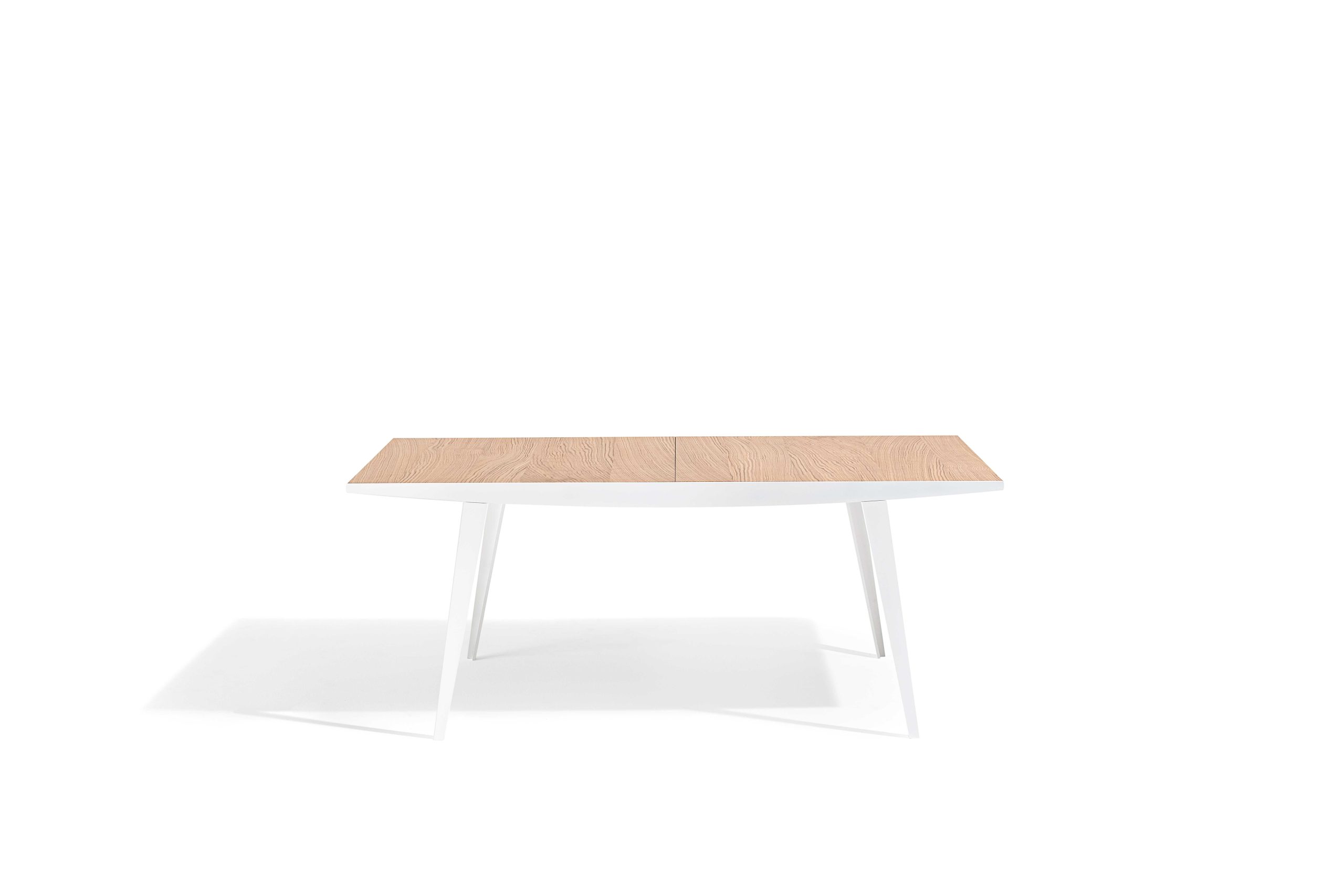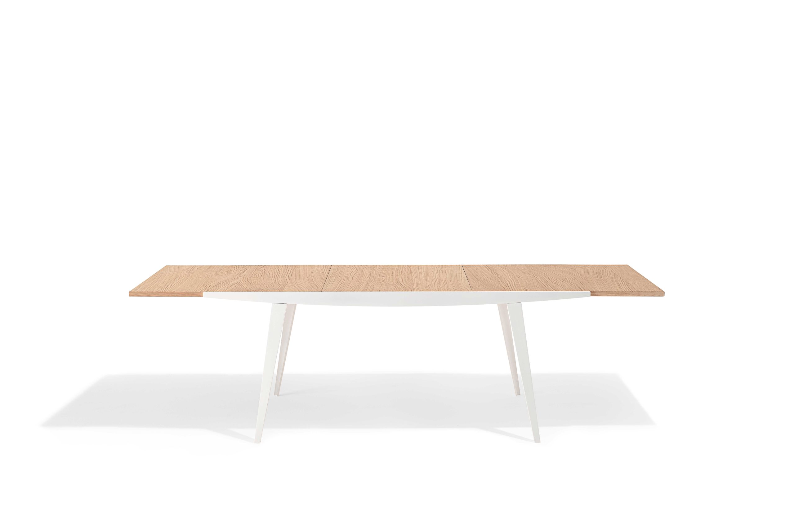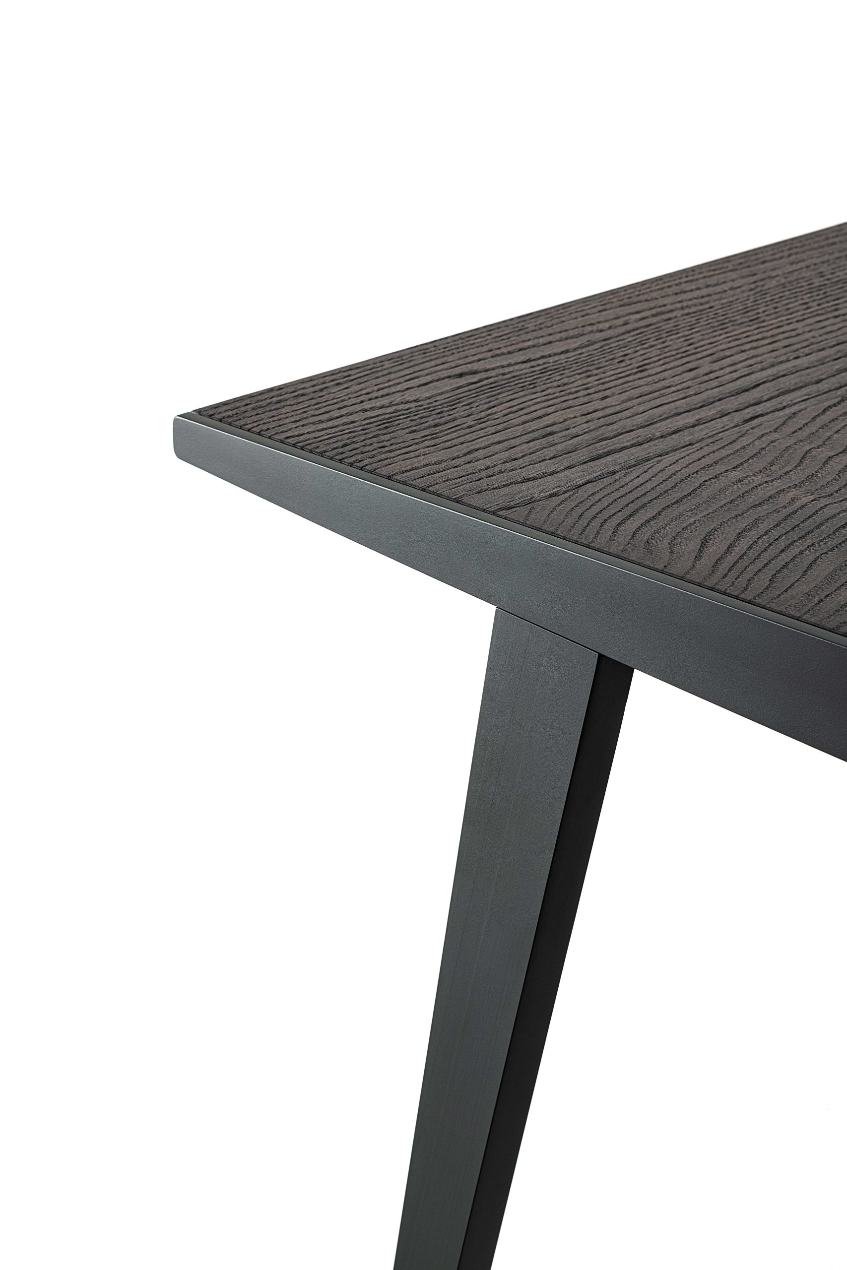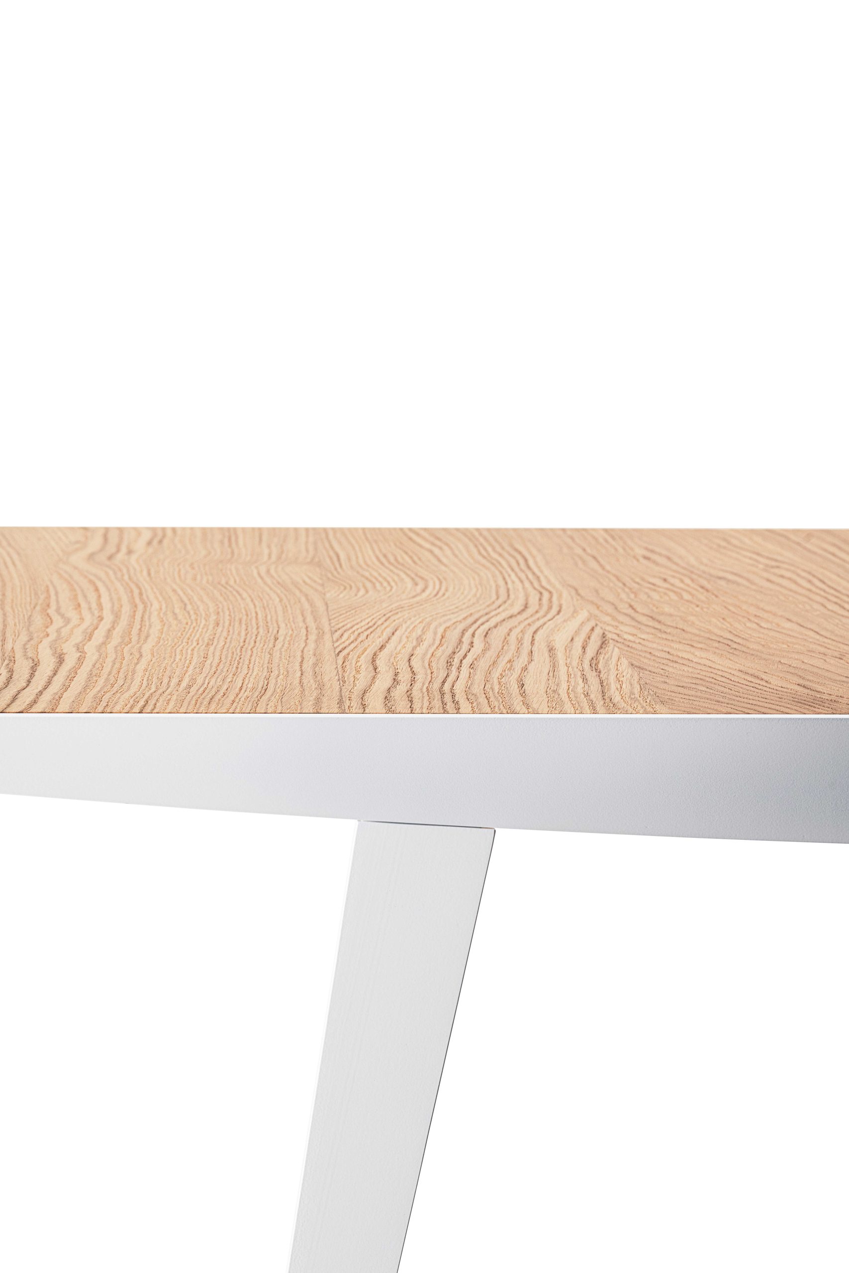 of this product; the top in light or dark oak veneered wood contrasts with the lacquered steel frame, emphasising the lightness and elegance of the profile shape. As the name Fourmore suggests, the extension allows the addition of four seats, for both table sizes.