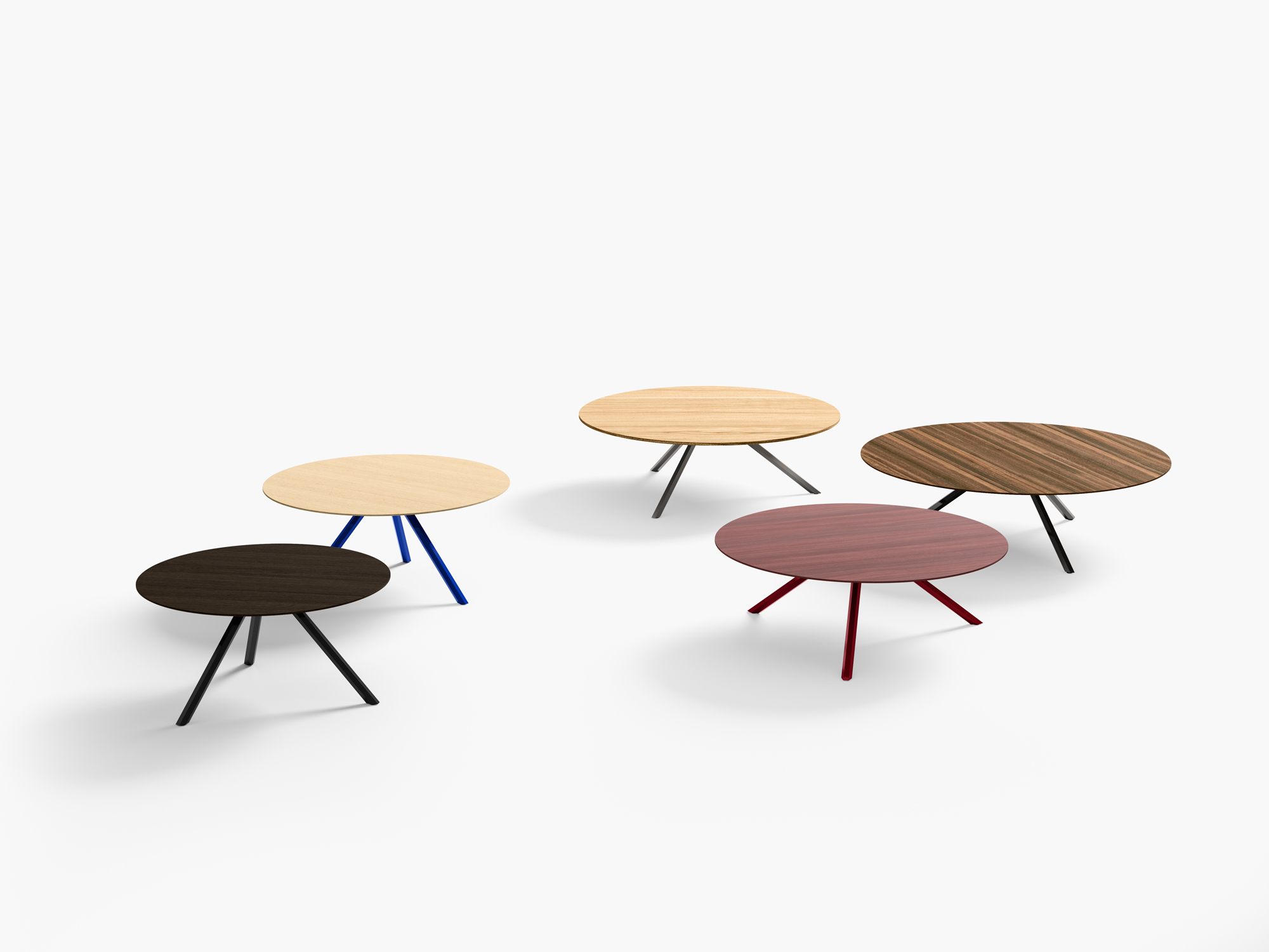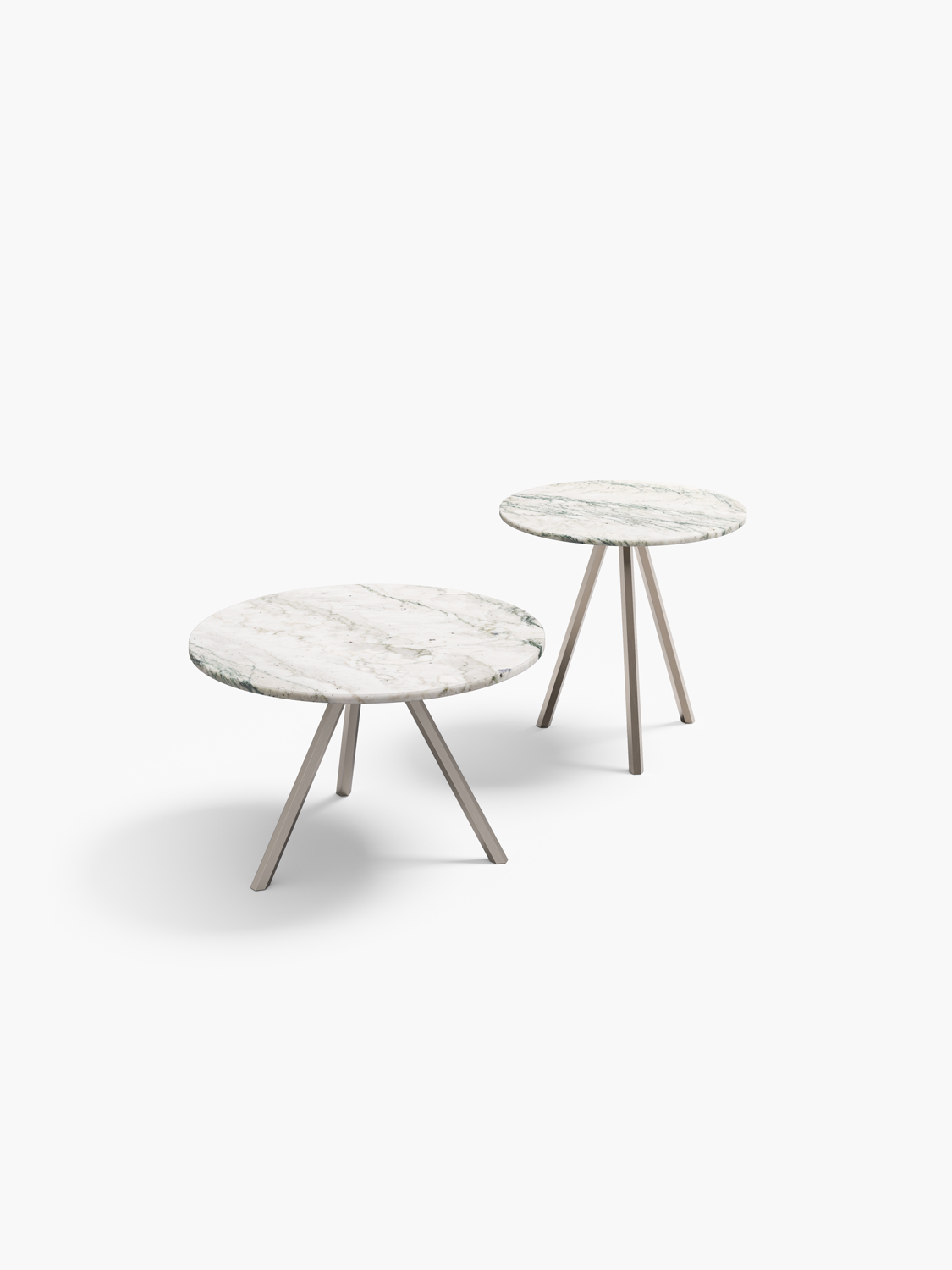 Mini Heb is a smaller version of the iconic Heb table. This versatile range includes both coffee and side tables, each featuring a sculptural three-legged base crafted from painted metal and a top available in various finishes, including marble and wood.