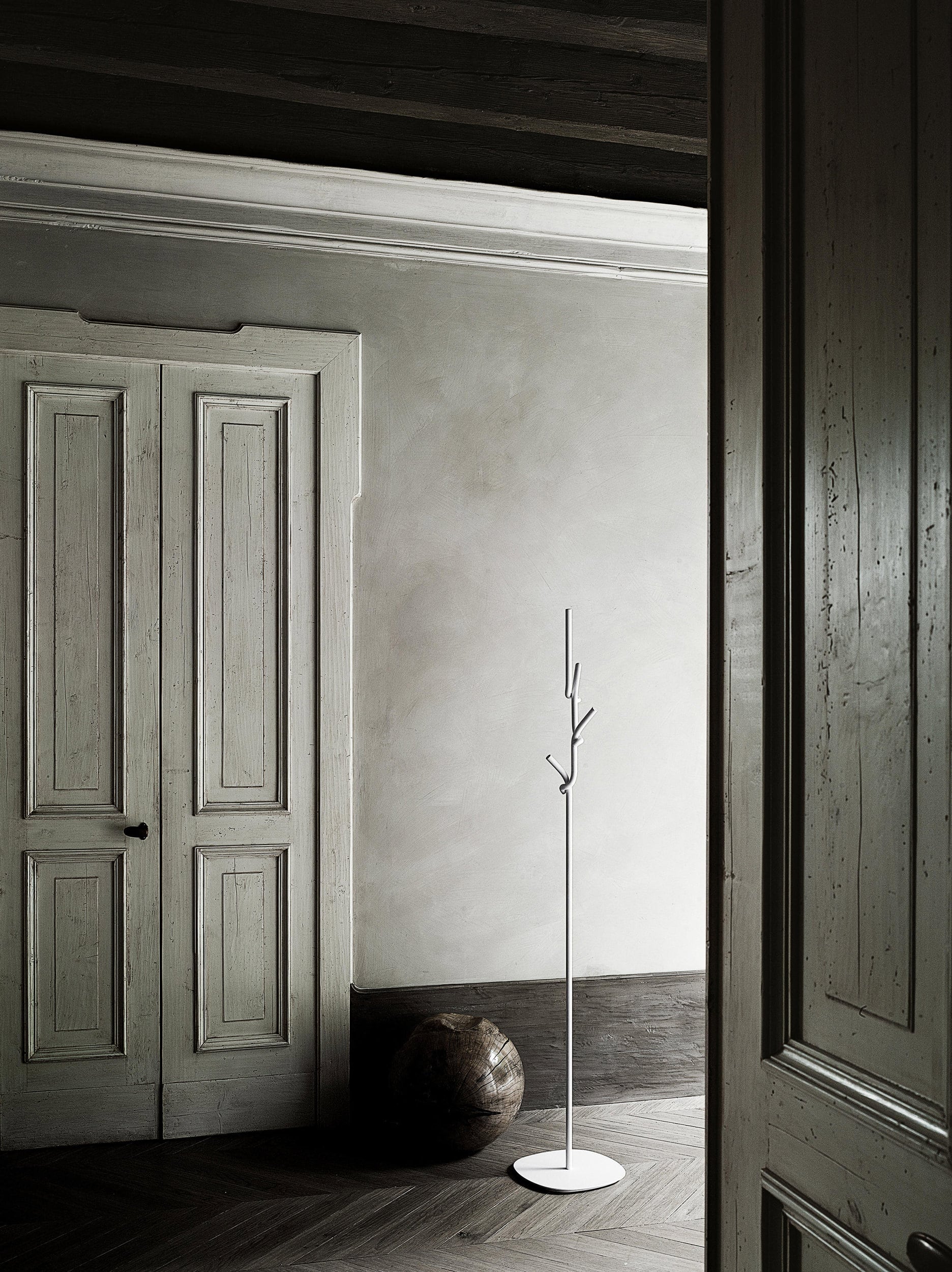 The Softer Than Steel Collection includes a chair, bench, coat rack and selection of occasional tables. Benches are a available in both indoor and outdoor versions.
