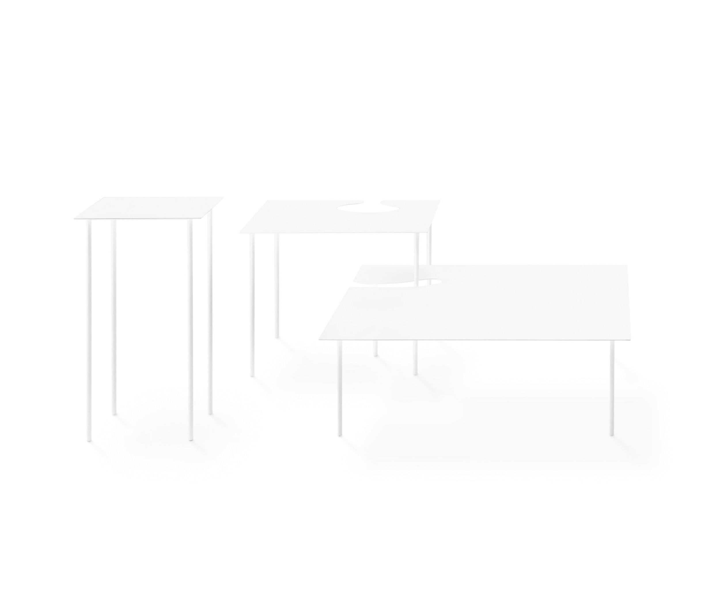 The Softer Than Steel Collection includes a chair, bench, coat rack and selection of occasional tables. Benches are a available in both indoor and outdoor versions.