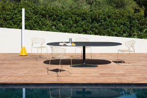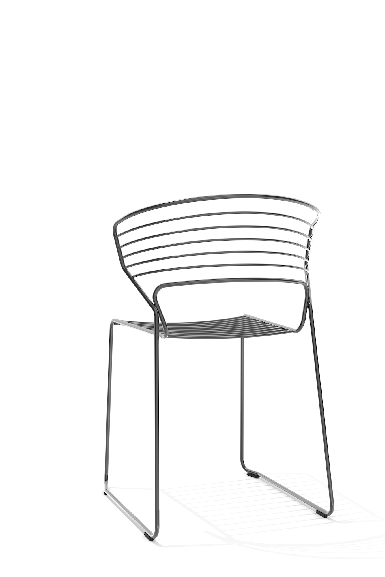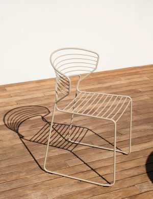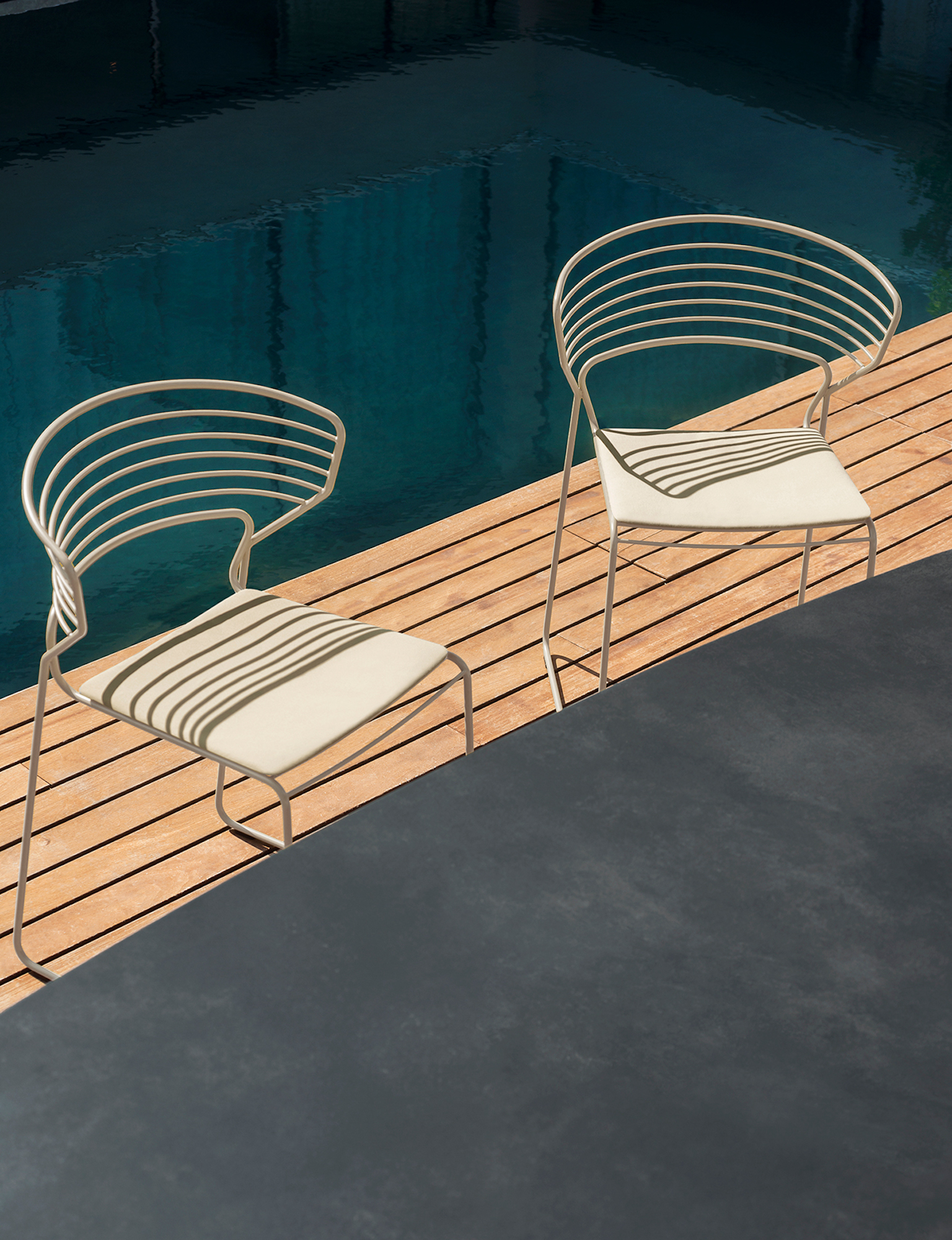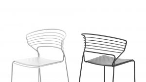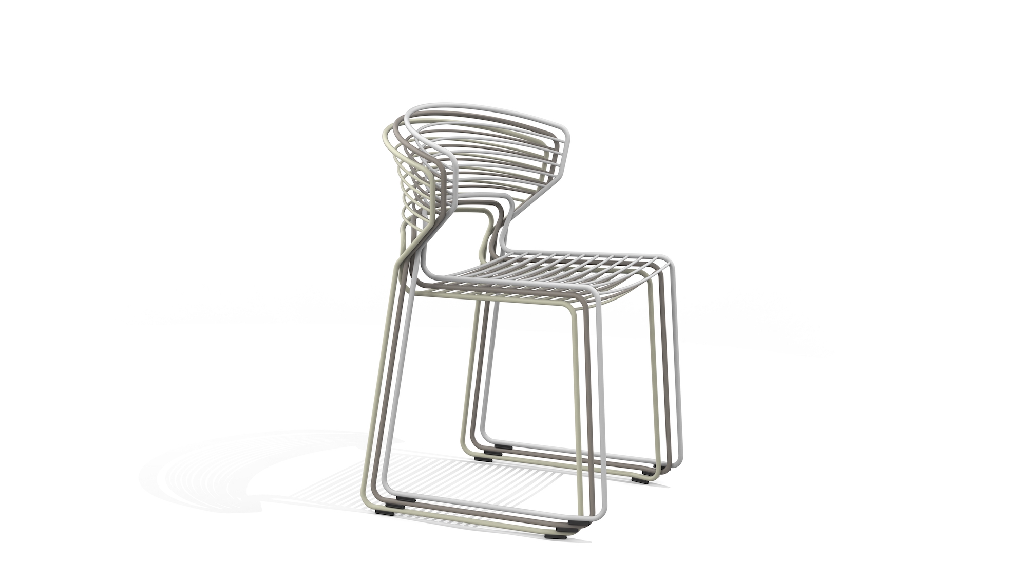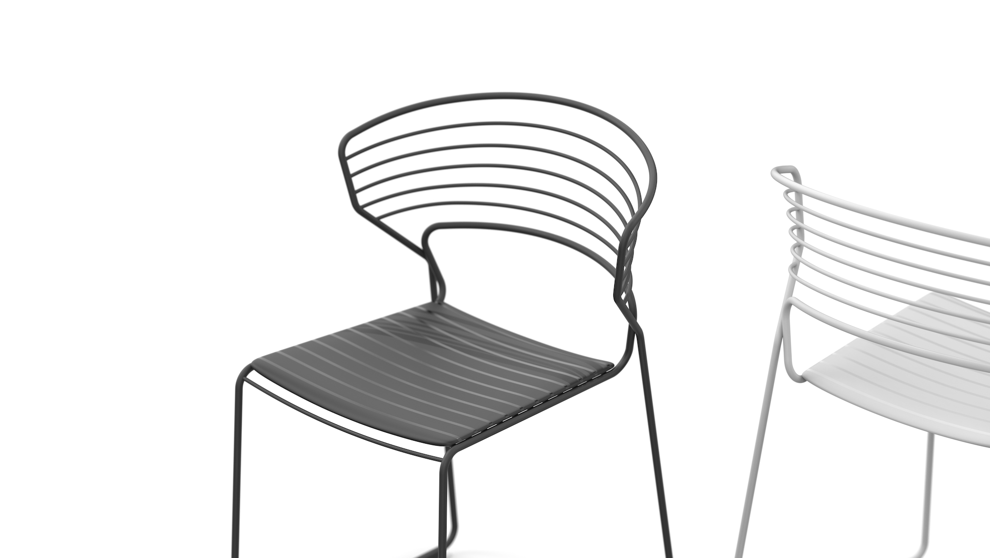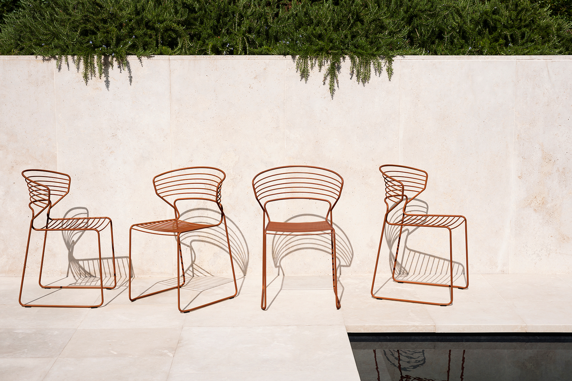 A new collection of seating for the outdoors in powdercoated steel, or chromed steel for the indoor version. An expansion on the popular Koki collection, now offering a wire alternative as a stacking chair, stool, lounge chair and two-seater lounge.