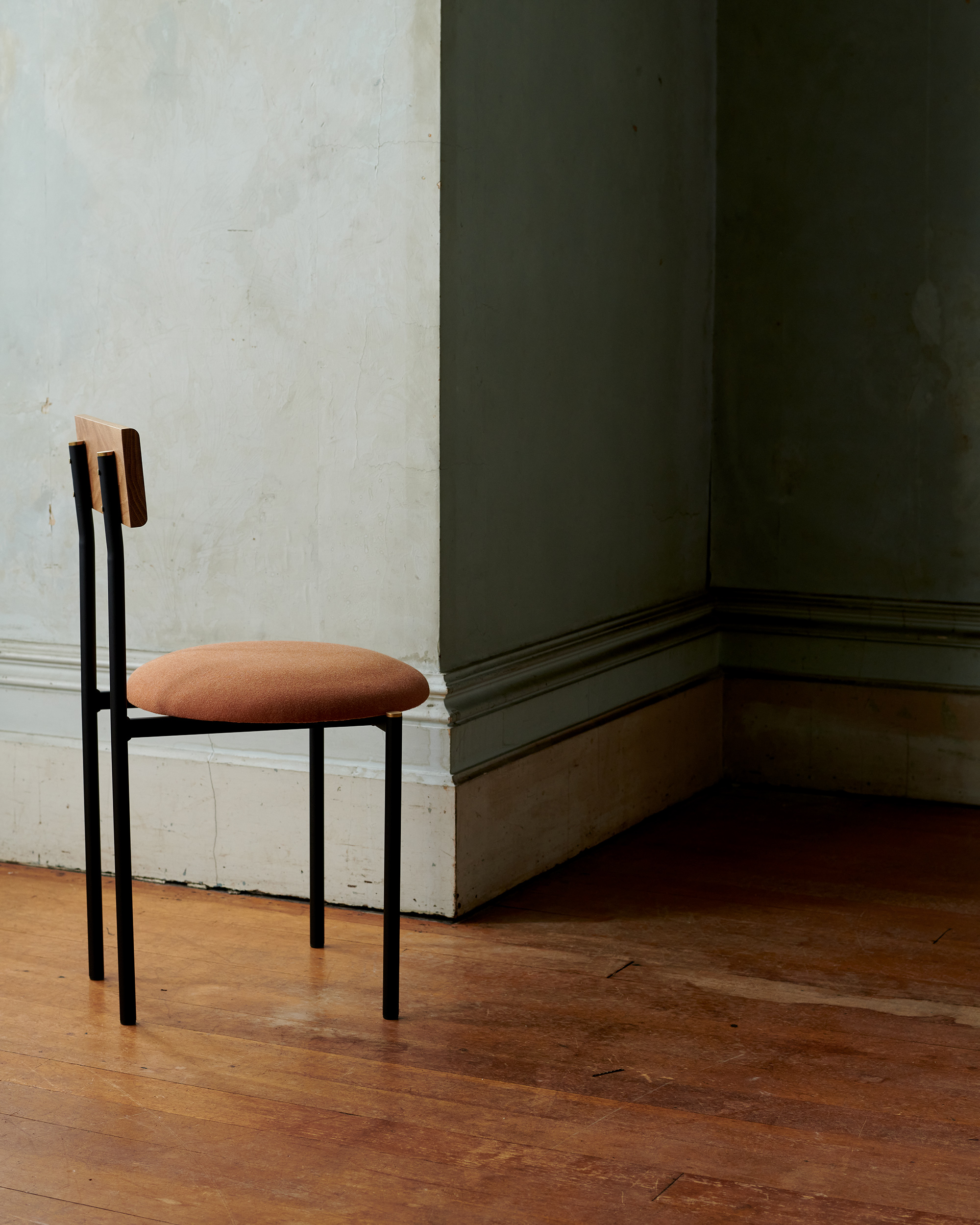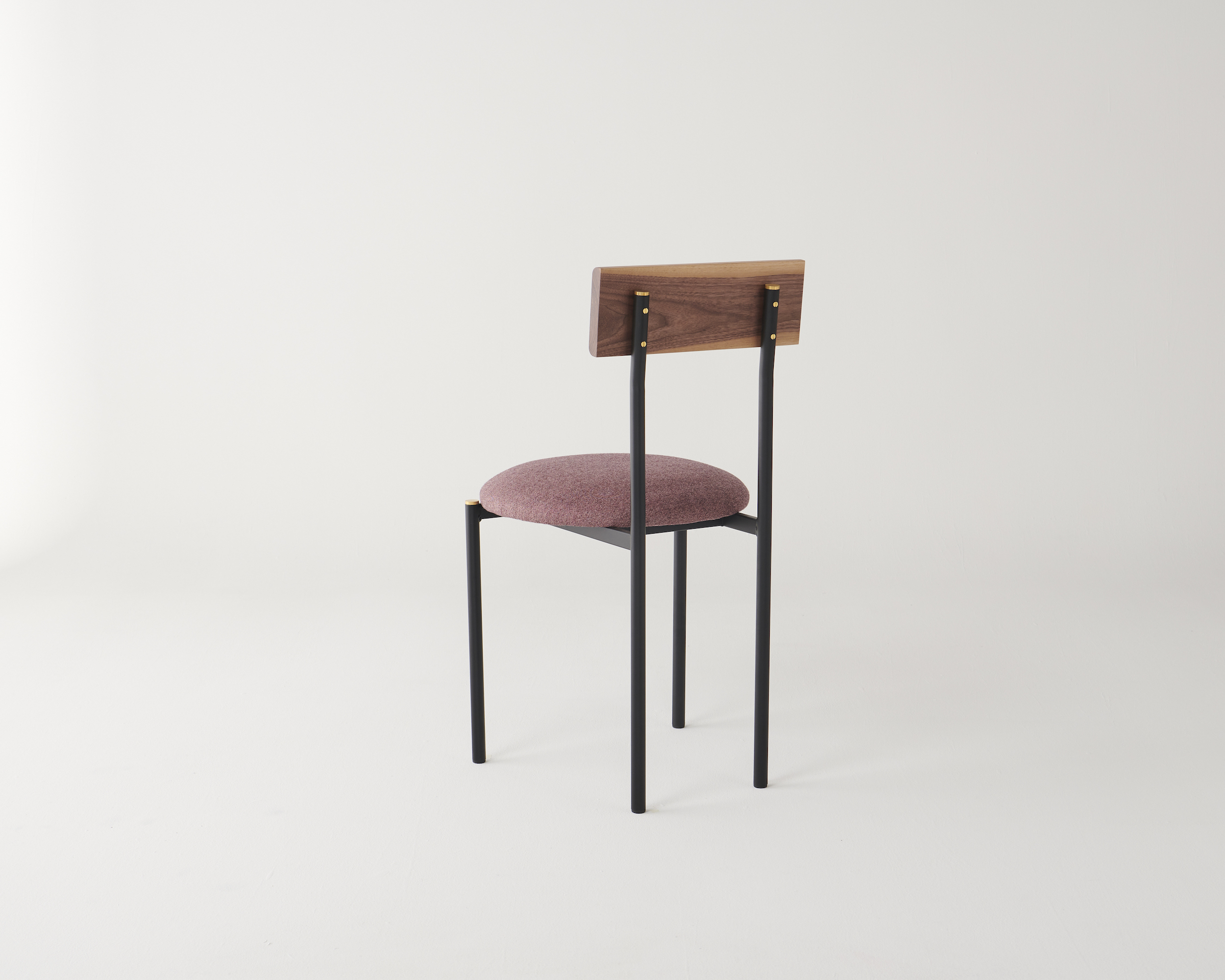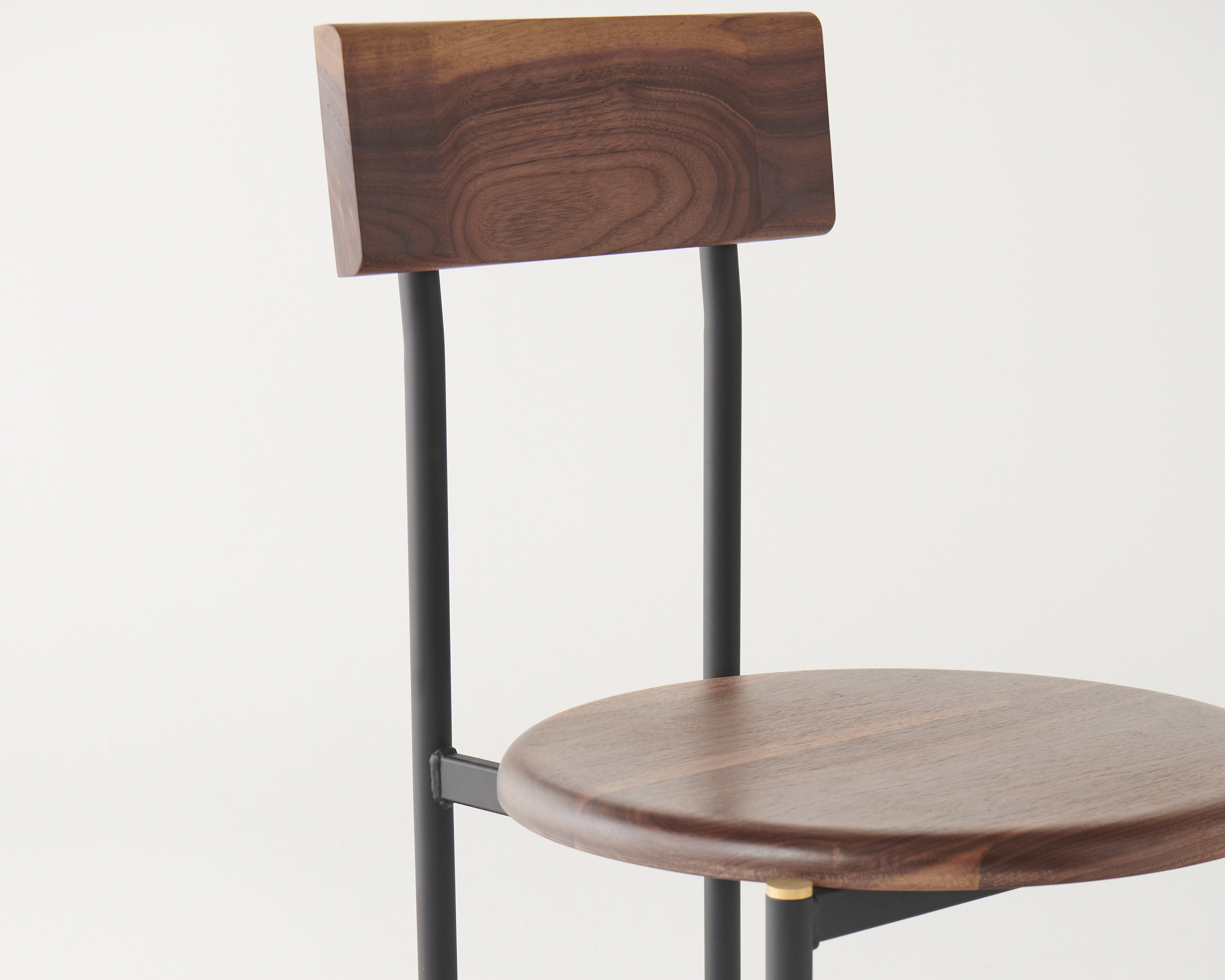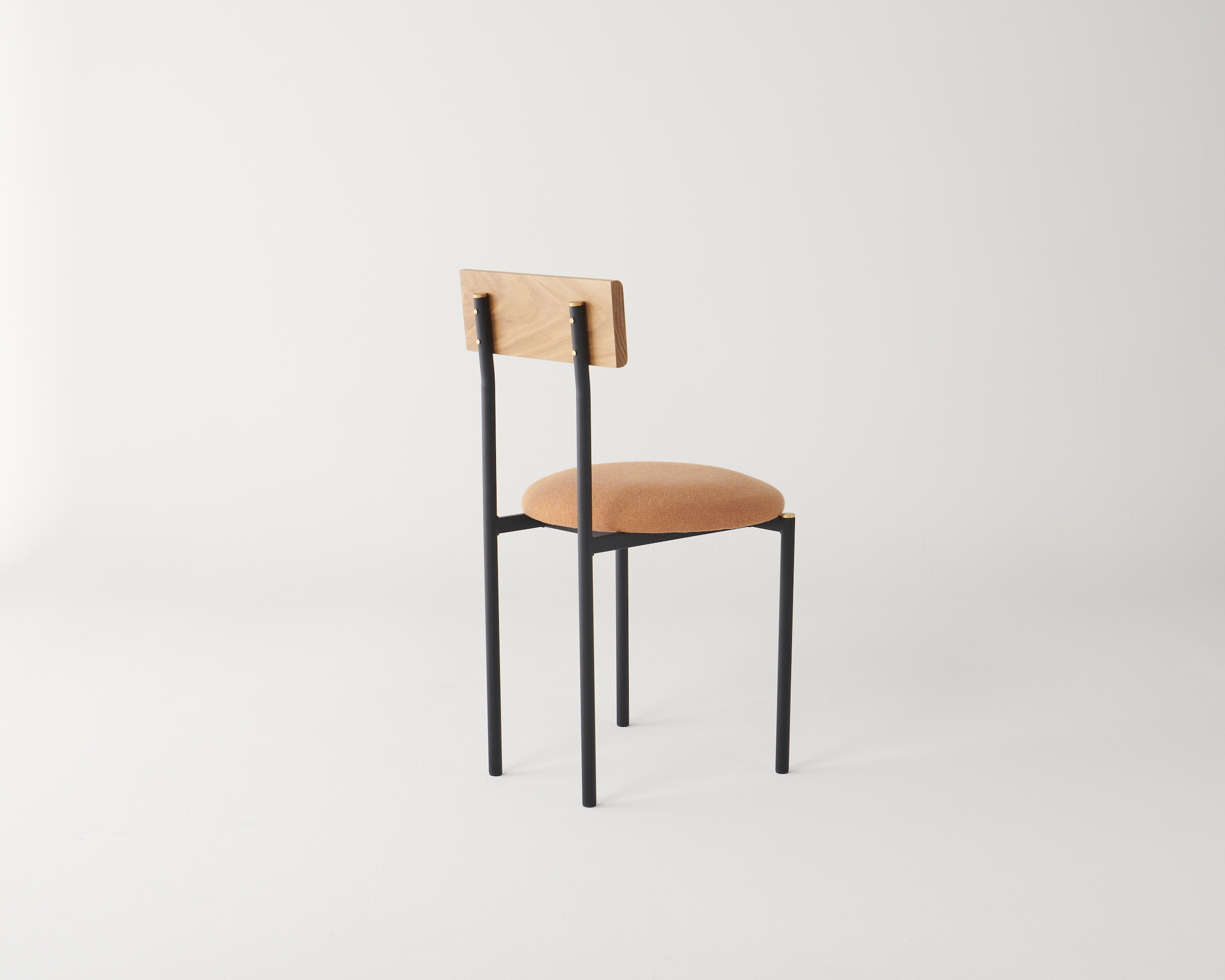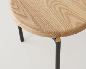 Brass details are a contrast against the tubular frame and solid timber, left uncoated to patina naturally over time.
