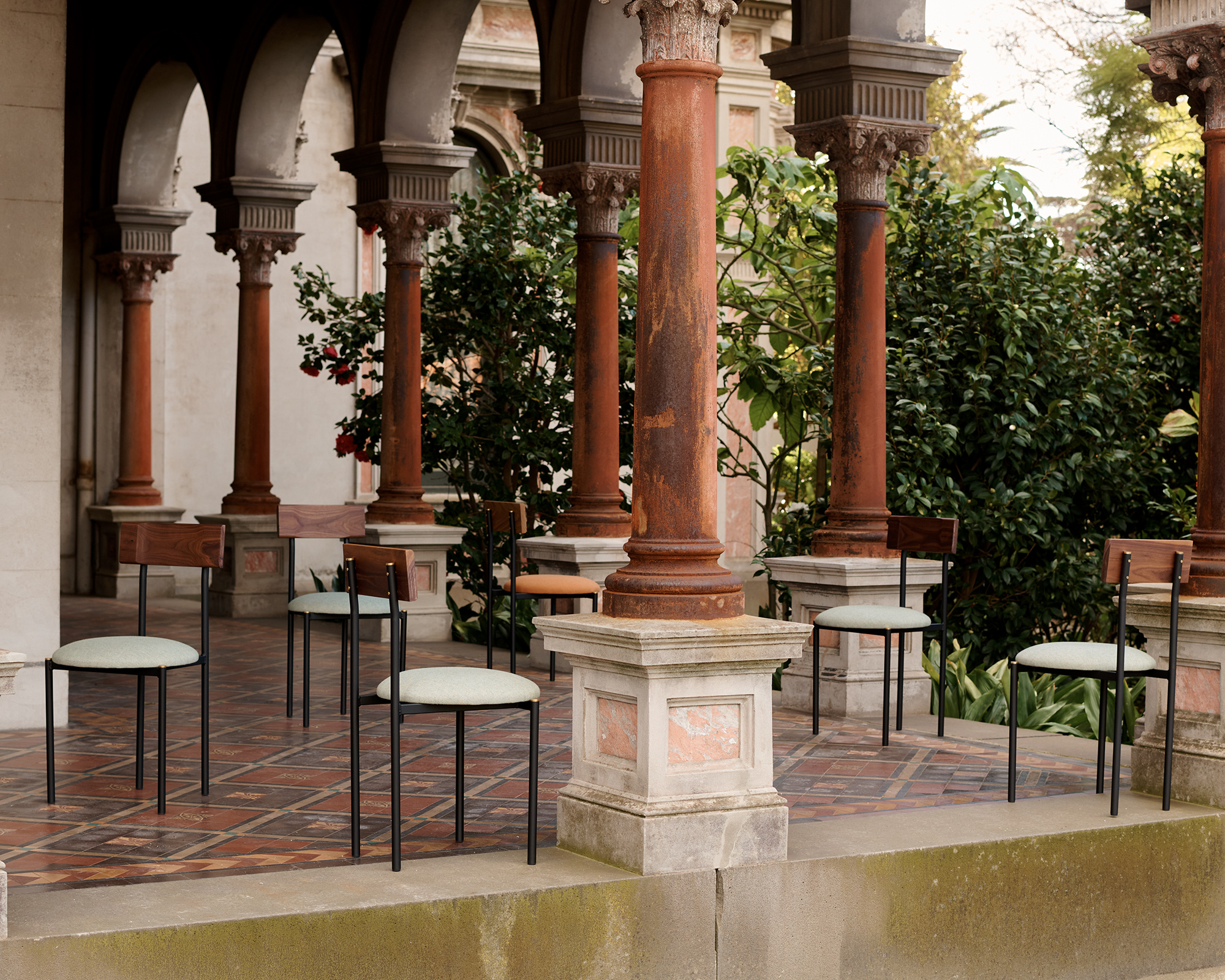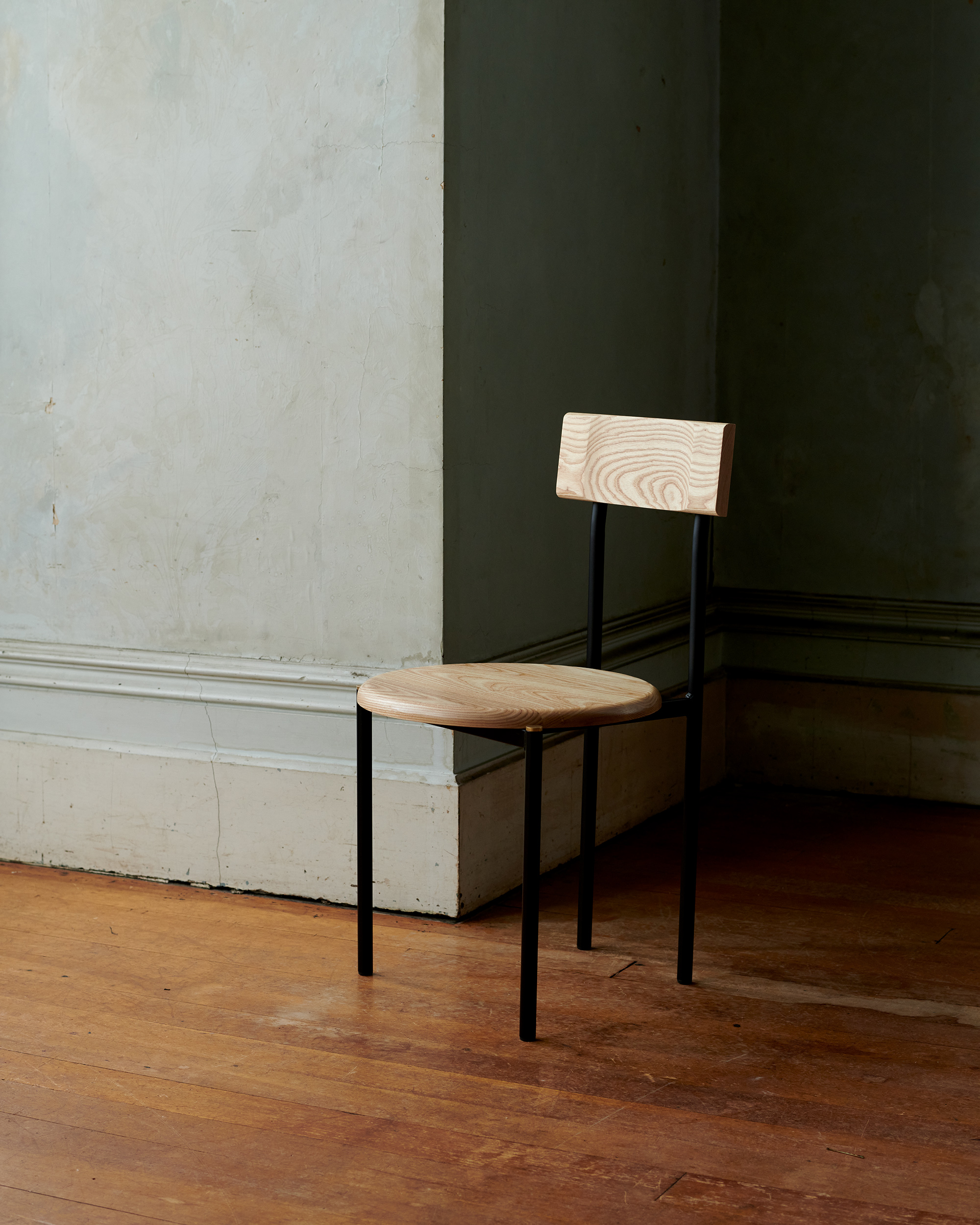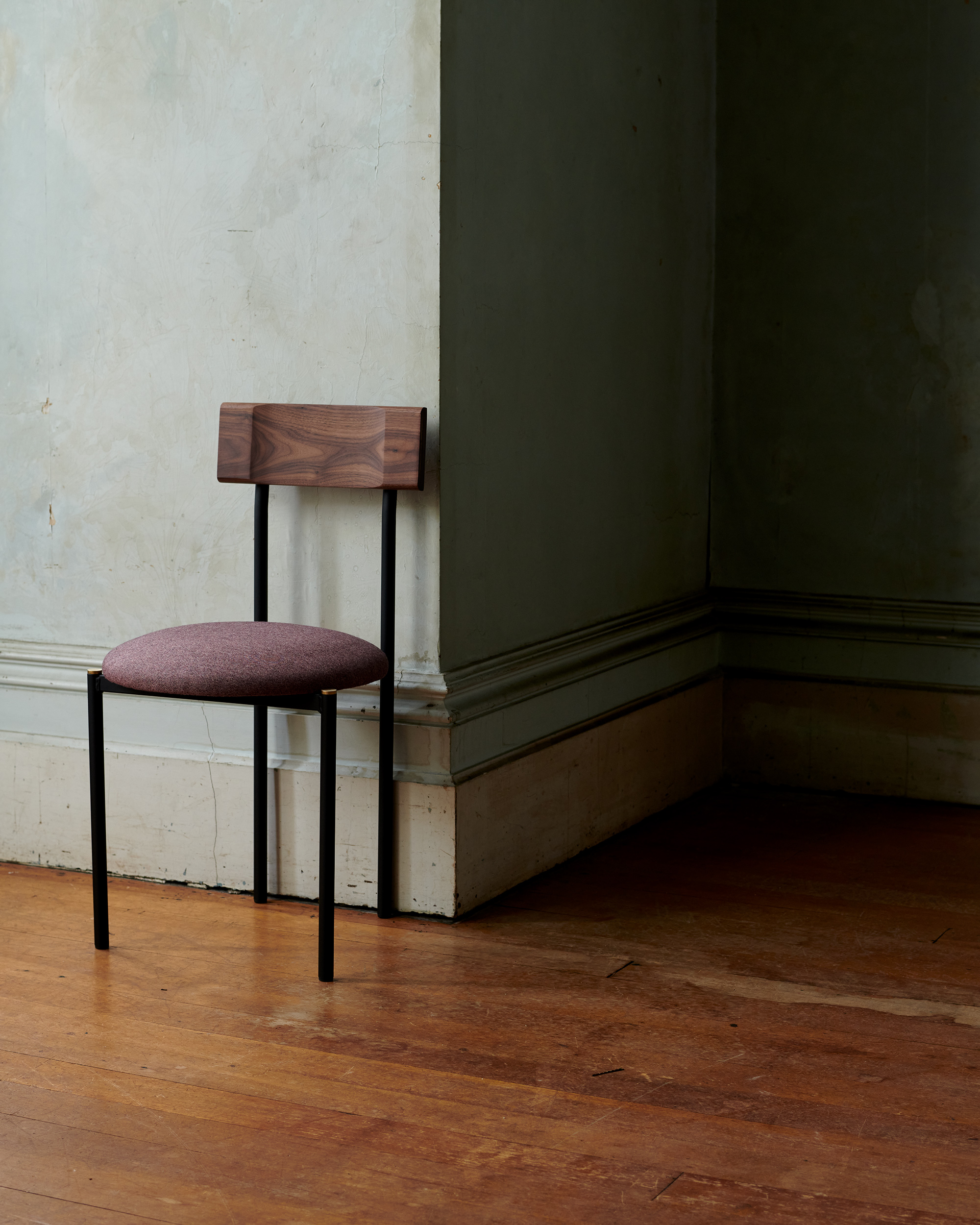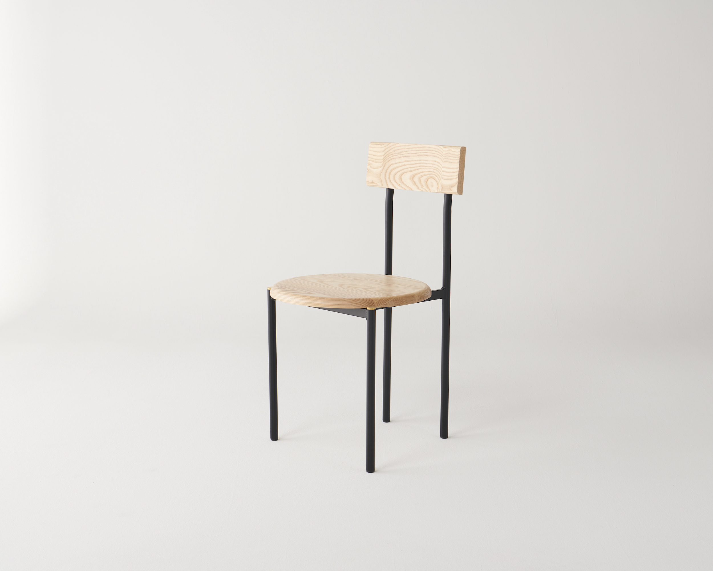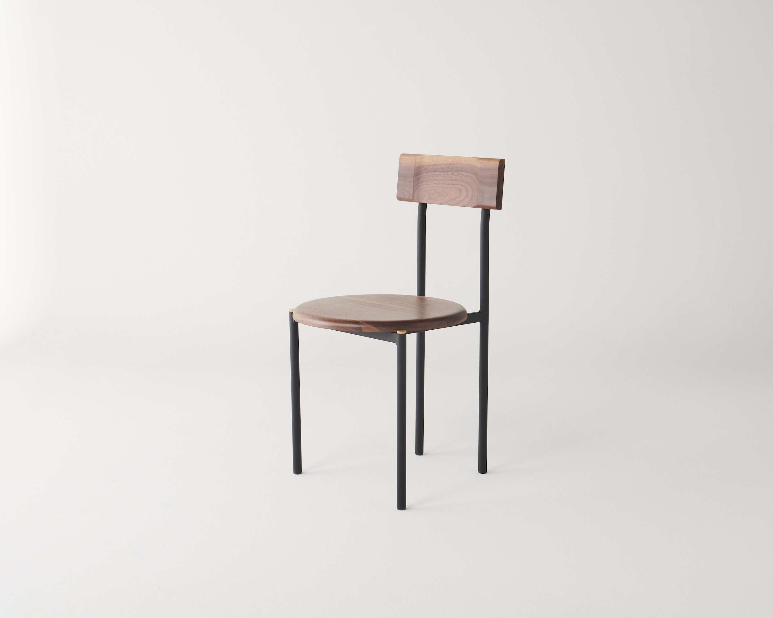 Brass details are a contrast against the tubular frame and solid timber, left uncoated to patina naturally over time.