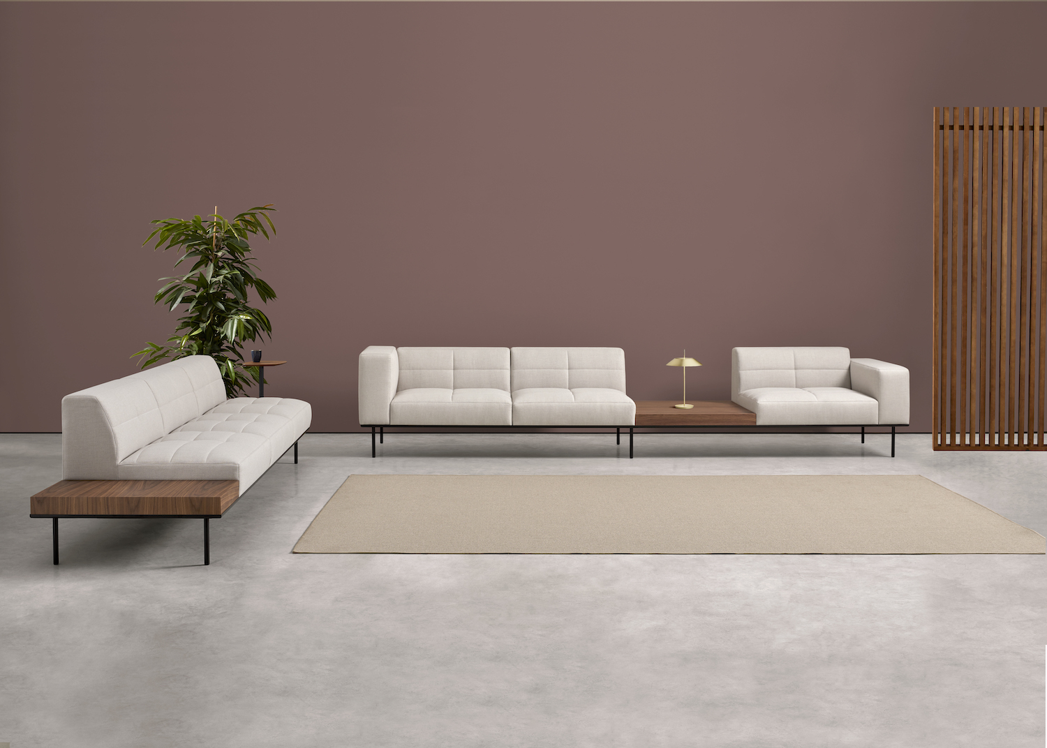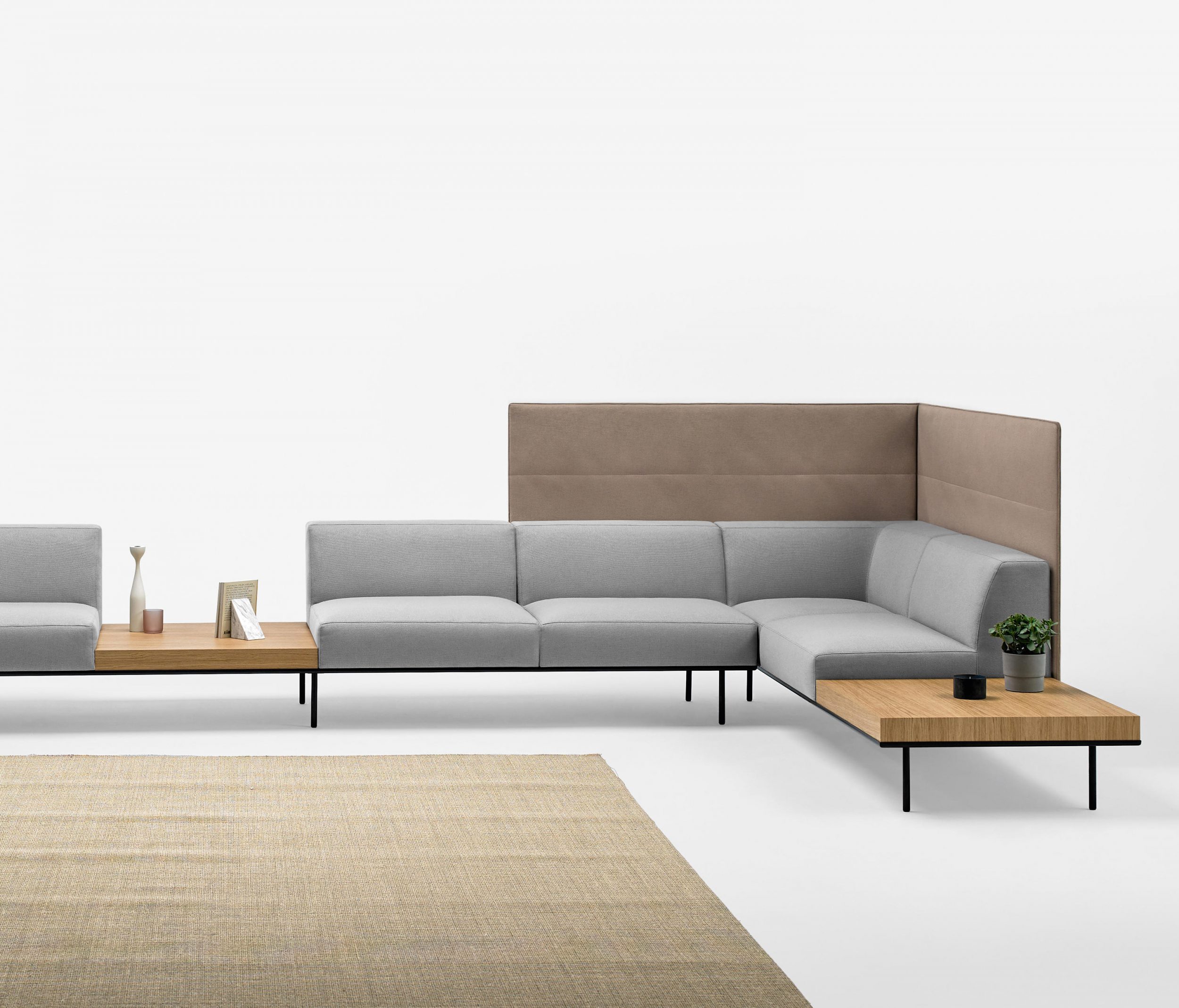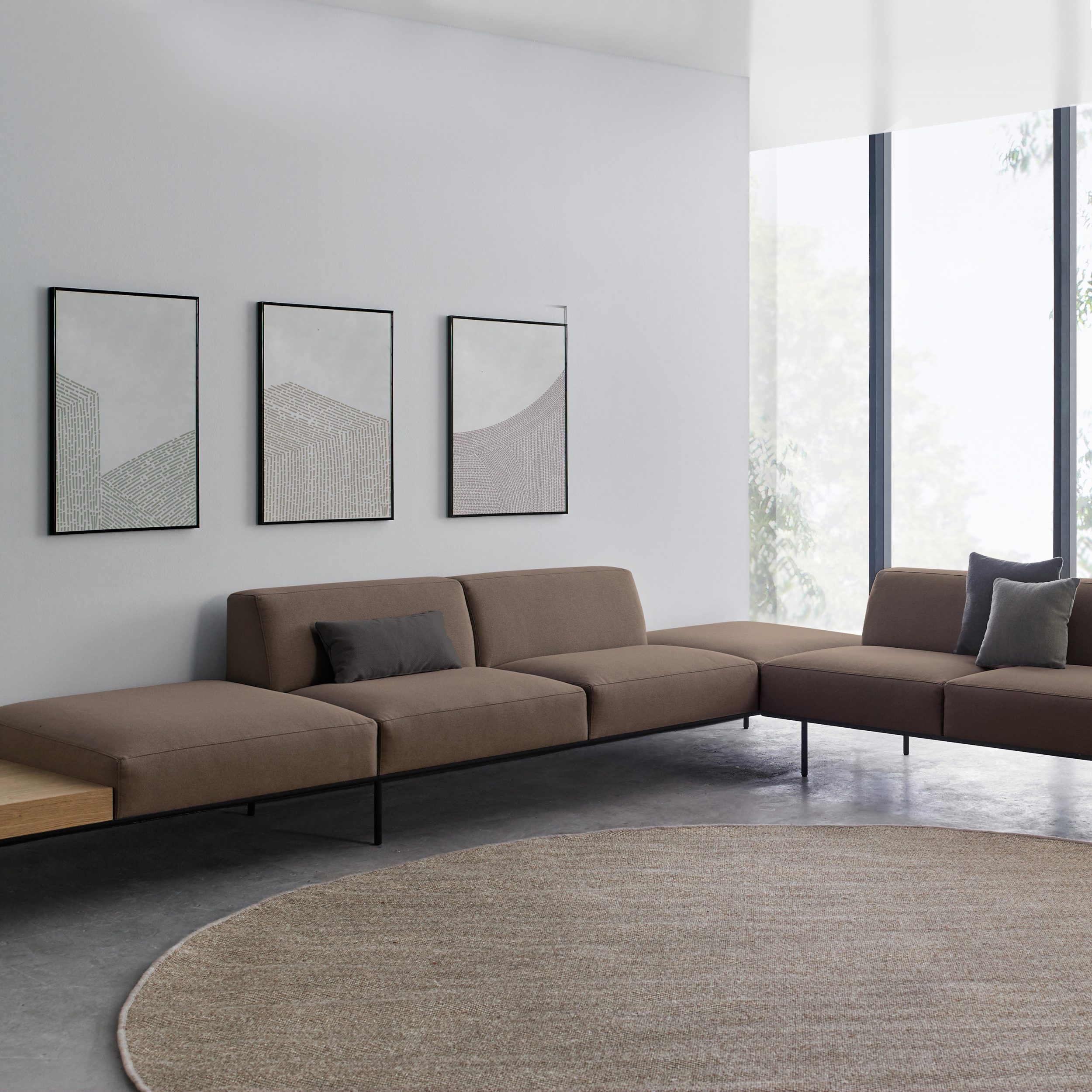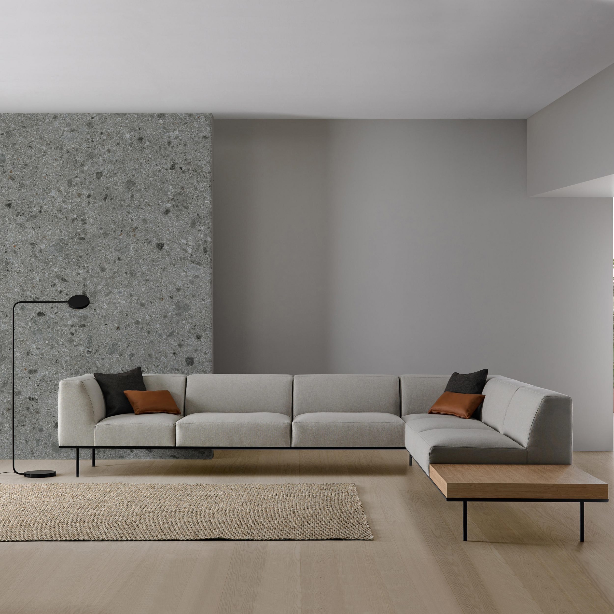 Escala is a very flexible, elegant and cosy modular sofa that originates in the combination of different upholstered elements and accessories with sleek horizontal platforms in an aluminium profile. The result is a highly customisable collection of sofas that stands out for its visual lightness, refined shape and timeless design. The geometry and precise proportions, together with the broad range of elements available, allow for endless configurations to facilitate their integration in different contexts and settings both in public and private spaces.