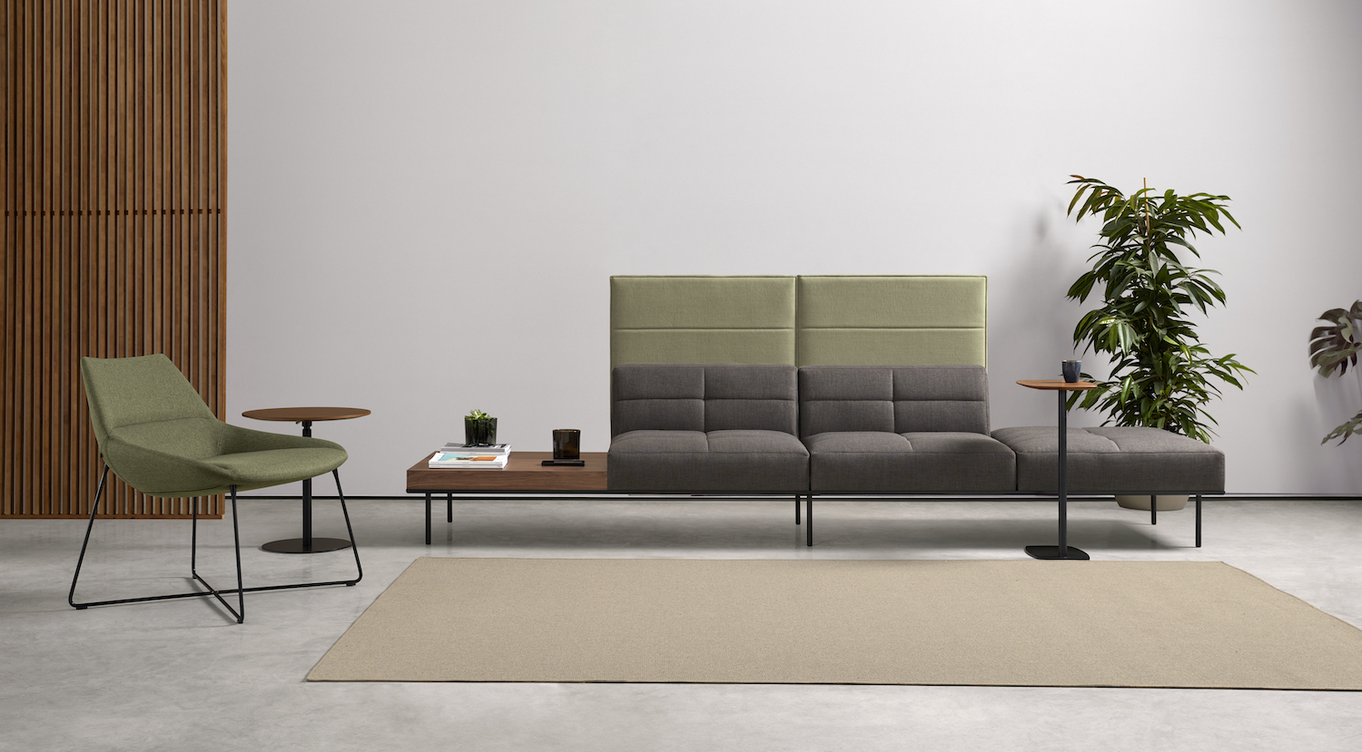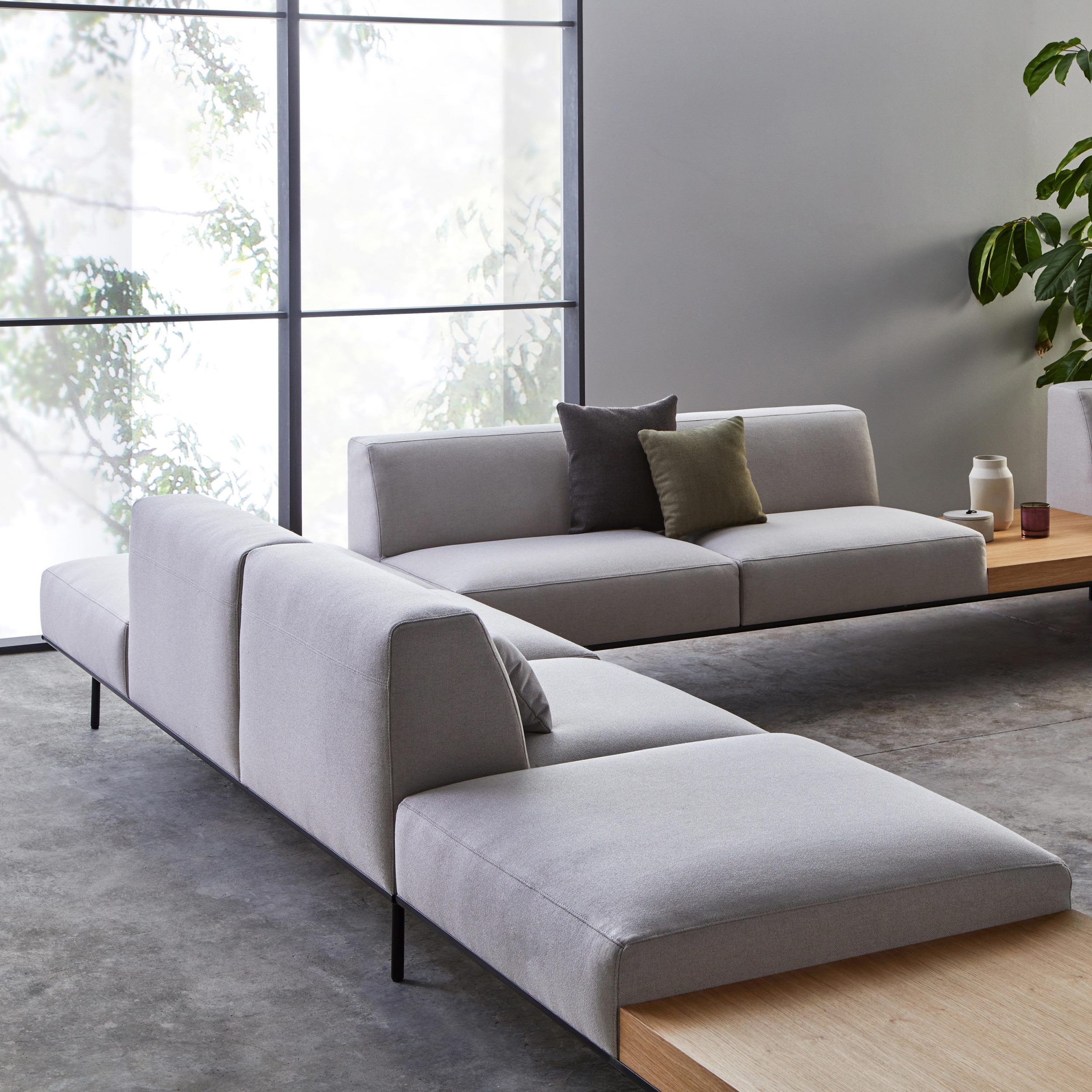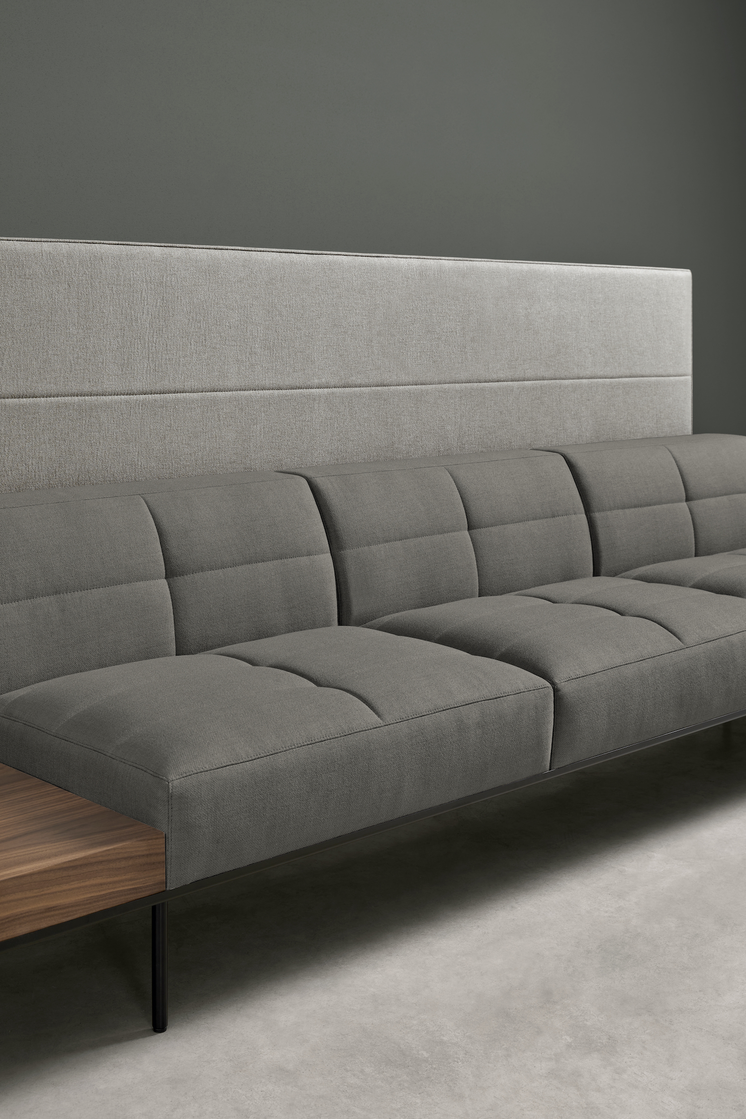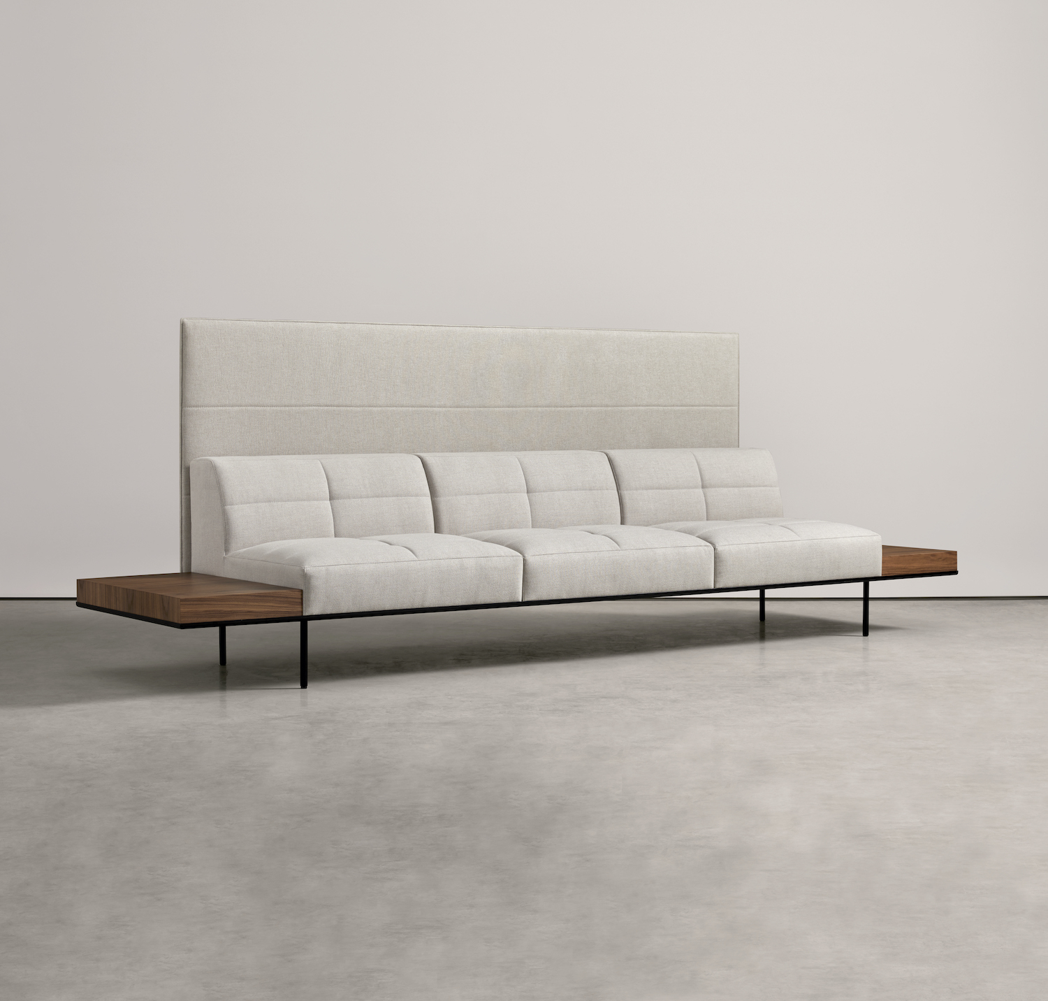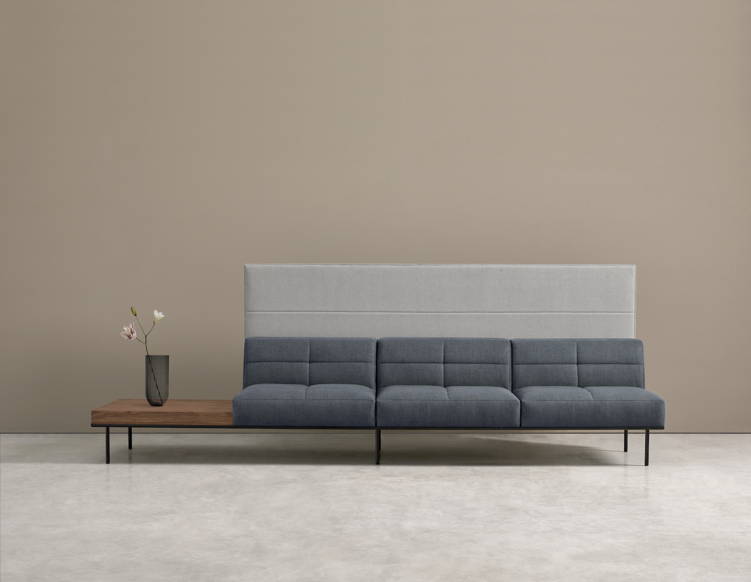 Escala is a very flexible, elegant and cosy modular sofa that originates in the combination of different upholstered elements and accessories with sleek horizontal platforms in an aluminium profile. The result is a highly customisable collection of sofas that stands out for its visual lightness, refined shape and timeless design. The geometry and precise proportions, together with the broad range of elements available, allow for endless configurations to facilitate their integration in different contexts and settings both in public and private spaces.