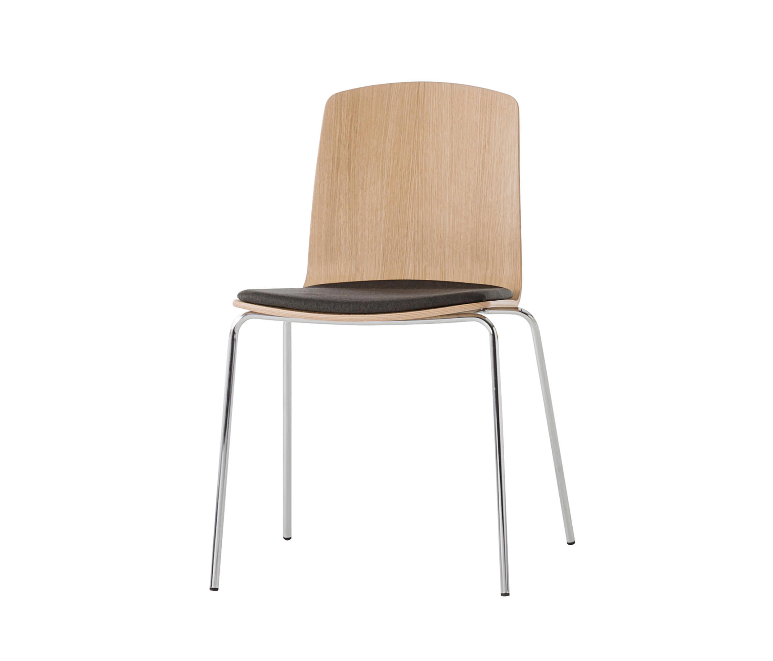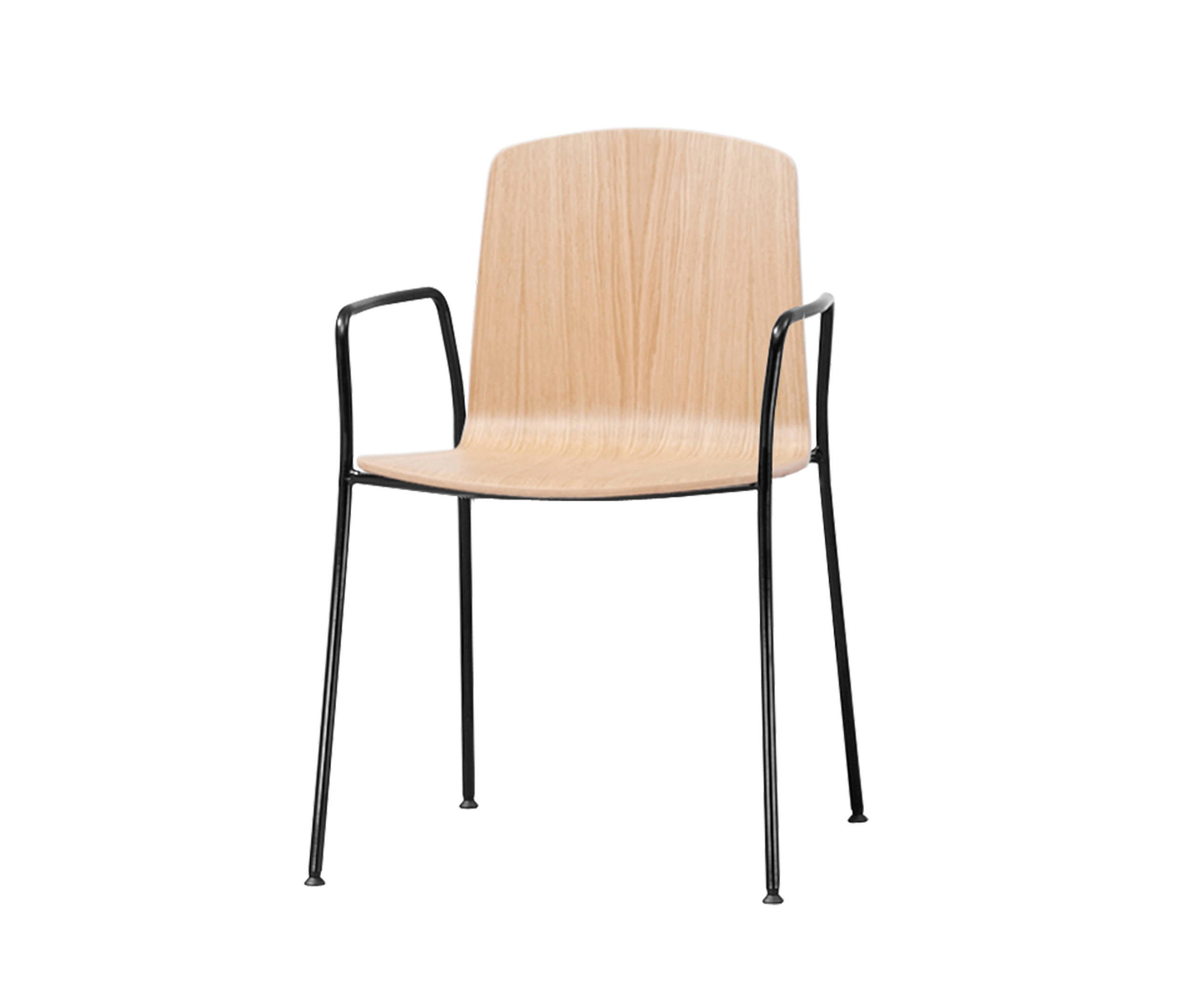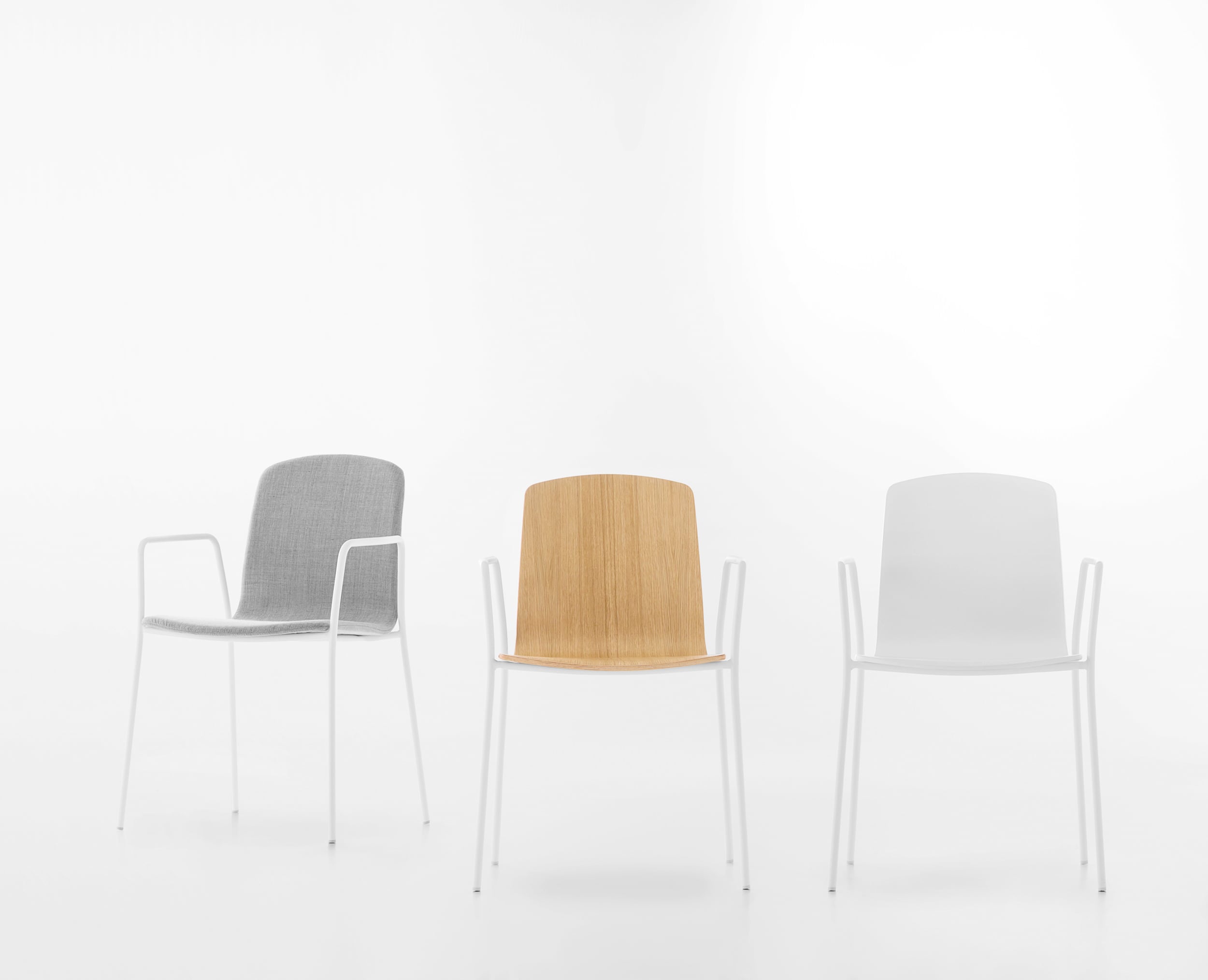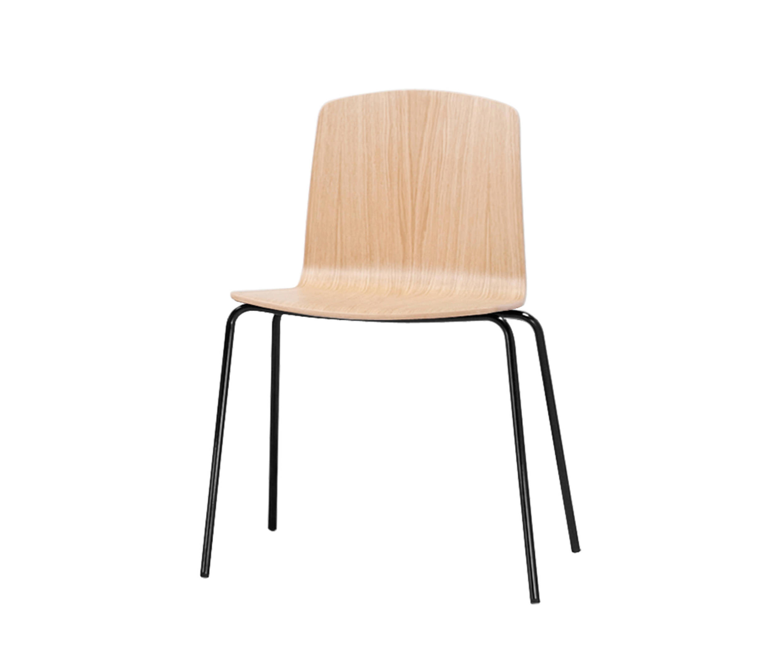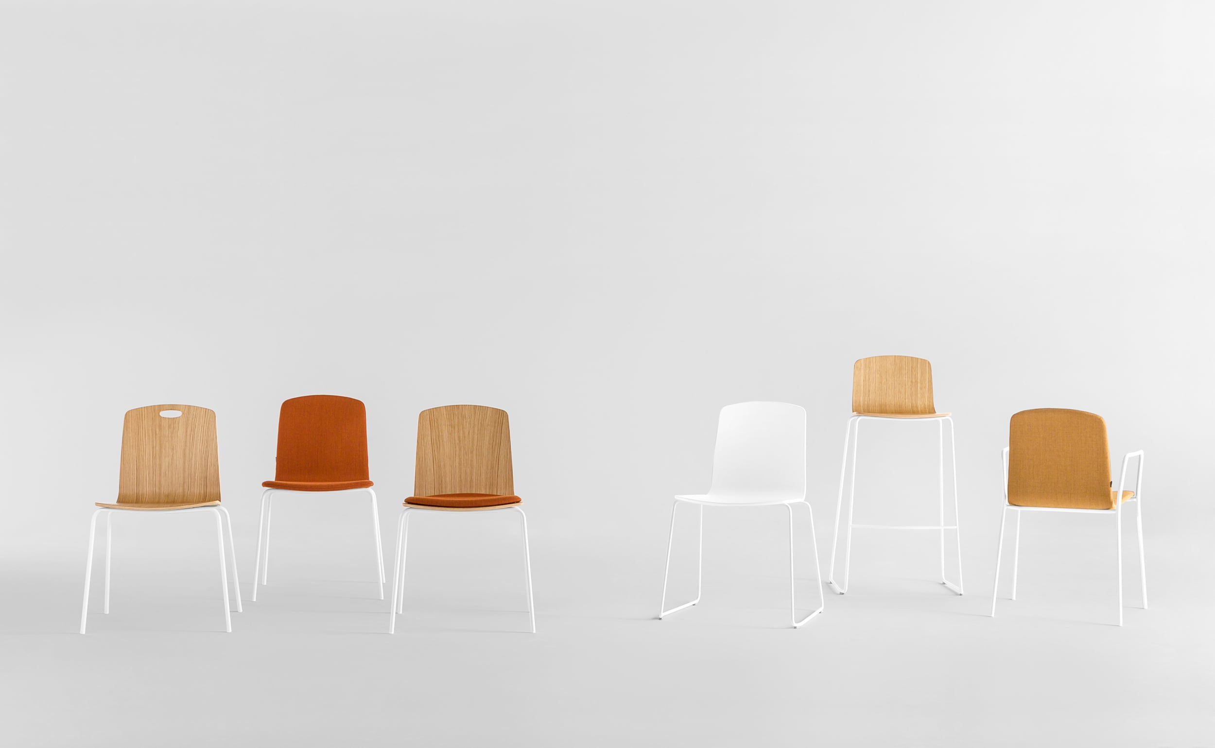 Ann is a collection of versatile chairs with a neutral design, suitable for both public and private spaces. The shells are available in several versions: Veneered, lacquered or upholstered and the timber version is also available with a finger pull on the backrest to allow easy handling.