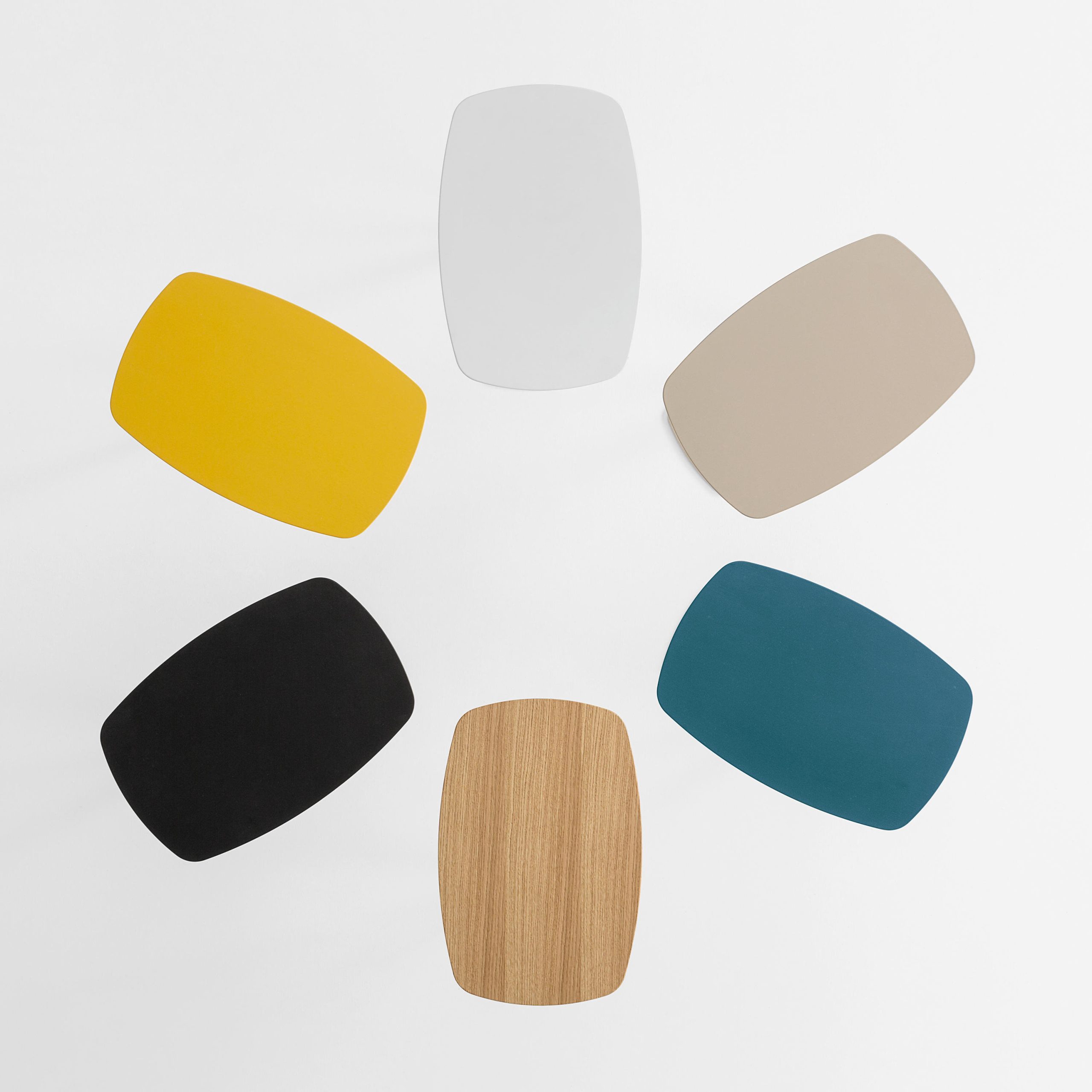 The tops have an elegant beveled edge and are available in natural oak or walnut veneer which can be lacquered to a wide range of colours. Functionality, essential design and the wide range of finishes available make Lan ideal for use in all kinds of contexts and spaces.