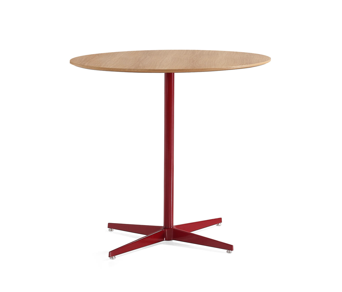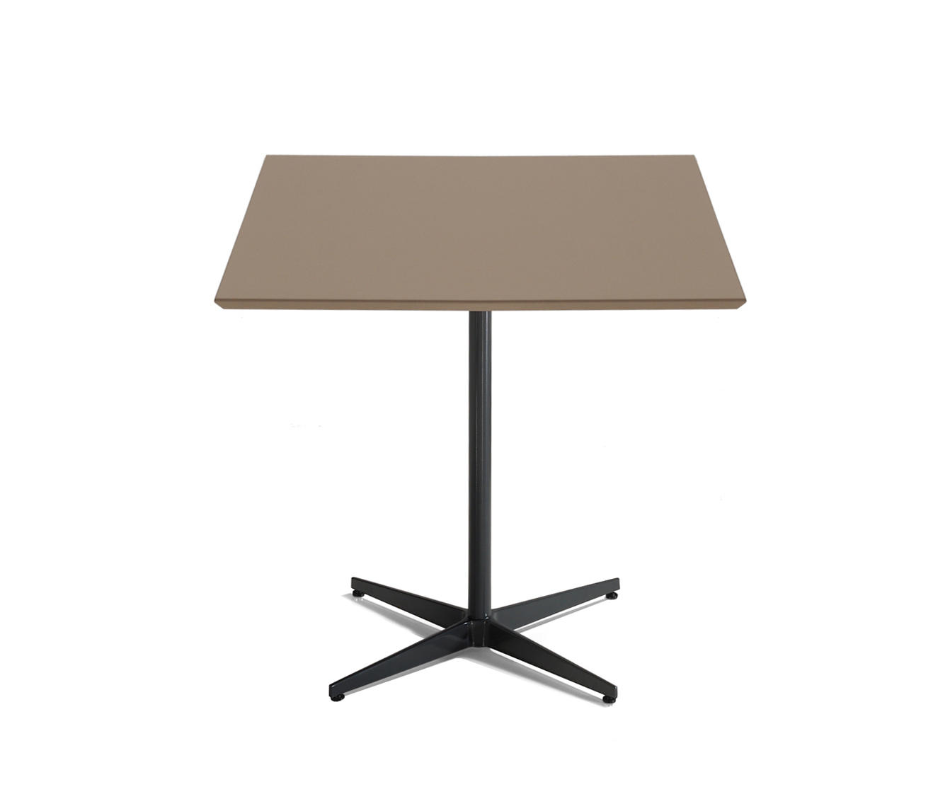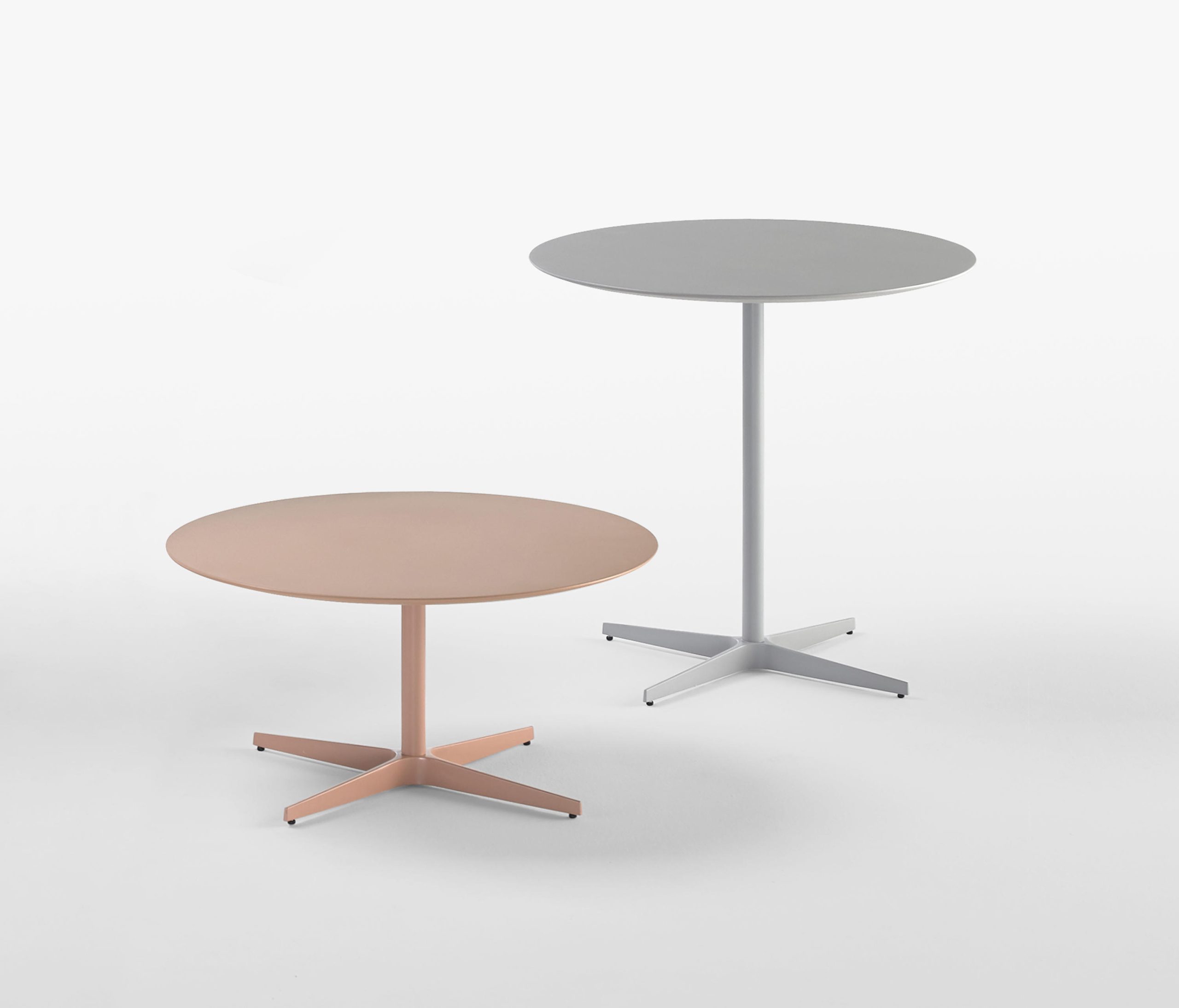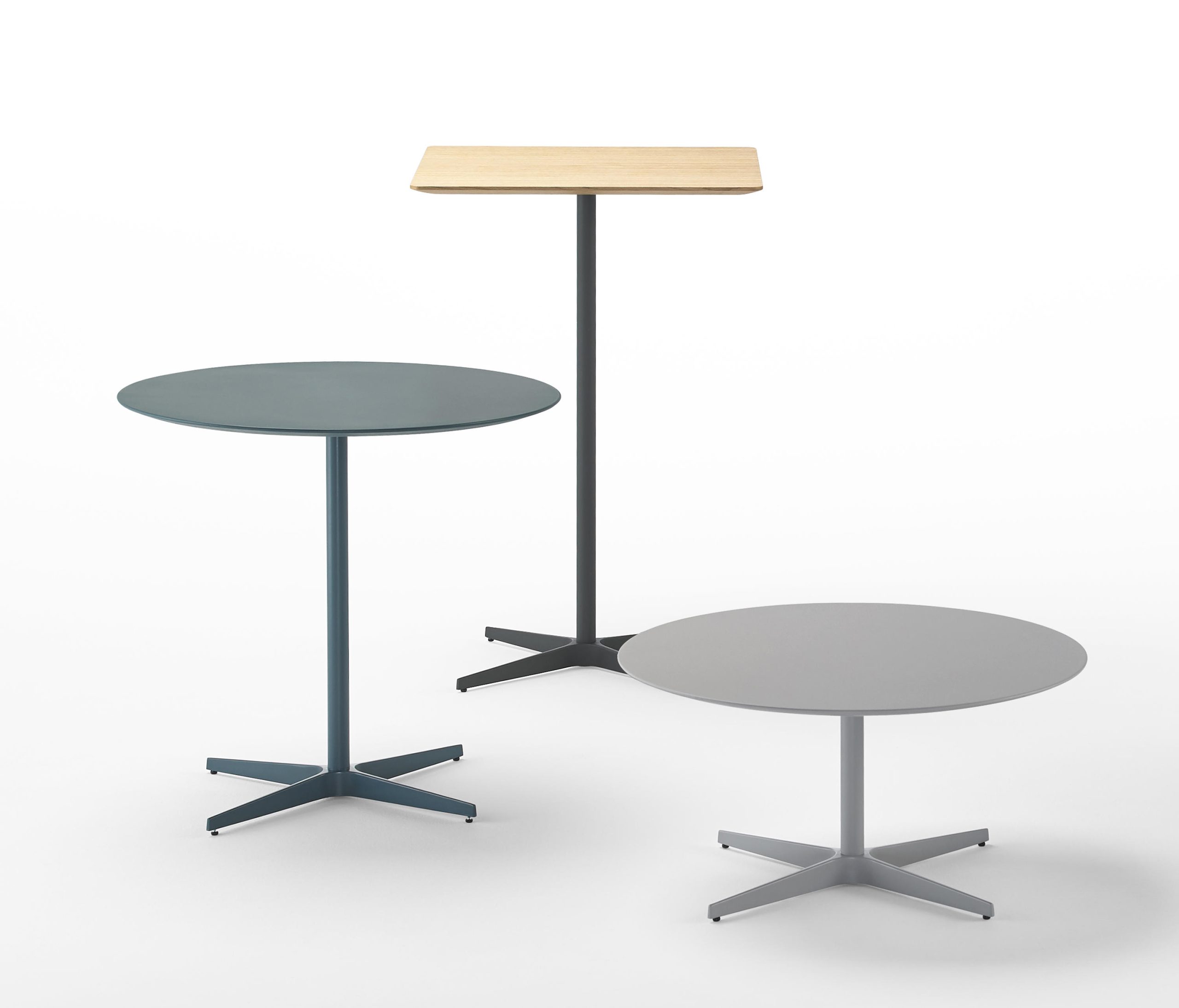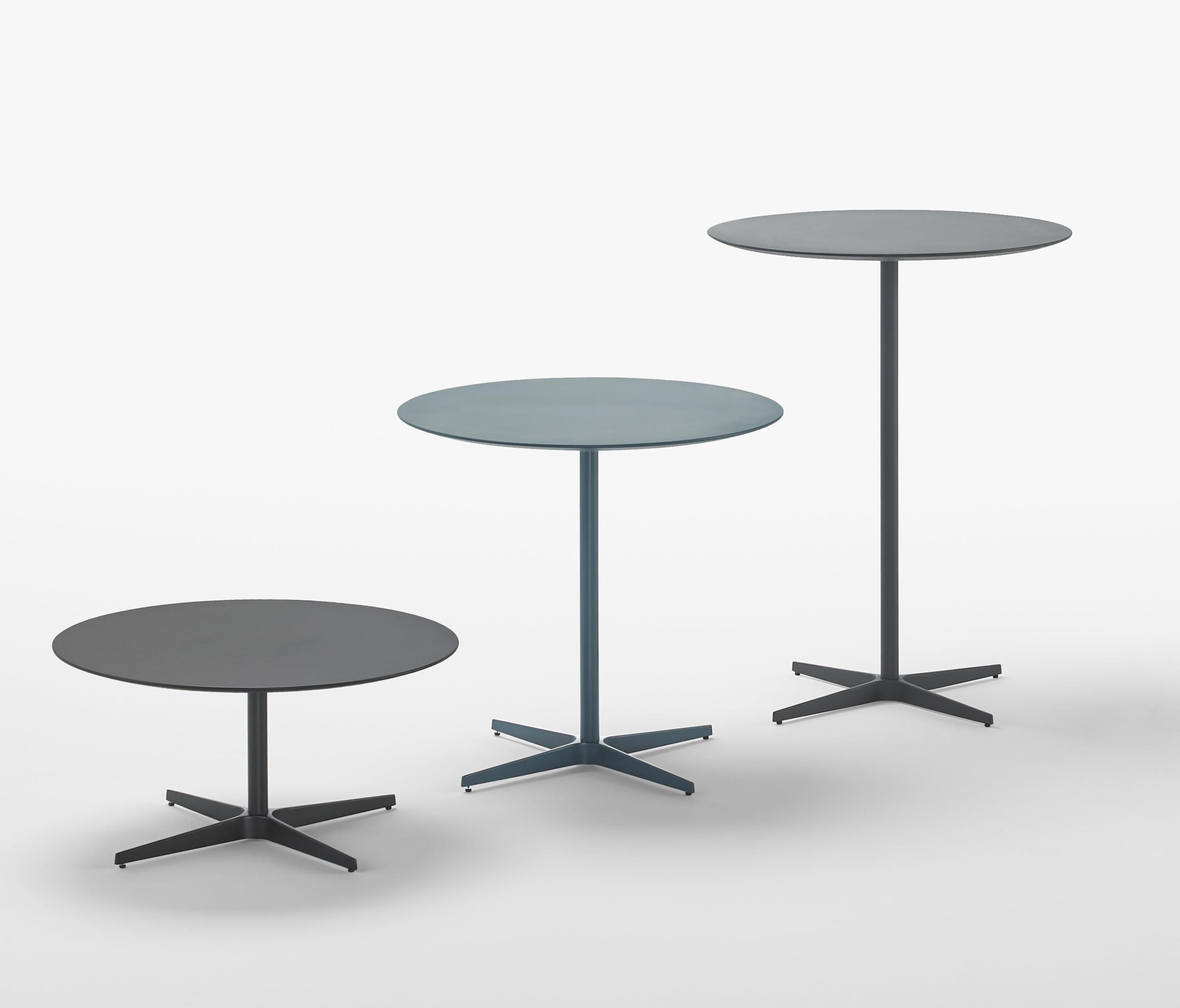 The tables are characterised by their original four-spoke central base in die-cast aluminium that can be combined with round or square tops available in different sizes and materials. Malibu tables are produced in occasional, cafe and bar heights.