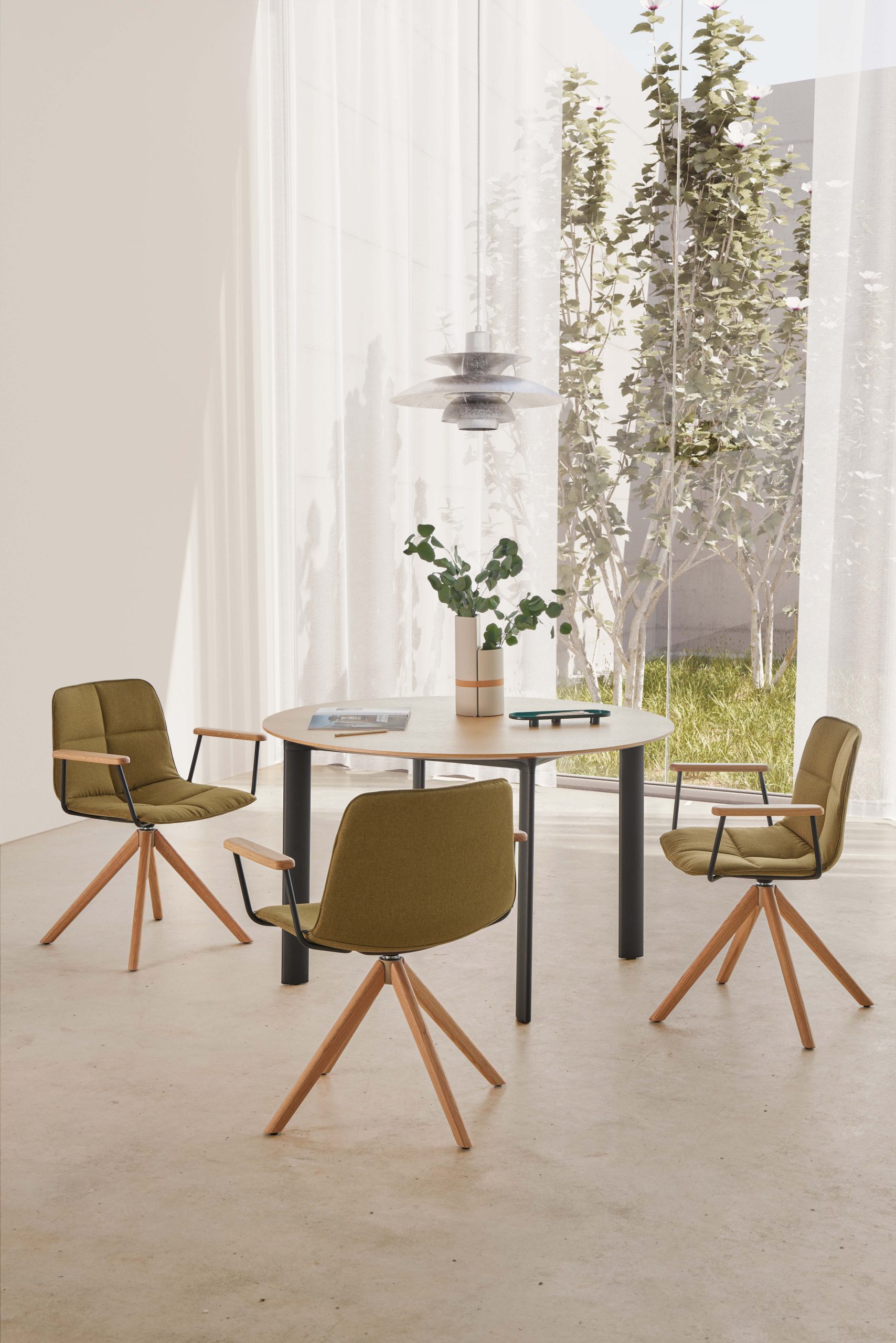 Varya is available with the following base options; 4 Leg (metal and timber), Sled, 4-Way Swivel and 4-Way or 5-Way on castors. Beam seating is also available. All chairs are available with or without arms, and in selected house colours or finishes.