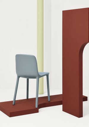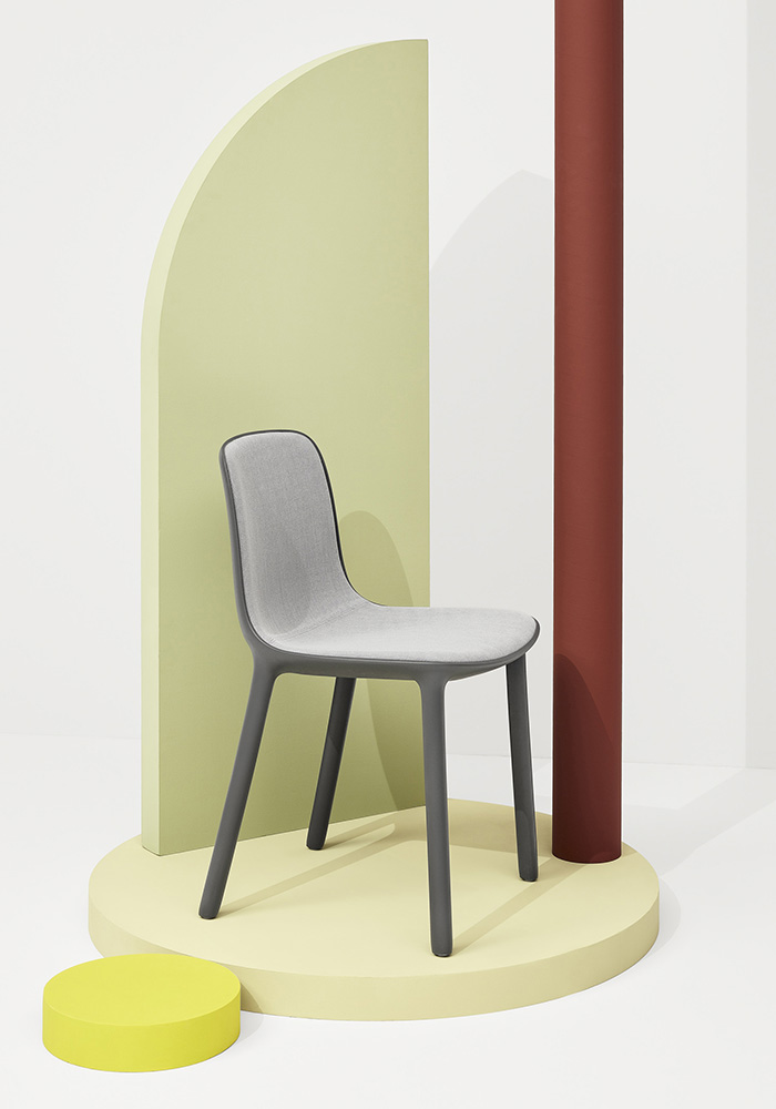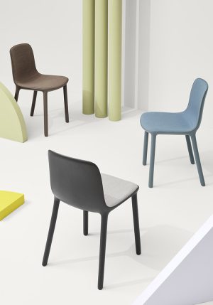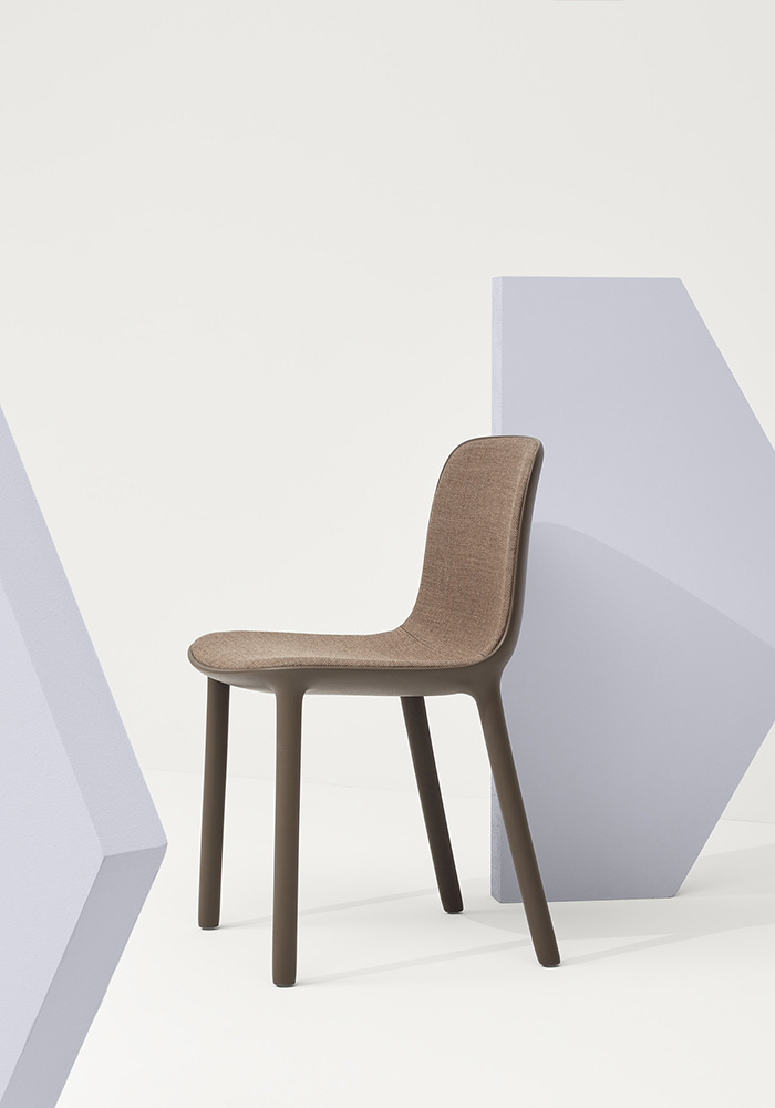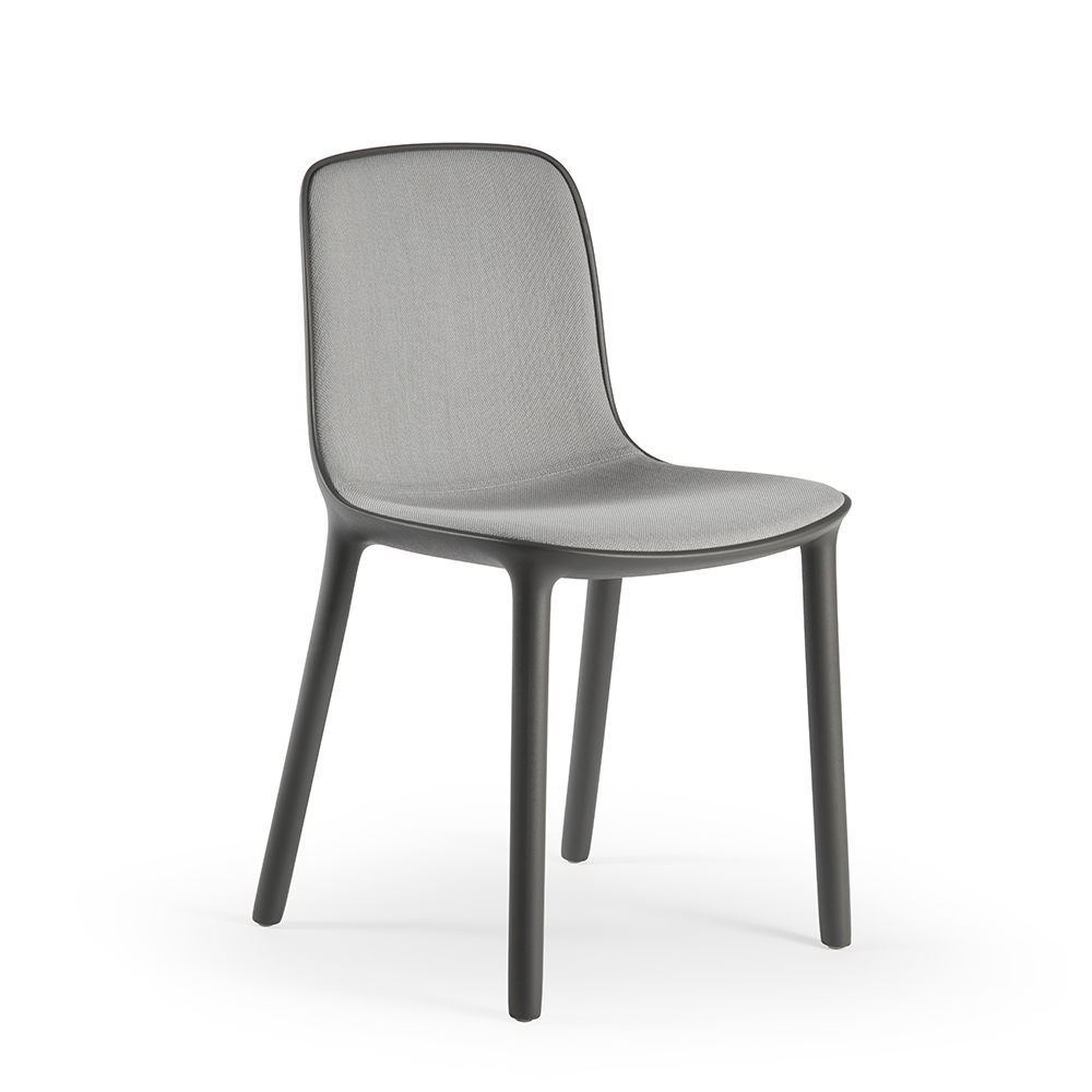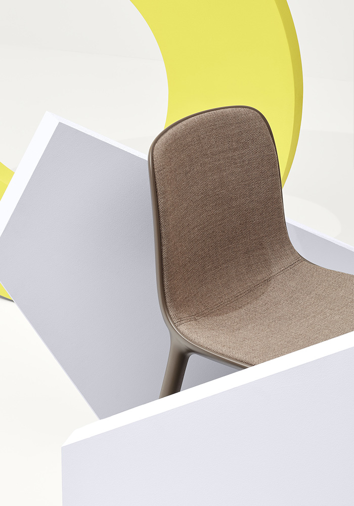 Freya is an expression of pure and linear design, in which shape and functionality go hand in hand. Innovation is expressed through the design: for the first time, a monoblock chair is presented in recycled plastic with an upholstered internal shell. The gentle curvature of the injection-moulded frame embraces and accommodates soft upholstery, creating continuity and extreme comfort.