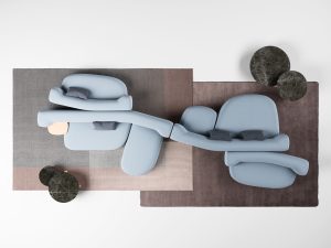 Dorothea, a Lithops-inspired design, combines the organic forms of “living stones” succulents. Its asymmetrical, planar seat is embraced by a sculptural backrest, transitioning from slender in the middle to wider at the ends, crafting an inviting interplay of soft curves and bold angles.