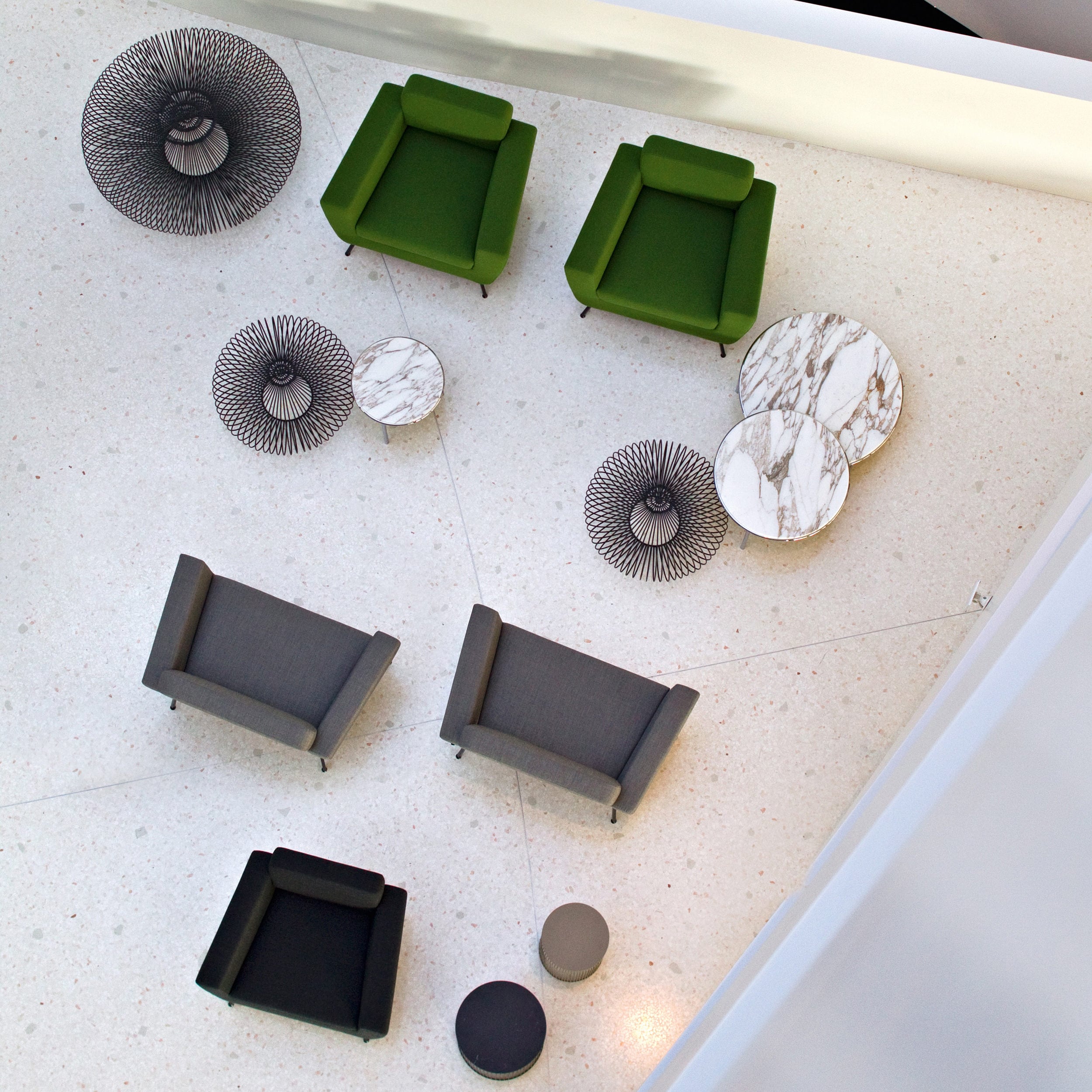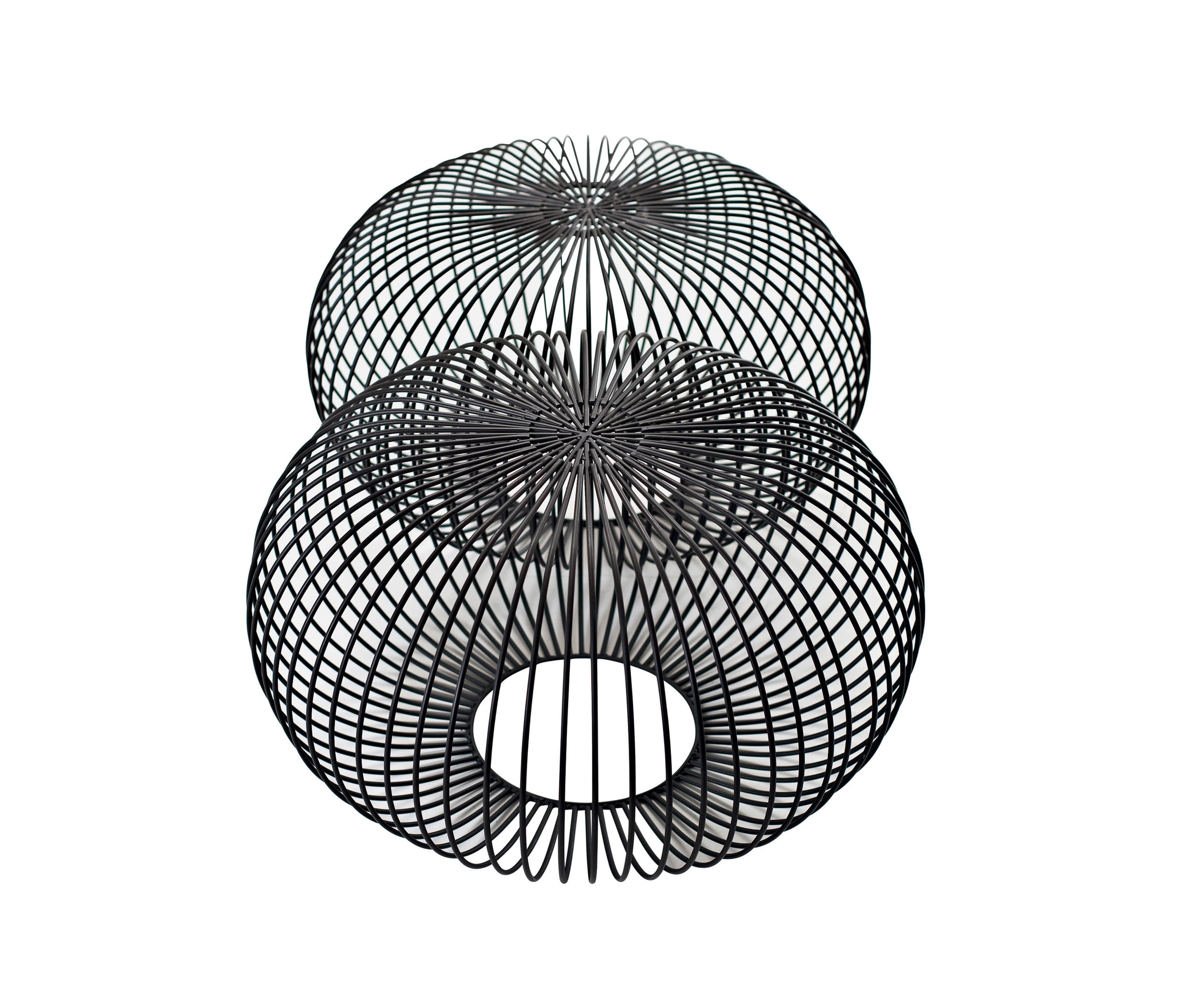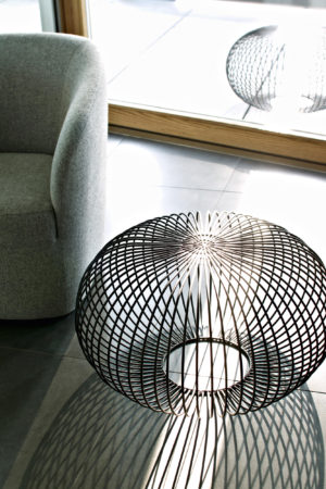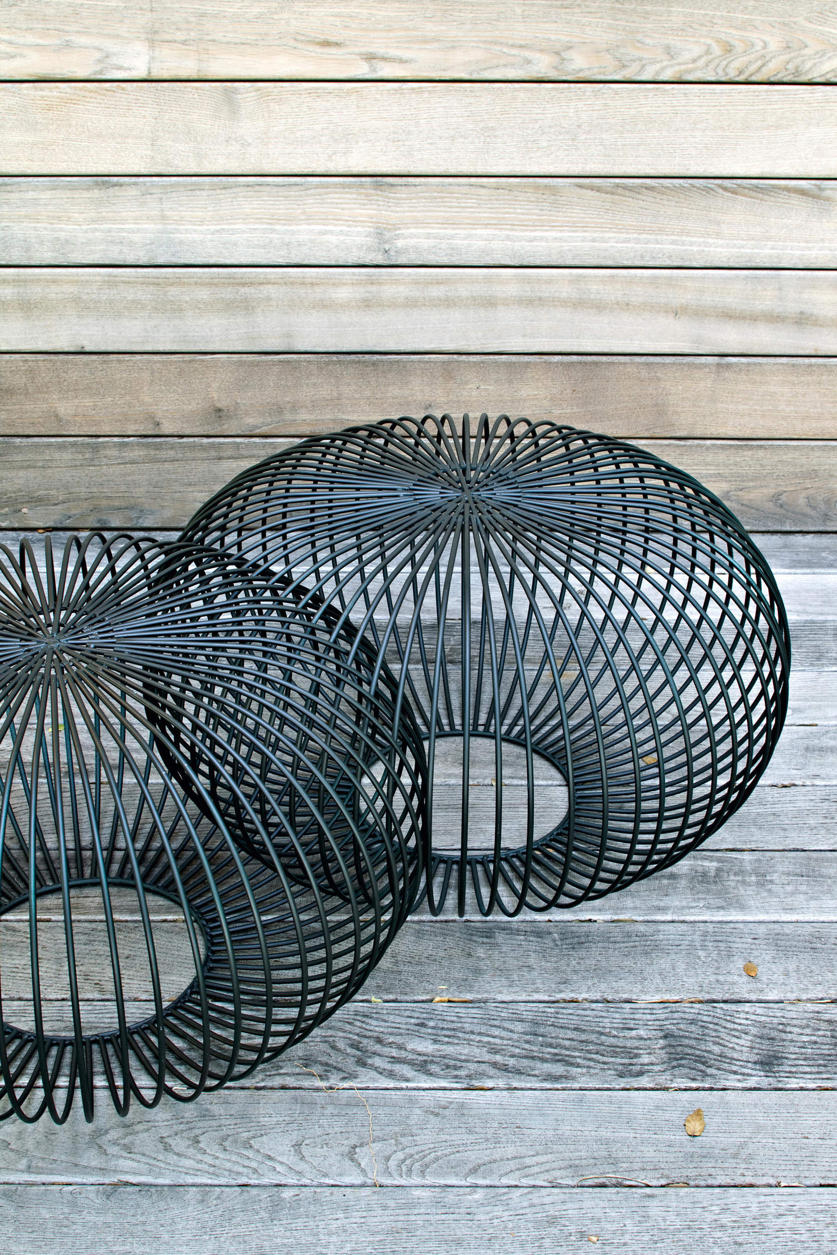 Ploff is a versatile unit that can be used layered together as an ornamental feature, or on its own as a seat. Completely hand made in solid round steel rod with matt powdercoat finish suitable for indoor or outdoor use, Ploff is of sturdy construction and would survive any high traffic contract environment.