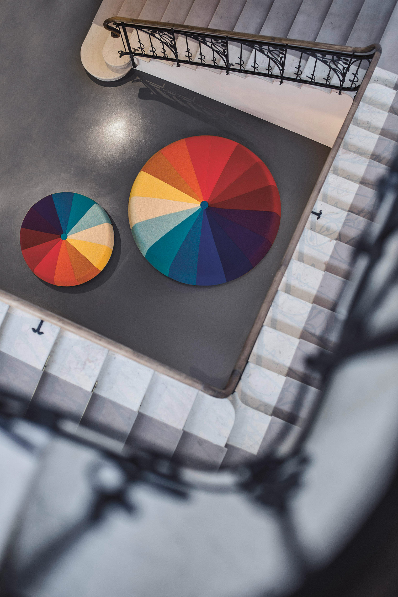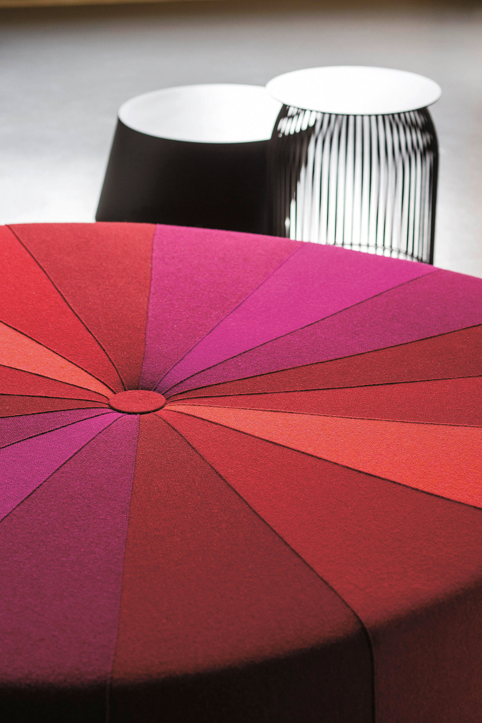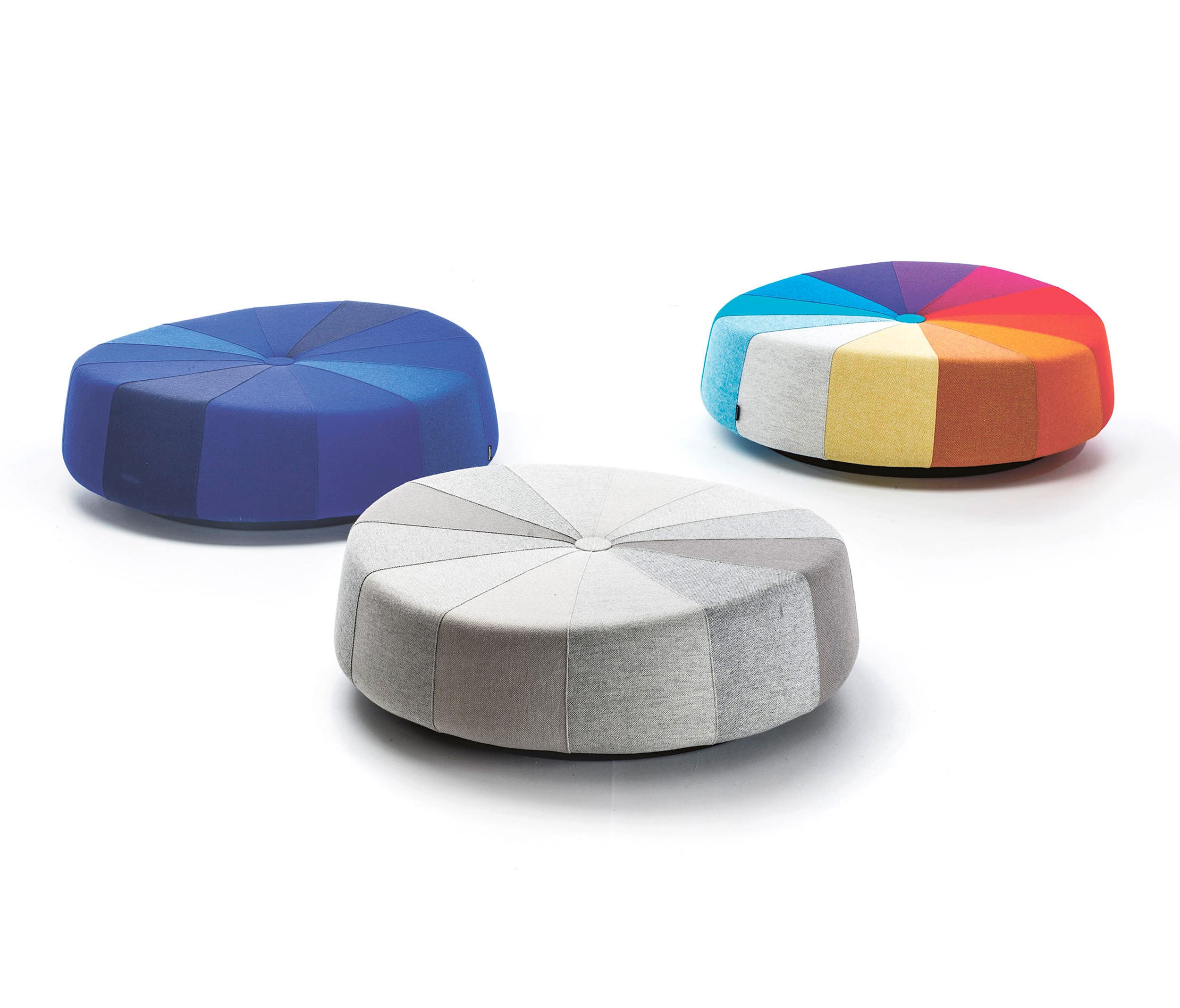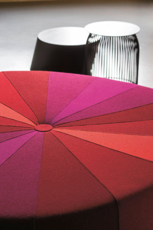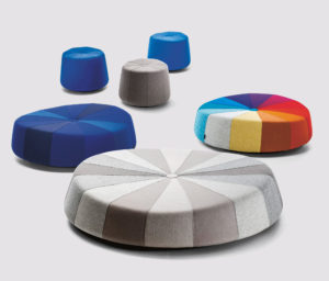 As its name would suggest, this delicate, colourful collection of poufs was inspired by the movement and colour of windmills. The curved forms and wedges of colours can form small or large seating islands. Designed for high traffic seating areas and commercial use, the curved shape invites the user to make dynamic, informal use of it.