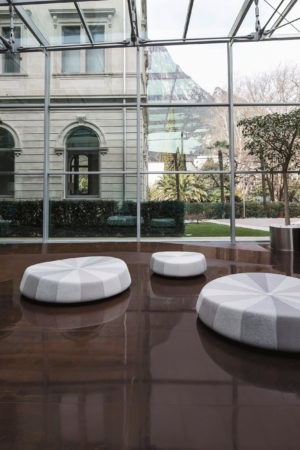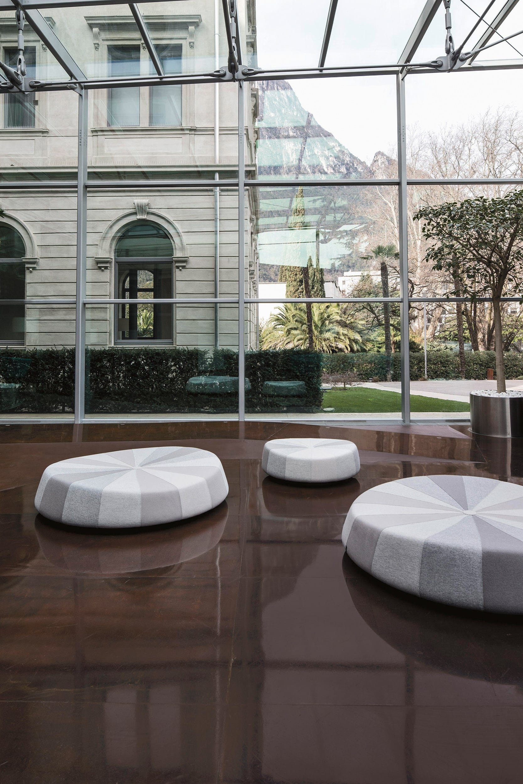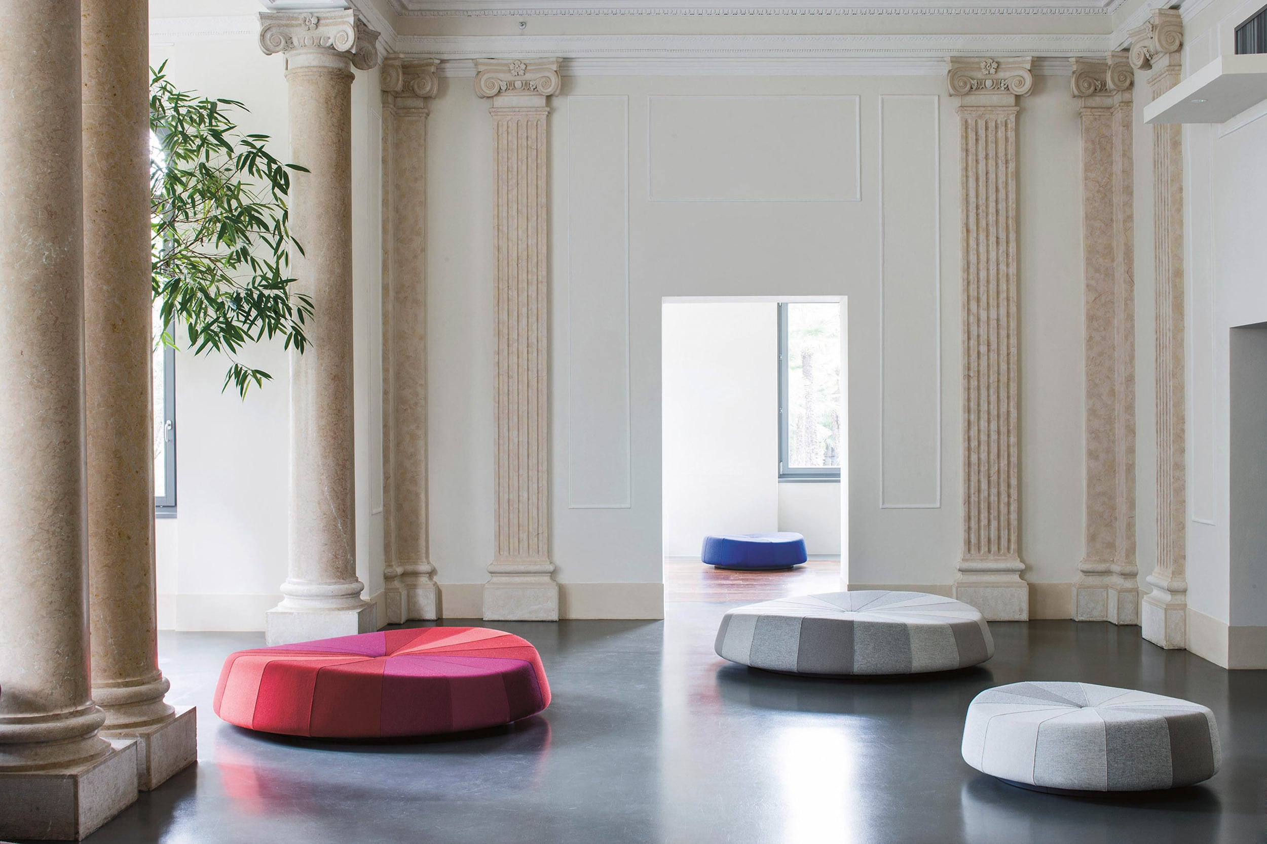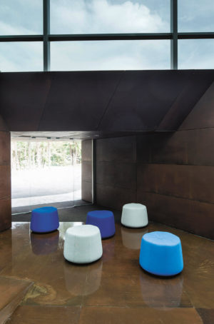 As its name would suggest, this delicate, colourful collection of poufs was inspired by the movement and colour of windmills. The curved forms and wedges of colours can form small or large seating islands. Designed for high traffic seating areas and commercial use, the curved shape invites the user to make dynamic, informal use of it.