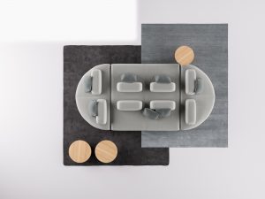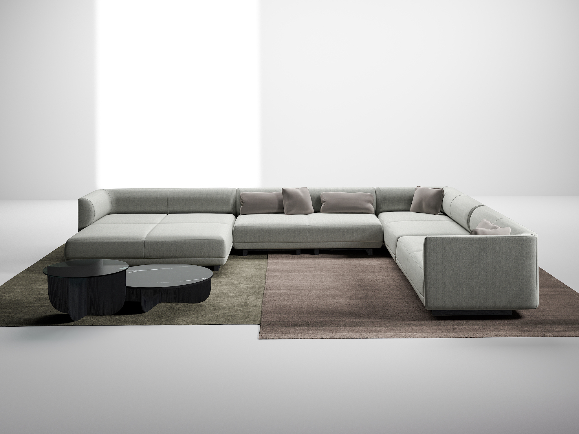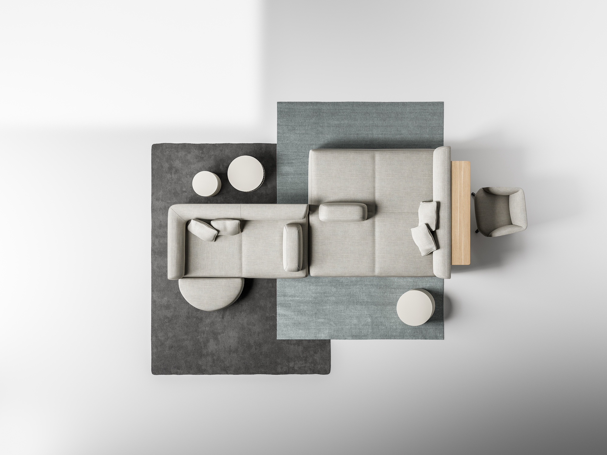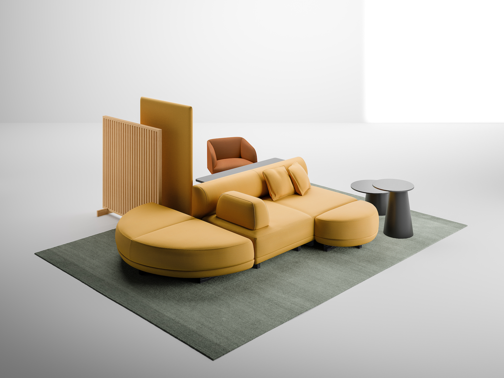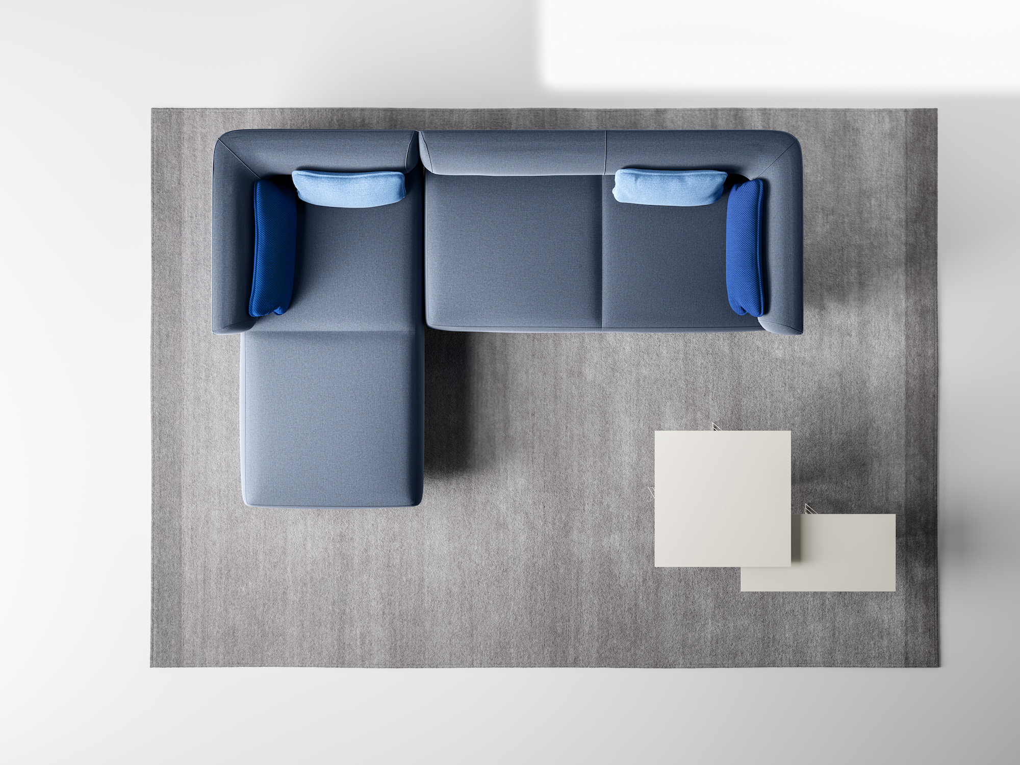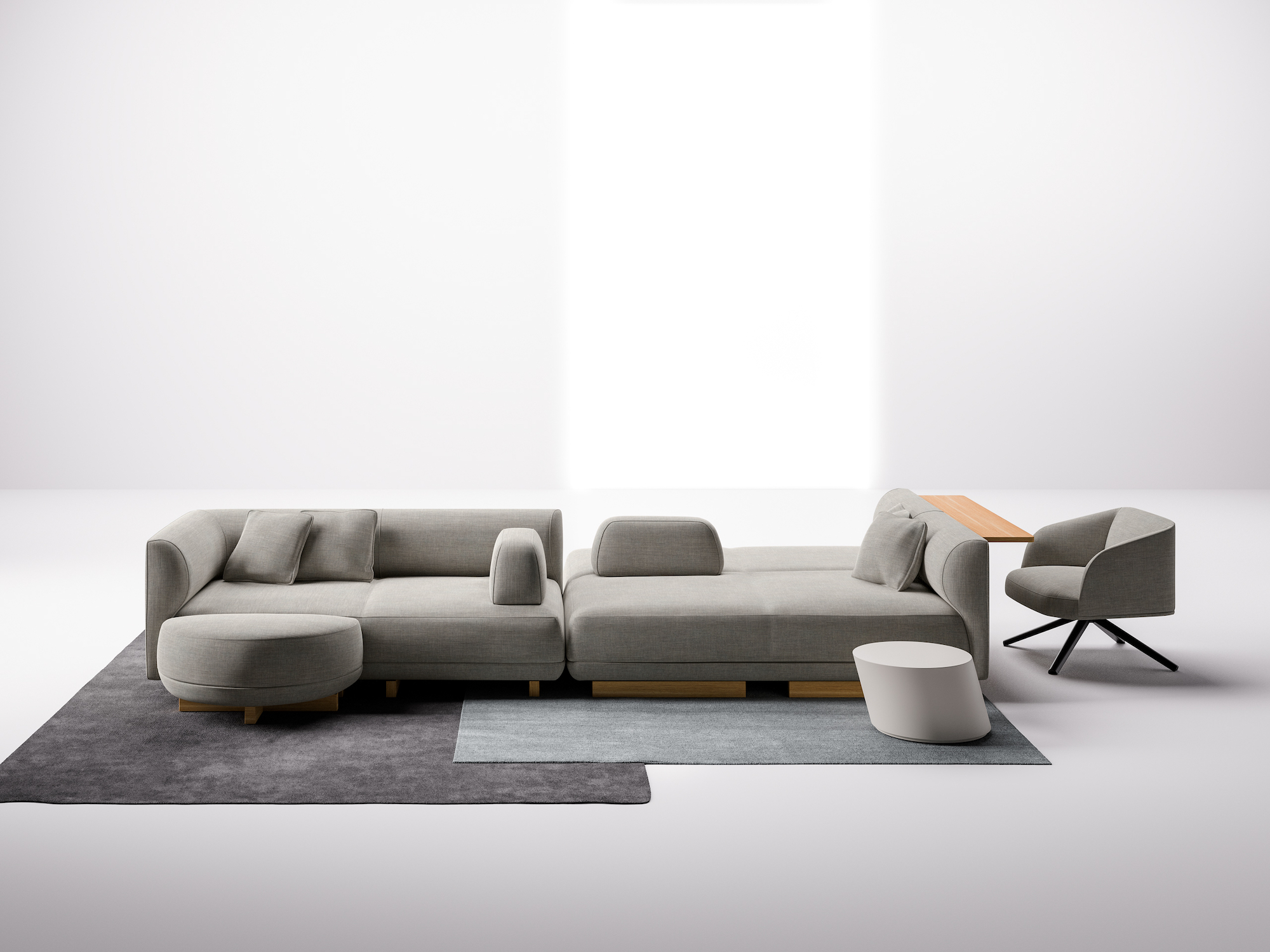 Padded pieces, available in a range of shapes and sizes form the cornerstone of the collection. They can be placed together in endless arrangements, satisfying the needs of living rooms and public spaces. Seclusion and protection are provided by the dividing panels, armrests, backrests and cushions that can be fixed or positioned freely.