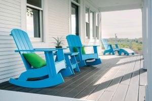 The Adirondack collection includes a 3 or 4 slat lounge chair and rocker, both available in 2 different back rest heights and with options of a flat or curved back. A matching ottoman and side table are also available.
