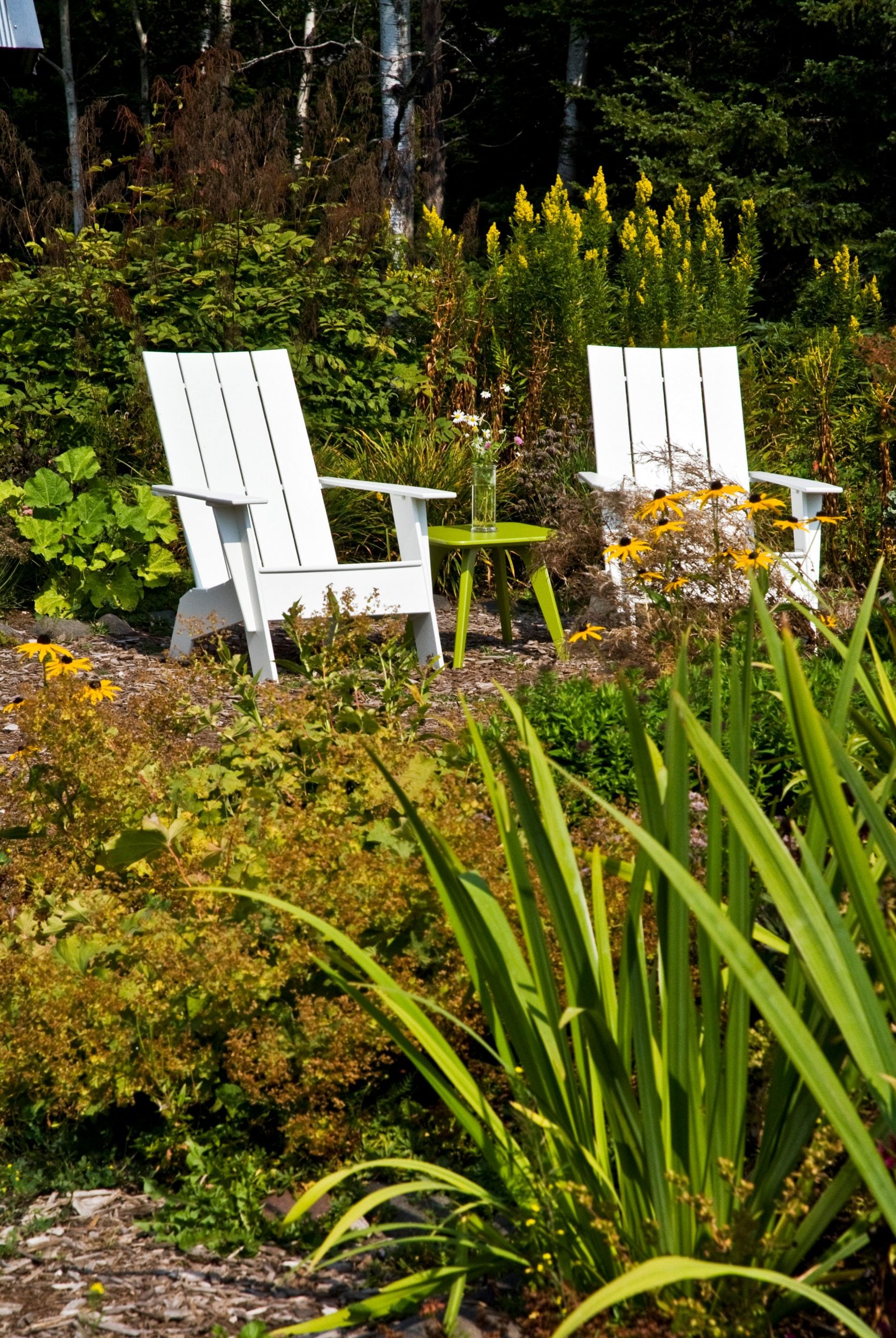 The Adirondack collection includes a 3 or 4 slat lounge chair and rocker, both available in 2 different back rest heights and with options of a flat or curved back. A matching ottoman and side table are also available.