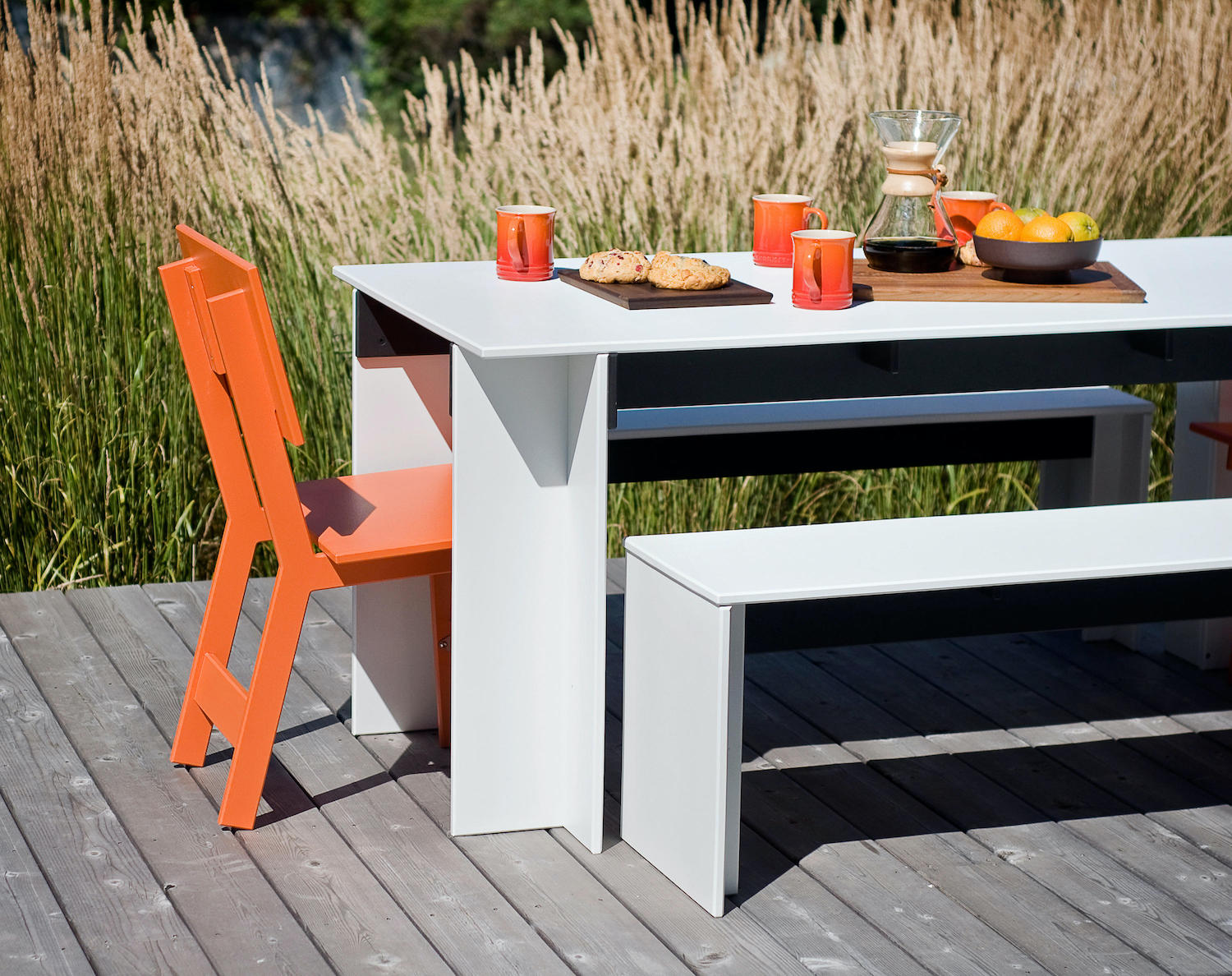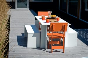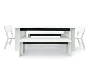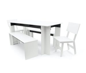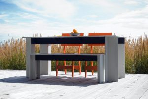 Part of the Salmela Collection, this modern bench was designed by Duluth architect David Salmela. The Hall Outdoor Bench is a clean and sculptural take on outdoor seating. A black Richlite frame beneath the table adds structure and contrast. The Hall Outdoor Dining Table or the Emin Outdoor Dining Chair are designed as a complement to the table’s clean geometric form.